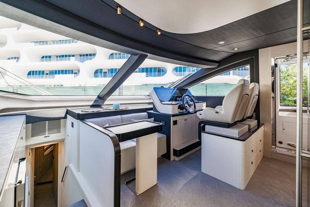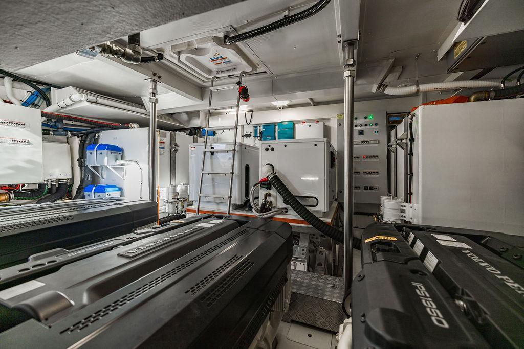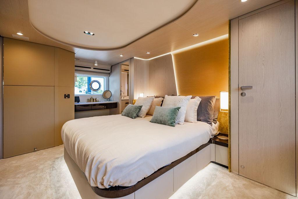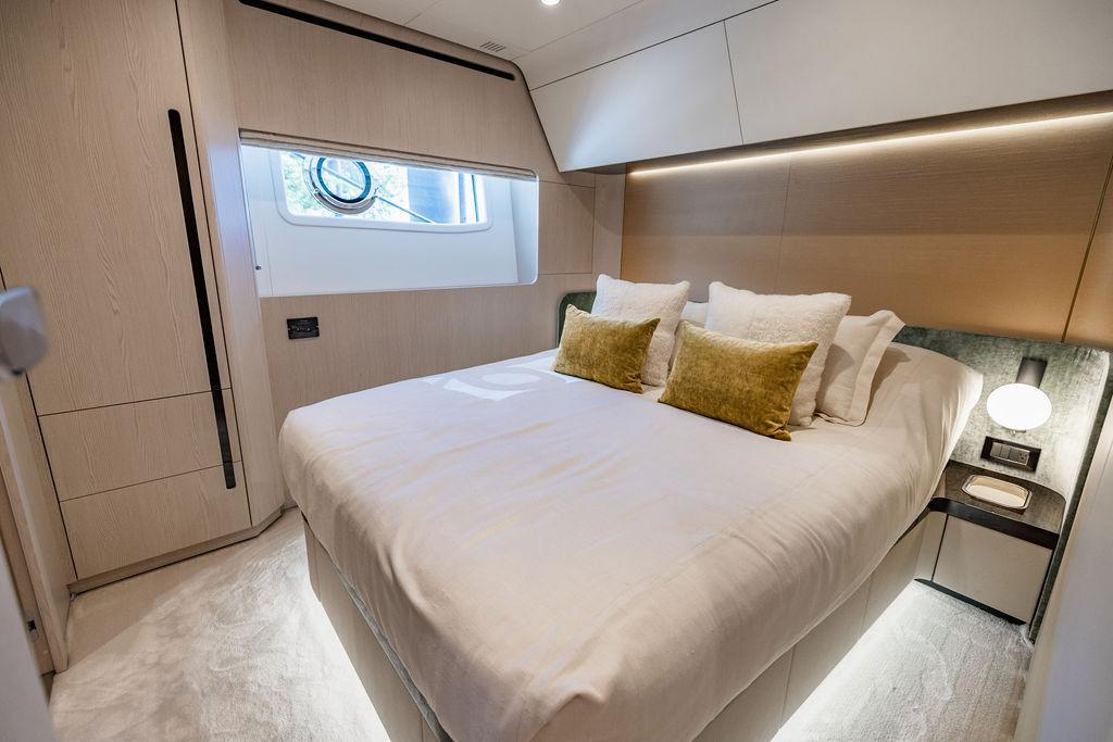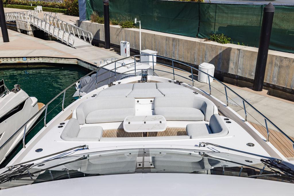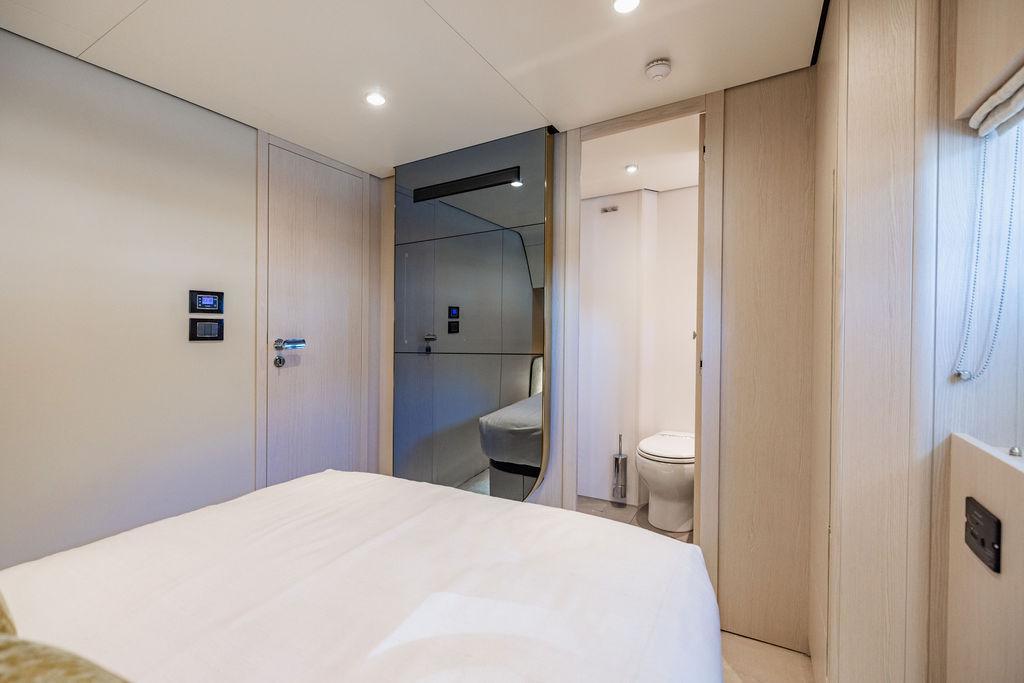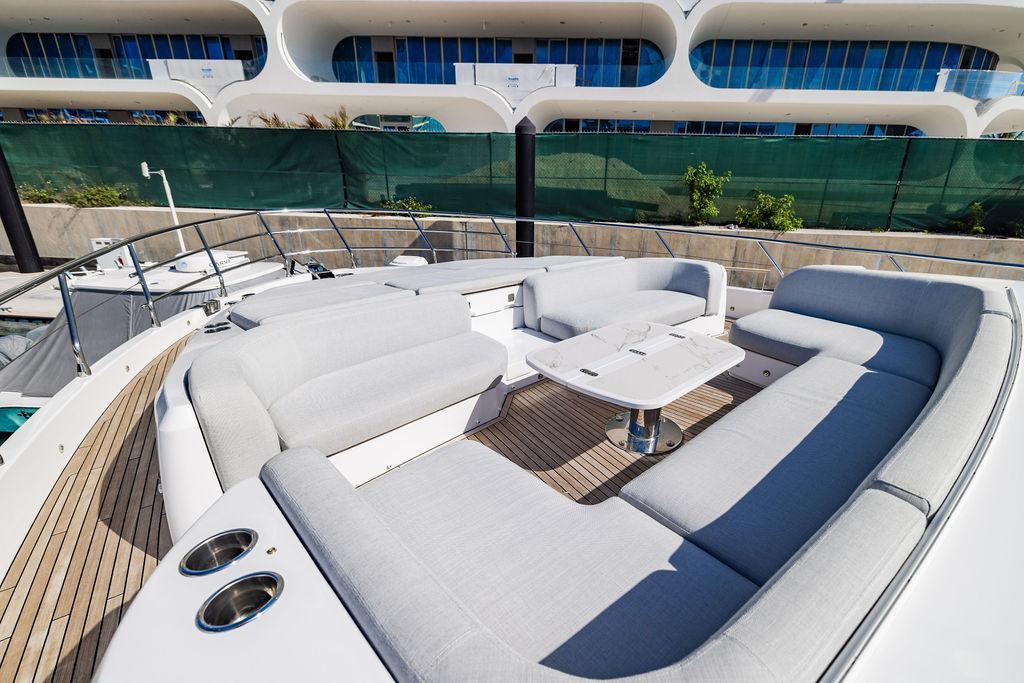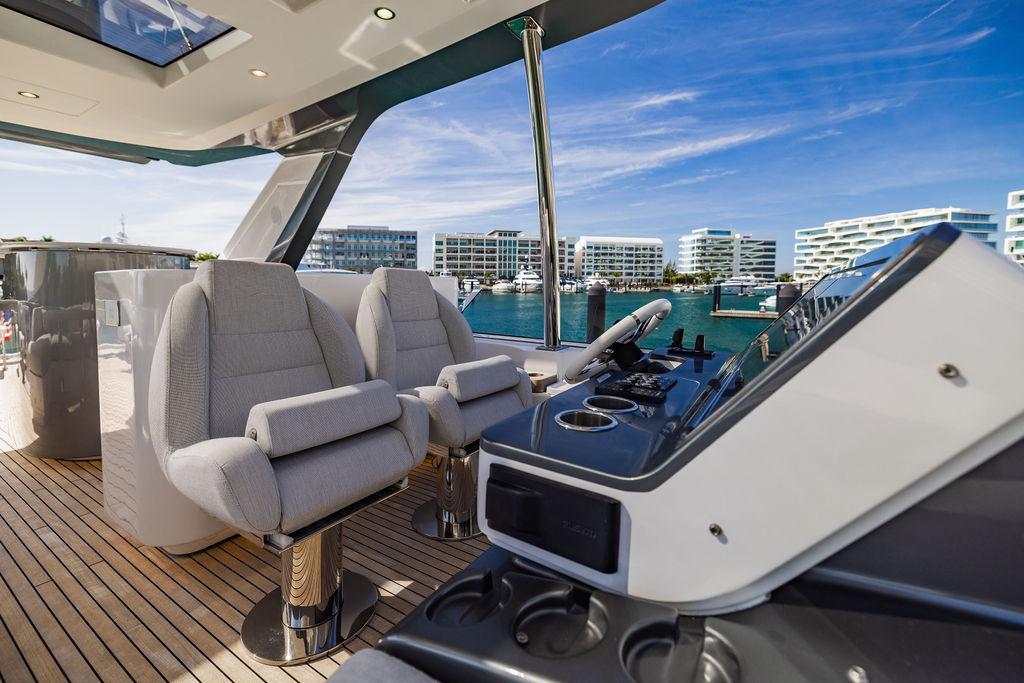 Through impeccable spatial solutions, the Fly 78 mimics the ambience of a larger yacht without compromising the sportive agility of smaller vessels. Secluded quarters eclipse behind-the-scenes service happenings, in the first ever boat in its category to organize completely partitioned areas for the galley and crew. A fluid and original onboard culture for the guests, elated by space blissand sheer sophistication.Revel in the atmosphere of the Fly 78, without compromise.Advance package :Black Water Tank Washing System, Dècor Upgrade Extra conduits,Grey Water Tank Washing System,,Miele appliances (upgrade for oven and cooktop), Watermaker predisposition (salt water - fresh water - electrical) OPTIONALS MAIN SYSTEM: 3 x VOLVO IPS 1350 (1000 hp) upgrade, Air Purification System Clearline, air conditioning raw water purification system, Cockpit docking station and bow thruster, (including engines control joystick and thruster control), Dynamic positioning system - Skyhook, Seakeeper Stabilizer 26 EXTERIOR: Bow sun shade with removable carbon fiber poles for sunbathing area and sitting area, Bow table with corian frame and synthetic marble insert, Cockpit awning (automatic), Cockpit Chair (mod. Oskar), Cockpit furniture with corian frame and synthetic marble insert top, Co-pilot seat on fly, Dimmer lights on fly, Electric awning for aft flybridge (requires hard top), Electric searchlight upgrade to ACR Flagpole, Flybridge hatch, Hard top (painted in Etna Grey), Lounge furniture on aft fly with two love seats in Batyline fabric (A000127336) and two coffee tables with corian frame and synthetic marble insert, Luxury lighting package for exteriors, Painted boot stripe, Painted flybridge furniture (frontal panel) in Grigio Savoia, Manouvering lights on bow (nr.2), Teak on flybridge deck, Telescopic gangway, Nr. 2 exterior teak stools for flybridge bar, Spreader lights on aft fly, Synthetic marble insert for the lower part of the flybridge bar furniture top, Underwater lights under sponsons (2X2) and transom (3) Oceanled S3124S, Upgraded standard exterior cushions in Batyline fabric (A000127336), Upgraded standard exterior teak tables and tops in corian frame with syntetic marble insert tops, Watertight hand control for anchor winch.INTERIOR: Co-pilot seat in main helm, Forward salon sofa (lounge version), Additional storage cabinet in vip cabin designed by Achille Salvagni, Black-out system for master cabin curtains, Carpet Besana Royal 43 Divina Icelandic in lower deck, Dividing wall with door in crew cabin, Domotic lighting system in salon, Dresser in master cabin with settee in lieu of standard sofa on port side, Electric roman blinds with integrated blackout system in salon (in lieu of standard manual roman blinds), Gentas Cement floor for galley and main helm, Heads floor in Gentash Cement 26 (in lieu of standard teak floors), Lacquered bronze color inserts on forward salon bulkhead (in lieu of standard white lacquered inserts), Master head shower wall in Quartzite Statuario (in lieu of standard laminate with slate finishing), Mosquito net for portholes Roman blinds in master cabin (in lieu of standard venetian blinds), Roman blinds with integrated blackout system in vip and guest cabins (in lieu of standard venetian blinds), Safe in crew cabin Safe in master cabin Scenic lights for interior, Set of linens for cabins (crew cabin not included), Set of linens for crew cabin (standard configuration), Set of linens for third bed in crew cabin, Set of towels for one person with Azimut logo, Third bed in crew cabin, Toilet with bidet faucet feature in master head Wooden floor in main deckAPPLIANCES: Barbecue for flybridge furniture, Dishwasher Icemaker on fly Refrigerator and icemaker for cockpit furniture, Washer and dryer in crew cabin (2 units), Winecooler in galleyELECTRONICS: Garmin AIS 800 Garmin videocameras (nr.3), Raymarine Flir M364-C thermal camera, Volvo Glass Platinum packageVIDEO - TV - HI-FI Audio/Video Package (with SAT TV Antenna KVH Tracvision HD7 and Decoders) (hi-lo system for TV in salon included), Flybridge furniture with 43'' TV and lift with decoders and antennaEXTRAS; SMALLER HI-LO TABLE IN SALON TO BE ALIGNED TO THE AFT SIDE OF THE SOFA, IN ONE SINGLE FINISHING: BRUSHED OAK GRAY 10 GLOSS SALON COFFEE TABLE IN LEATHER A000120541 IN LIEU OF STD. LEATHER A000139335