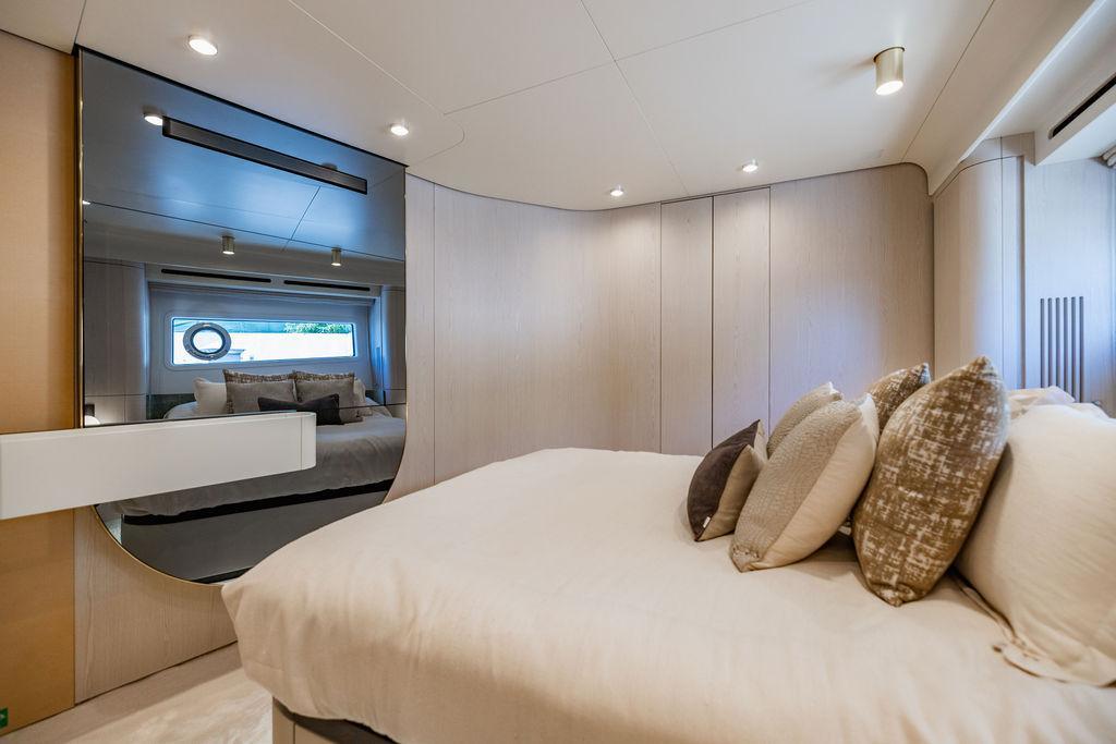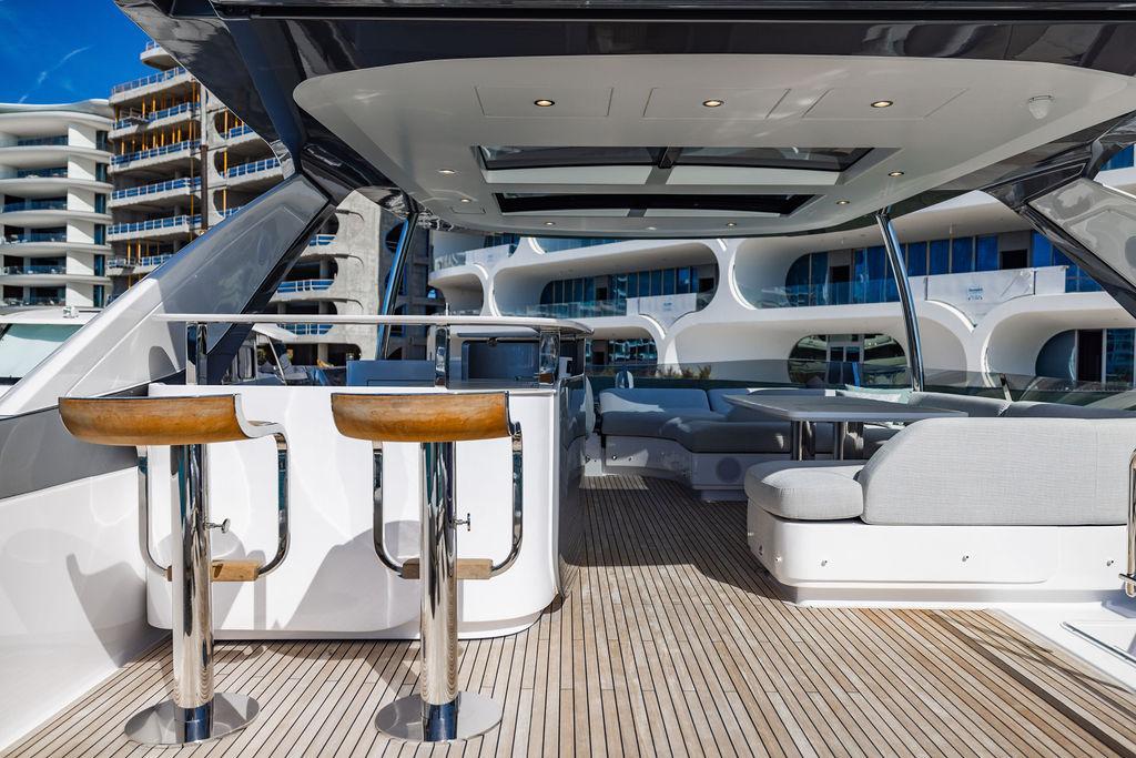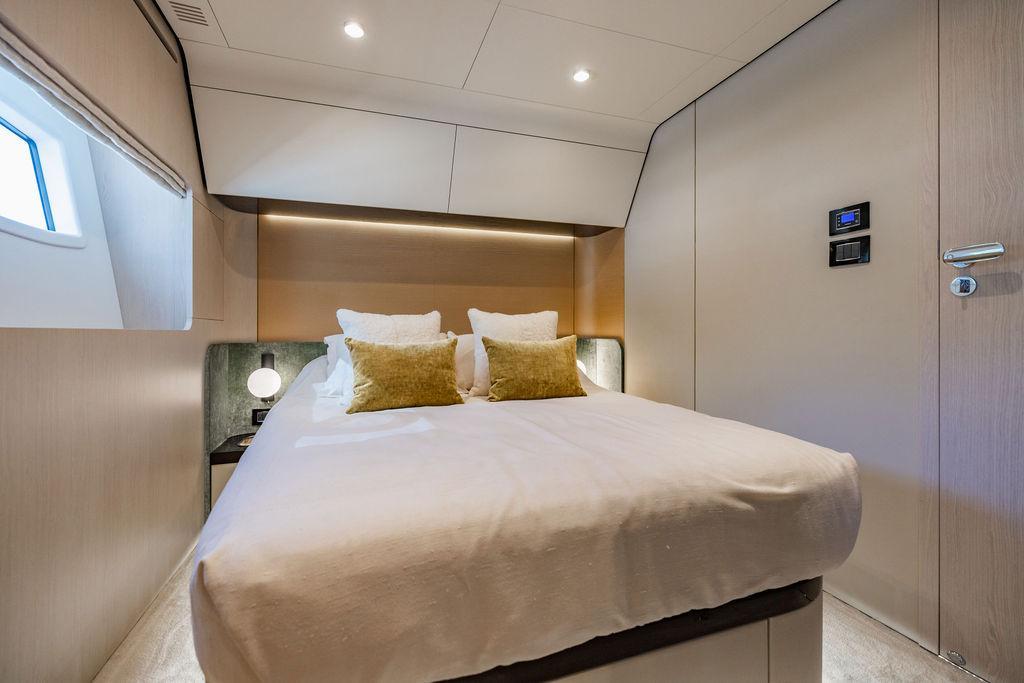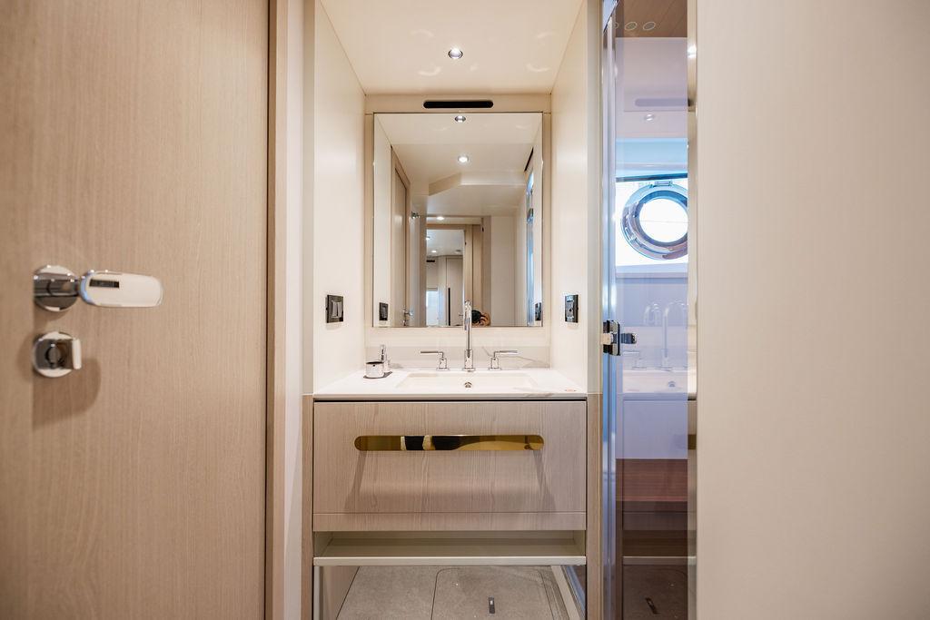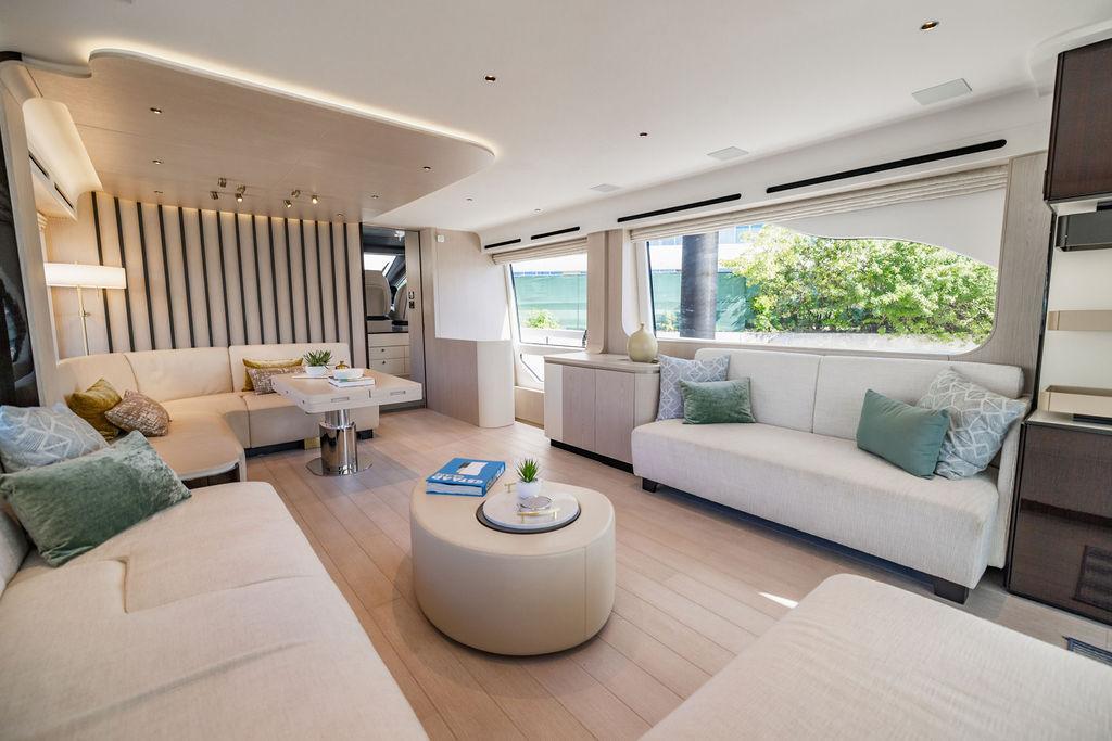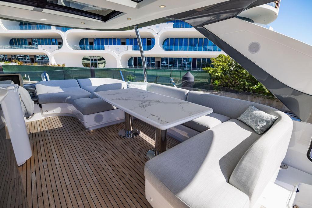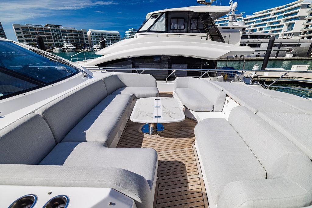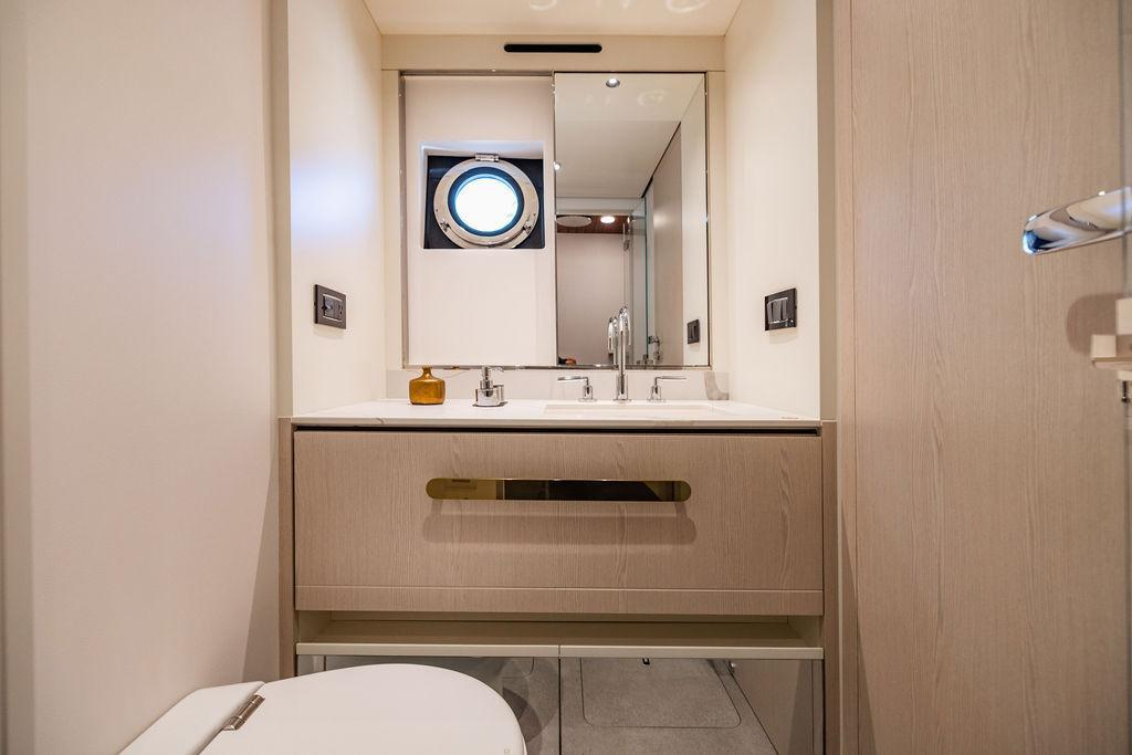 Through impeccable spatial solutions, the Fly 78 mimics the ambience of a larger yacht without compromising the sportive agility of smaller vessels. Secluded quarters eclipse behind-the-scenes service happenings, in the first ever boat in its category to organize completely partitioned areas for the galley and crew. A fluid and original onboard culture for the guests, elated by space blissand sheer sophistication.Revel in the atmosphere of the Fly 78, without compromise.Advance package :Black Water Tank Washing System, Dècor Upgrade Extra conduits,Grey Water Tank Washing System,,Miele appliances (upgrade for oven and cooktop), Watermaker predisposition (salt water - fresh water - electrical) OPTIONALS MAIN SYSTEM: 3 x VOLVO IPS 1350 (1000 hp) upgrade, Air Purification System Clearline, air conditioning raw water purification system, Cockpit docking station and bow thruster, (including engines control joystick and thruster control), Dynamic positioning system - Skyhook, Seakeeper Stabilizer 26 EXTERIOR: Bow sun shade with removable carbon fiber poles for sunbathing area and sitting area, Bow table with corian frame and synthetic marble insert, Cockpit awning (automatic), Cockpit Chair (mod. Oskar), Cockpit furniture with corian frame and synthetic marble insert top, Co-pilot seat on fly, Dimmer lights on fly, Electric awning for aft flybridge (requires hard top), Electric searchlight upgrade to ACR Flagpole, Flybridge hatch, Hard top (painted in Etna Grey), Lounge furniture on aft fly with two love seats in Batyline fabric (A000127336) and two coffee tables with corian frame and synthetic marble insert, Luxury lighting package for exteriors, Painted boot stripe, Painted flybridge furniture (frontal panel) in Grigio Savoia, Manouvering lights on bow (nr.2), Teak on flybridge deck, Telescopic gangway, Nr. 2 exterior teak stools for flybridge bar, Spreader lights on aft fly, Synthetic marble insert for the lower part of the flybridge bar furniture top, Underwater lights under sponsons (2X2) and transom (3) Oceanled S3124S, Upgraded standard exterior cushions in Batyline fabric (A000127336), Upgraded standard exterior teak tables and tops in corian frame with syntetic marble insert tops, Watertight hand control for anchor winch.INTERIOR: Co-pilot seat in main helm, Forward salon sofa (lounge version), Additional storage cabinet in vip cabin designed by Achille Salvagni, Black-out system for master cabin curtains, Carpet Besana Royal 43 Divina Icelandic in lower deck, Dividing wall with door in crew cabin, Domotic lighting system in salon, Dresser in master cabin with settee in lieu of standard sofa on port side, Electric roman blinds with integrated blackout system in salon (in lieu of standard manual roman blinds), Gentas Cement floor for galley and main helm, Heads floor in Gentash Cement 26 (in lieu of standard teak floors), Lacquered bronze color inserts on forward salon bulkhead (in lieu of standard white lacquered inserts), Master head shower wall in Quartzite Statuario (in lieu of standard laminate with slate finishing), Mosquito net for portholes Roman blinds in master cabin (in lieu of standard venetian blinds), Roman blinds with integrated blackout system in vip and guest cabins (in lieu of standard venetian blinds), Safe in crew cabin Safe in master cabin Scenic lights for interior, Set of linens for cabins (crew cabin not included), Set of linens for crew cabin (standard configuration), Set of linens for third bed in crew cabin, Set of towels for one person with Azimut logo, Third bed in crew cabin, Toilet with bidet faucet feature in master head Wooden floor in main deckAPPLIANCES: Barbecue for flybridge furniture, Dishwasher Icemaker on fly Refrigerator and icemaker for cockpit furniture, Washer and dryer in crew cabin (2 units), Winecooler in galleyELECTRONICS: Garmin AIS 800 Garmin videocameras (nr.3), Raymarine Flir M364-C thermal camera, Volvo Glass Platinum packageVIDEO - TV - HI-FI Audio/Video Package (with SAT TV Antenna KVH Tracvision HD7 and Decoders) (hi-lo system for TV in salon included), Flybridge furniture with 43'' TV and lift with decoders and antennaEXTRAS; SMALLER HI-LO TABLE IN SALON TO BE ALIGNED TO THE AFT SIDE OF THE SOFA, IN ONE SINGLE FINISHING: BRUSHED OAK GRAY 10 GLOSS SALON COFFEE TABLE IN LEATHER A000120541 IN LIEU OF STD. LEATHER A000139335