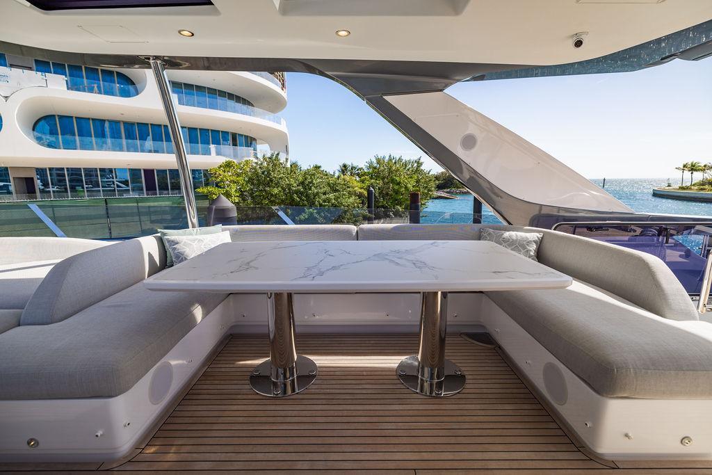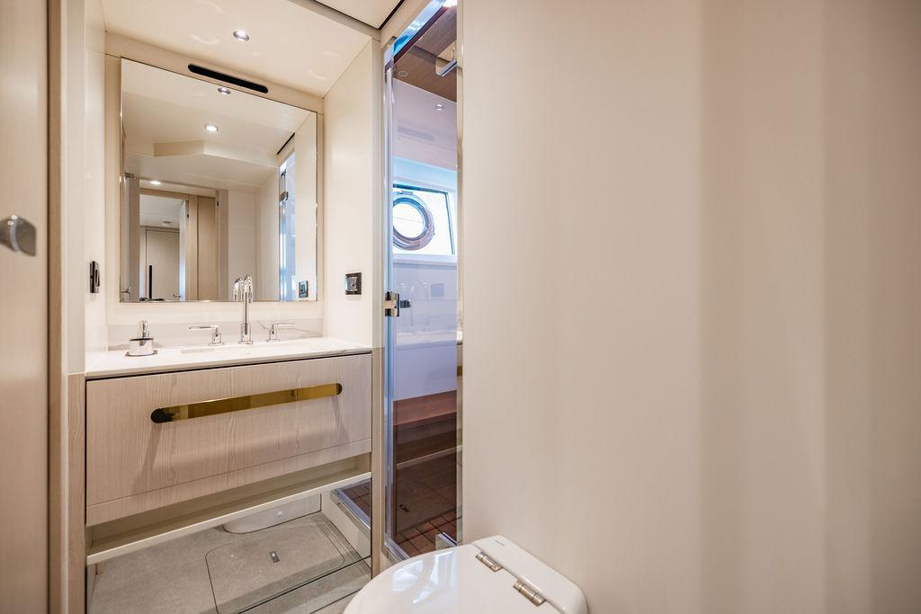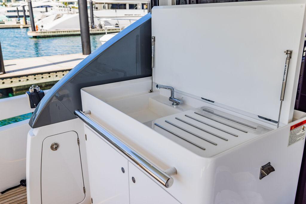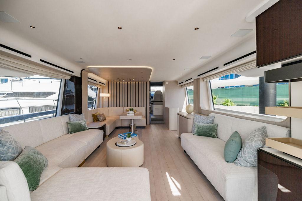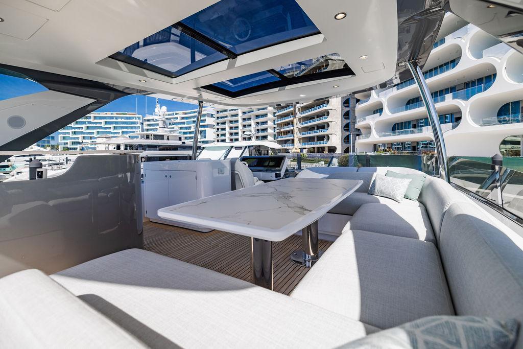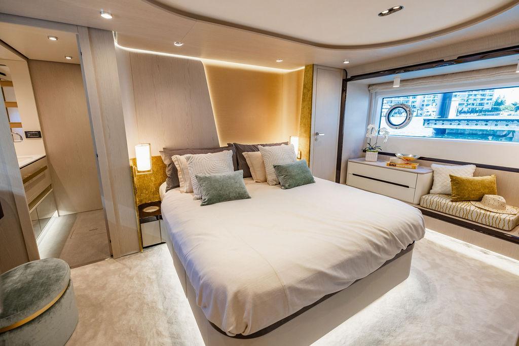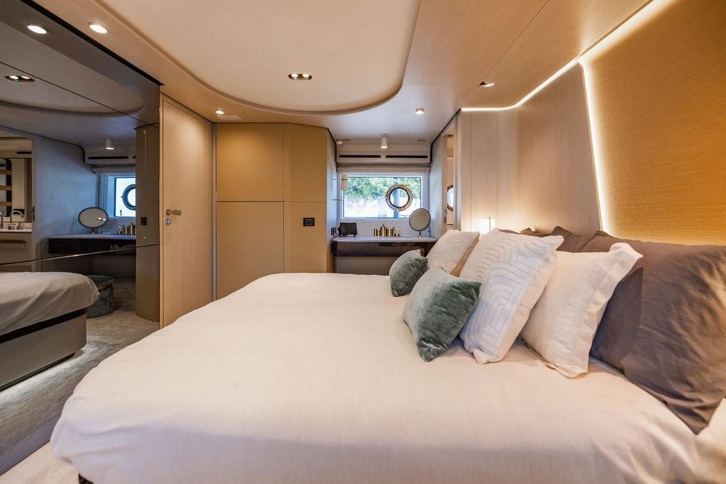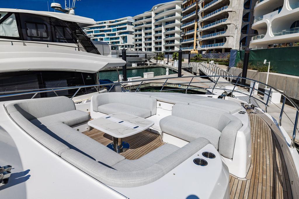 Through impeccable spatial solutions, the Fly 78 mimics the ambience of a larger yacht without compromising the sportive agility of smaller vessels. Secluded quarters eclipse behind-the-scenes service happenings, in the first ever boat in its category to organize completely partitioned areas for the galley and crew. A fluid and original onboard culture for the guests, elated by space blissand sheer sophistication.Revel in the atmosphere of the Fly 78, without compromise.Advance package :Black Water Tank Washing System, Dècor Upgrade Extra conduits,Grey Water Tank Washing System,,Miele appliances (upgrade for oven and cooktop), Watermaker predisposition (salt water - fresh water - electrical) OPTIONALS MAIN SYSTEM: 3 x VOLVO IPS 1350 (1000 hp) upgrade, Air Purification System Clearline, air conditioning raw water purification system, Cockpit docking station and bow thruster, (including engines control joystick and thruster control), Dynamic positioning system - Skyhook, Seakeeper Stabilizer 26 EXTERIOR: Bow sun shade with removable carbon fiber poles for sunbathing area and sitting area, Bow table with corian frame and synthetic marble insert, Cockpit awning (automatic), Cockpit Chair (mod. Oskar), Cockpit furniture with corian frame and synthetic marble insert top, Co-pilot seat on fly, Dimmer lights on fly, Electric awning for aft flybridge (requires hard top), Electric searchlight upgrade to ACR Flagpole, Flybridge hatch, Hard top (painted in Etna Grey), Lounge furniture on aft fly with two love seats in Batyline fabric (A000127336) and two coffee tables with corian frame and synthetic marble insert, Luxury lighting package for exteriors, Painted boot stripe, Painted flybridge furniture (frontal panel) in Grigio Savoia, Manouvering lights on bow (nr.2), Teak on flybridge deck, Telescopic gangway, Nr. 2 exterior teak stools for flybridge bar, Spreader lights on aft fly, Synthetic marble insert for the lower part of the flybridge bar furniture top, Underwater lights under sponsons (2X2) and transom (3) Oceanled S3124S, Upgraded standard exterior cushions in Batyline fabric (A000127336), Upgraded standard exterior teak tables and tops in corian frame with syntetic marble insert tops, Watertight hand control for anchor winch.INTERIOR: Co-pilot seat in main helm, Forward salon sofa (lounge version), Additional storage cabinet in vip cabin designed by Achille Salvagni, Black-out system for master cabin curtains, Carpet Besana Royal 43 Divina Icelandic in lower deck, Dividing wall with door in crew cabin, Domotic lighting system in salon, Dresser in master cabin with settee in lieu of standard sofa on port side, Electric roman blinds with integrated blackout system in salon (in lieu of standard manual roman blinds), Gentas Cement floor for galley and main helm, Heads floor in Gentash Cement 26 (in lieu of standard teak floors), Lacquered bronze color inserts on forward salon bulkhead (in lieu of standard white lacquered inserts), Master head shower wall in Quartzite Statuario (in lieu of standard laminate with slate finishing), Mosquito net for portholes Roman blinds in master cabin (in lieu of standard venetian blinds), Roman blinds with integrated blackout system in vip and guest cabins (in lieu of standard venetian blinds), Safe in crew cabin Safe in master cabin Scenic lights for interior, Set of linens for cabins (crew cabin not included), Set of linens for crew cabin (standard configuration), Set of linens for third bed in crew cabin, Set of towels for one person with Azimut logo, Third bed in crew cabin, Toilet with bidet faucet feature in master head Wooden floor in main deckAPPLIANCES: Barbecue for flybridge furniture, Dishwasher Icemaker on fly Refrigerator and icemaker for cockpit furniture, Washer and dryer in crew cabin (2 units), Winecooler in galleyELECTRONICS: Garmin AIS 800 Garmin videocameras (nr.3), Raymarine Flir M364-C thermal camera, Volvo Glass Platinum packageVIDEO - TV - HI-FI Audio/Video Package (with SAT TV Antenna KVH Tracvision HD7 and Decoders) (hi-lo system for TV in salon included), Flybridge furniture with 43'' TV and lift with decoders and antennaEXTRAS; SMALLER HI-LO TABLE IN SALON TO BE ALIGNED TO THE AFT SIDE OF THE SOFA, IN ONE SINGLE FINISHING: BRUSHED OAK GRAY 10 GLOSS SALON COFFEE TABLE IN LEATHER A000120541 IN LIEU OF STD. LEATHER A000139335