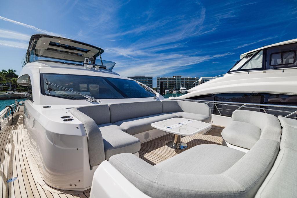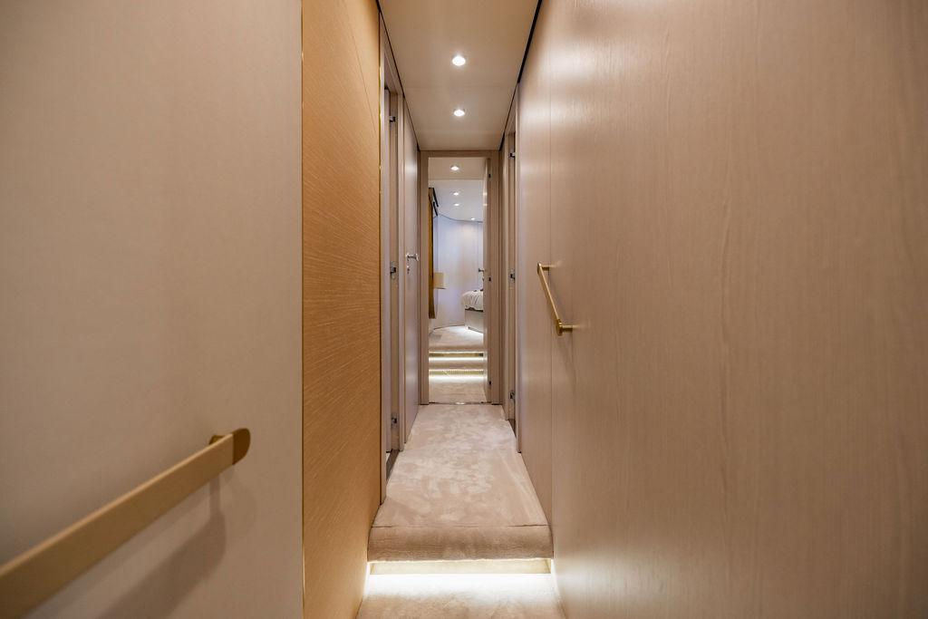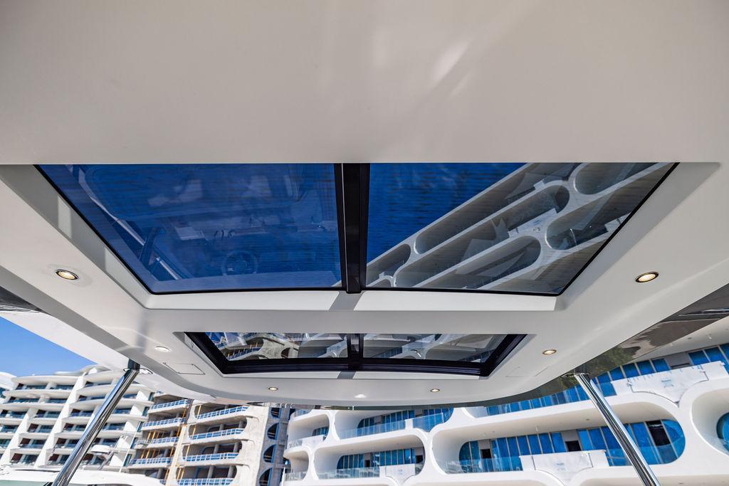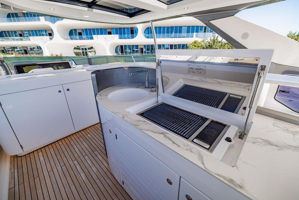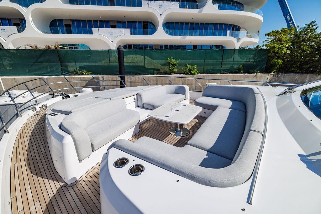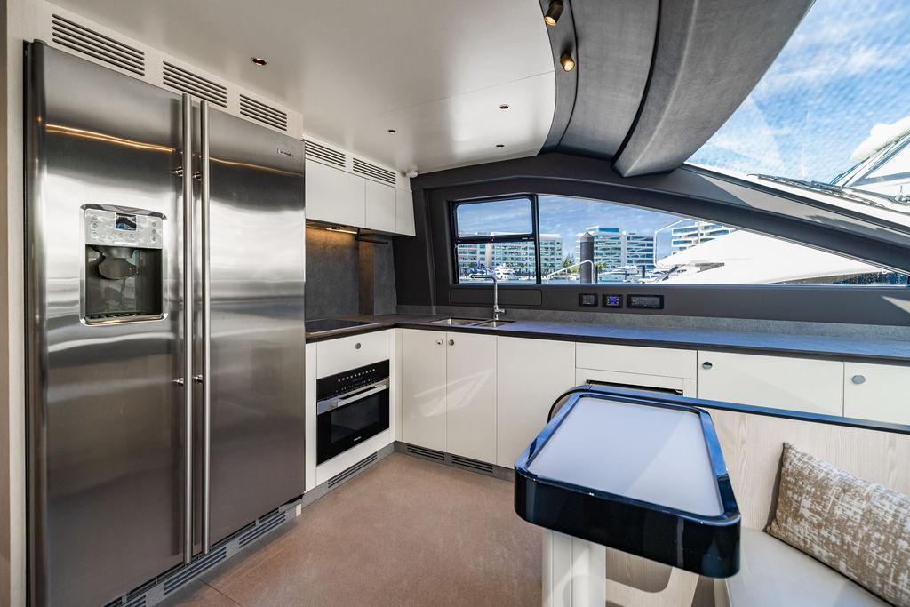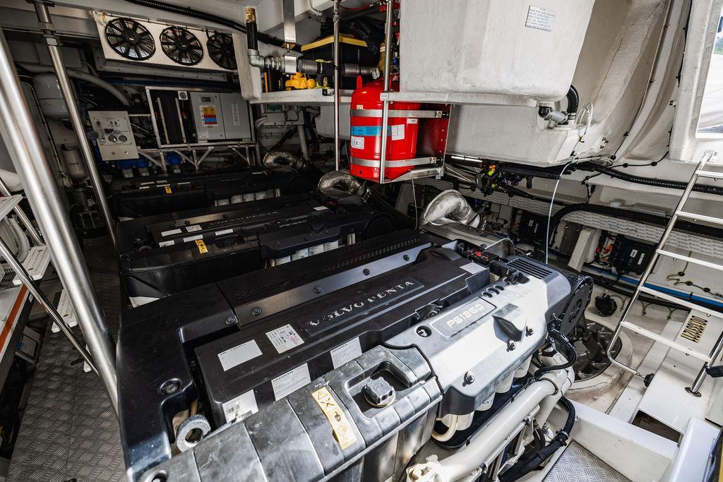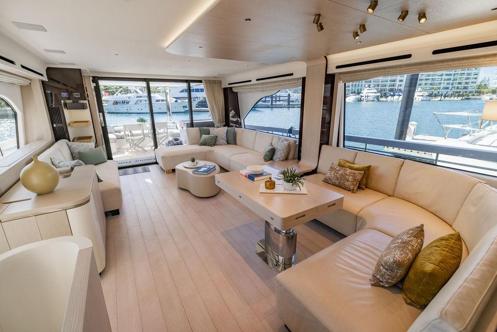 Through impeccable spatial solutions, the Fly 78 mimics the ambience of a larger yacht without compromising the sportive agility of smaller vessels. Secluded quarters eclipse behind-the-scenes service happenings, in the first ever boat in its category to organize completely partitioned areas for the galley and crew. A fluid and original onboard culture for the guests, elated by space blissand sheer sophistication.Revel in the atmosphere of the Fly 78, without compromise.Advance package :Black Water Tank Washing System, Dècor Upgrade Extra conduits,Grey Water Tank Washing System,,Miele appliances (upgrade for oven and cooktop), Watermaker predisposition (salt water - fresh water - electrical) OPTIONALS MAIN SYSTEM: 3 x VOLVO IPS 1350 (1000 hp) upgrade, Air Purification System Clearline, air conditioning raw water purification system, Cockpit docking station and bow thruster, (including engines control joystick and thruster control), Dynamic positioning system - Skyhook, Seakeeper Stabilizer 26 EXTERIOR: Bow sun shade with removable carbon fiber poles for sunbathing area and sitting area, Bow table with corian frame and synthetic marble insert, Cockpit awning (automatic), Cockpit Chair (mod. Oskar), Cockpit furniture with corian frame and synthetic marble insert top, Co-pilot seat on fly, Dimmer lights on fly, Electric awning for aft flybridge (requires hard top), Electric searchlight upgrade to ACR Flagpole, Flybridge hatch, Hard top (painted in Etna Grey), Lounge furniture on aft fly with two love seats in Batyline fabric (A000127336) and two coffee tables with corian frame and synthetic marble insert, Luxury lighting package for exteriors, Painted boot stripe, Painted flybridge furniture (frontal panel) in Grigio Savoia, Manouvering lights on bow (nr.2), Teak on flybridge deck, Telescopic gangway, Nr. 2 exterior teak stools for flybridge bar, Spreader lights on aft fly, Synthetic marble insert for the lower part of the flybridge bar furniture top, Underwater lights under sponsons (2X2) and transom (3) Oceanled S3124S, Upgraded standard exterior cushions in Batyline fabric (A000127336), Upgraded standard exterior teak tables and tops in corian frame with syntetic marble insert tops, Watertight hand control for anchor winch.INTERIOR: Co-pilot seat in main helm, Forward salon sofa (lounge version), Additional storage cabinet in vip cabin designed by Achille Salvagni, Black-out system for master cabin curtains, Carpet Besana Royal 43 Divina Icelandic in lower deck, Dividing wall with door in crew cabin, Domotic lighting system in salon, Dresser in master cabin with settee in lieu of standard sofa on port side, Electric roman blinds with integrated blackout system in salon (in lieu of standard manual roman blinds), Gentas Cement floor for galley and main helm, Heads floor in Gentash Cement 26 (in lieu of standard teak floors), Lacquered bronze color inserts on forward salon bulkhead (in lieu of standard white lacquered inserts), Master head shower wall in Quartzite Statuario (in lieu of standard laminate with slate finishing), Mosquito net for portholes Roman blinds in master cabin (in lieu of standard venetian blinds), Roman blinds with integrated blackout system in vip and guest cabins (in lieu of standard venetian blinds), Safe in crew cabin Safe in master cabin Scenic lights for interior, Set of linens for cabins (crew cabin not included), Set of linens for crew cabin (standard configuration), Set of linens for third bed in crew cabin, Set of towels for one person with Azimut logo, Third bed in crew cabin, Toilet with bidet faucet feature in master head Wooden floor in main deckAPPLIANCES: Barbecue for flybridge furniture, Dishwasher Icemaker on fly Refrigerator and icemaker for cockpit furniture, Washer and dryer in crew cabin (2 units), Winecooler in galleyELECTRONICS: Garmin AIS 800 Garmin videocameras (nr.3), Raymarine Flir M364-C thermal camera, Volvo Glass Platinum packageVIDEO - TV - HI-FI Audio/Video Package (with SAT TV Antenna KVH Tracvision HD7 and Decoders) (hi-lo system for TV in salon included), Flybridge furniture with 43'' TV and lift with decoders and antennaEXTRAS; SMALLER HI-LO TABLE IN SALON TO BE ALIGNED TO THE AFT SIDE OF THE SOFA, IN ONE SINGLE FINISHING: BRUSHED OAK GRAY 10 GLOSS SALON COFFEE TABLE IN LEATHER A000120541 IN LIEU OF STD. LEATHER A000139335