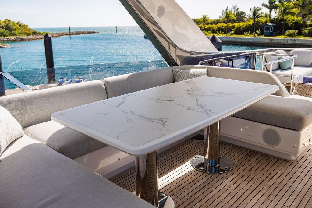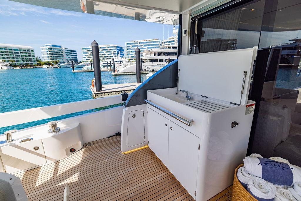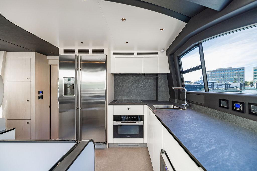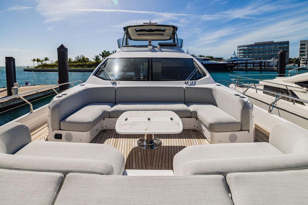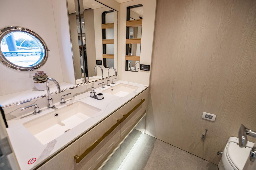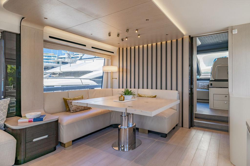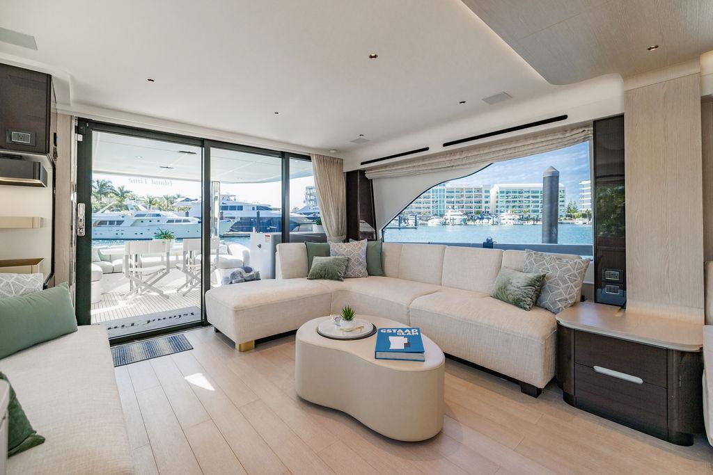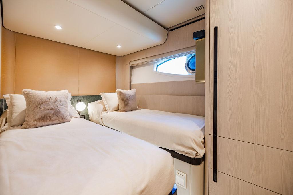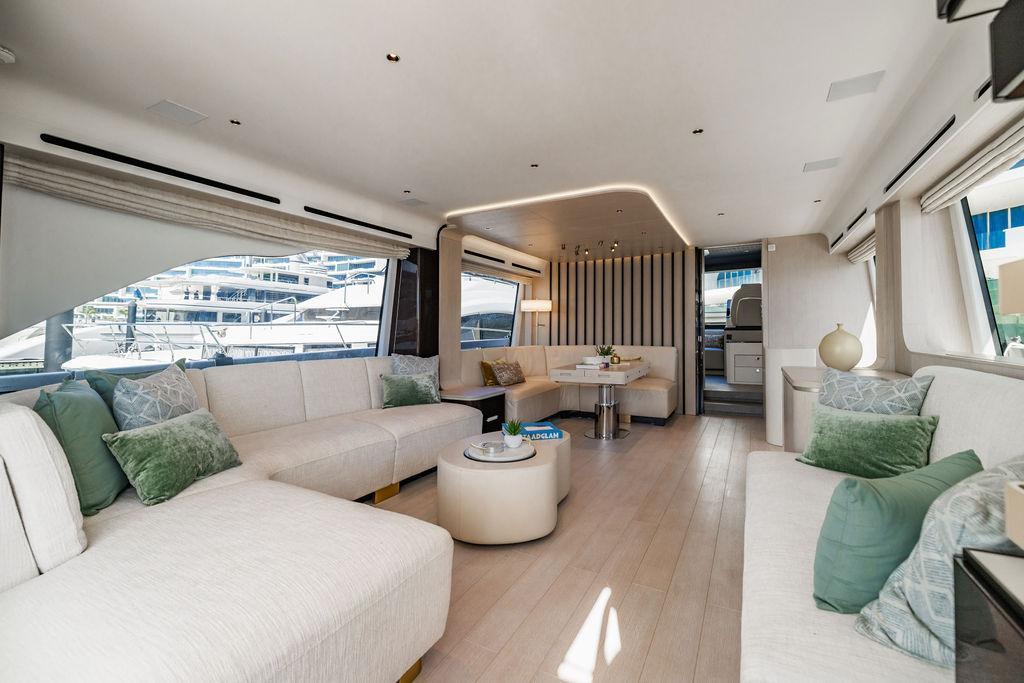 Through impeccable spatial solutions, the Fly 78 mimics the ambience of a larger yacht without compromising the sportive agility of smaller vessels. Secluded quarters eclipse behind-the-scenes service happenings, in the first ever boat in its category to organize completely partitioned areas for the galley and crew. A fluid and original onboard culture for the guests, elated by space blissand sheer sophistication.Revel in the atmosphere of the Fly 78, without compromise.Advance package :Black Water Tank Washing System, Dècor Upgrade Extra conduits,Grey Water Tank Washing System,,Miele appliances (upgrade for oven and cooktop), Watermaker predisposition (salt water - fresh water - electrical) OPTIONALS MAIN SYSTEM: 3 x VOLVO IPS 1350 (1000 hp) upgrade, Air Purification System Clearline, air conditioning raw water purification system, Cockpit docking station and bow thruster, (including engines control joystick and thruster control), Dynamic positioning system - Skyhook, Seakeeper Stabilizer 26 EXTERIOR: Bow sun shade with removable carbon fiber poles for sunbathing area and sitting area, Bow table with corian frame and synthetic marble insert, Cockpit awning (automatic), Cockpit Chair (mod. Oskar), Cockpit furniture with corian frame and synthetic marble insert top, Co-pilot seat on fly, Dimmer lights on fly, Electric awning for aft flybridge (requires hard top), Electric searchlight upgrade to ACR Flagpole, Flybridge hatch, Hard top (painted in Etna Grey), Lounge furniture on aft fly with two love seats in Batyline fabric (A000127336) and two coffee tables with corian frame and synthetic marble insert, Luxury lighting package for exteriors, Painted boot stripe, Painted flybridge furniture (frontal panel) in Grigio Savoia, Manouvering lights on bow (nr.2), Teak on flybridge deck, Telescopic gangway, Nr. 2 exterior teak stools for flybridge bar, Spreader lights on aft fly, Synthetic marble insert for the lower part of the flybridge bar furniture top, Underwater lights under sponsons (2X2) and transom (3) Oceanled S3124S, Upgraded standard exterior cushions in Batyline fabric (A000127336), Upgraded standard exterior teak tables and tops in corian frame with syntetic marble insert tops, Watertight hand control for anchor winch.INTERIOR: Co-pilot seat in main helm, Forward salon sofa (lounge version), Additional storage cabinet in vip cabin designed by Achille Salvagni, Black-out system for master cabin curtains, Carpet Besana Royal 43 Divina Icelandic in lower deck, Dividing wall with door in crew cabin, Domotic lighting system in salon, Dresser in master cabin with settee in lieu of standard sofa on port side, Electric roman blinds with integrated blackout system in salon (in lieu of standard manual roman blinds), Gentas Cement floor for galley and main helm, Heads floor in Gentash Cement 26 (in lieu of standard teak floors), Lacquered bronze color inserts on forward salon bulkhead (in lieu of standard white lacquered inserts), Master head shower wall in Quartzite Statuario (in lieu of standard laminate with slate finishing), Mosquito net for portholes Roman blinds in master cabin (in lieu of standard venetian blinds), Roman blinds with integrated blackout system in vip and guest cabins (in lieu of standard venetian blinds), Safe in crew cabin Safe in master cabin Scenic lights for interior, Set of linens for cabins (crew cabin not included), Set of linens for crew cabin (standard configuration), Set of linens for third bed in crew cabin, Set of towels for one person with Azimut logo, Third bed in crew cabin, Toilet with bidet faucet feature in master head Wooden floor in main deckAPPLIANCES: Barbecue for flybridge furniture, Dishwasher Icemaker on fly Refrigerator and icemaker for cockpit furniture, Washer and dryer in crew cabin (2 units), Winecooler in galleyELECTRONICS: Garmin AIS 800 Garmin videocameras (nr.3), Raymarine Flir M364-C thermal camera, Volvo Glass Platinum packageVIDEO - TV - HI-FI Audio/Video Package (with SAT TV Antenna KVH Tracvision HD7 and Decoders) (hi-lo system for TV in salon included), Flybridge furniture with 43'' TV and lift with decoders and antennaEXTRAS; SMALLER HI-LO TABLE IN SALON TO BE ALIGNED TO THE AFT SIDE OF THE SOFA, IN ONE SINGLE FINISHING: BRUSHED OAK GRAY 10 GLOSS SALON COFFEE TABLE IN LEATHER A000120541 IN LIEU OF STD. LEATHER A000139335