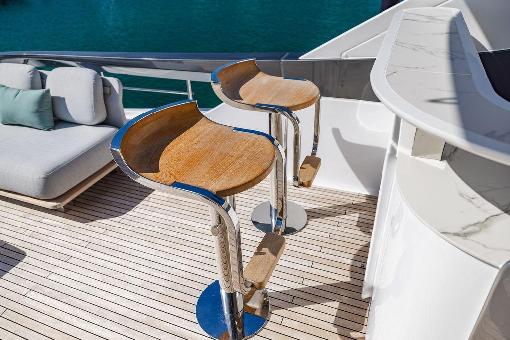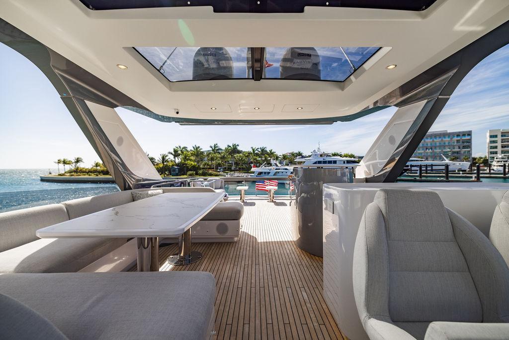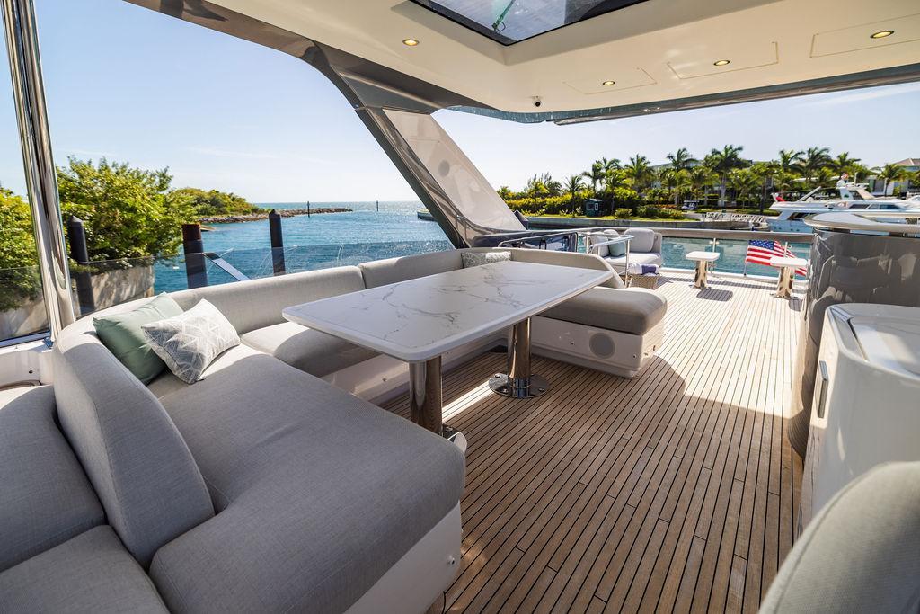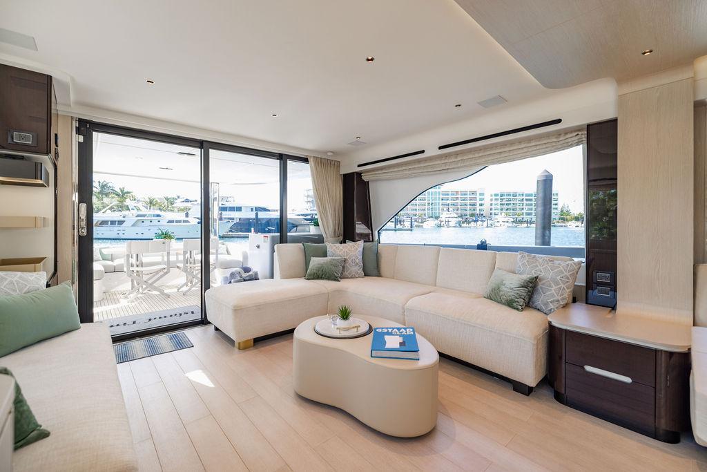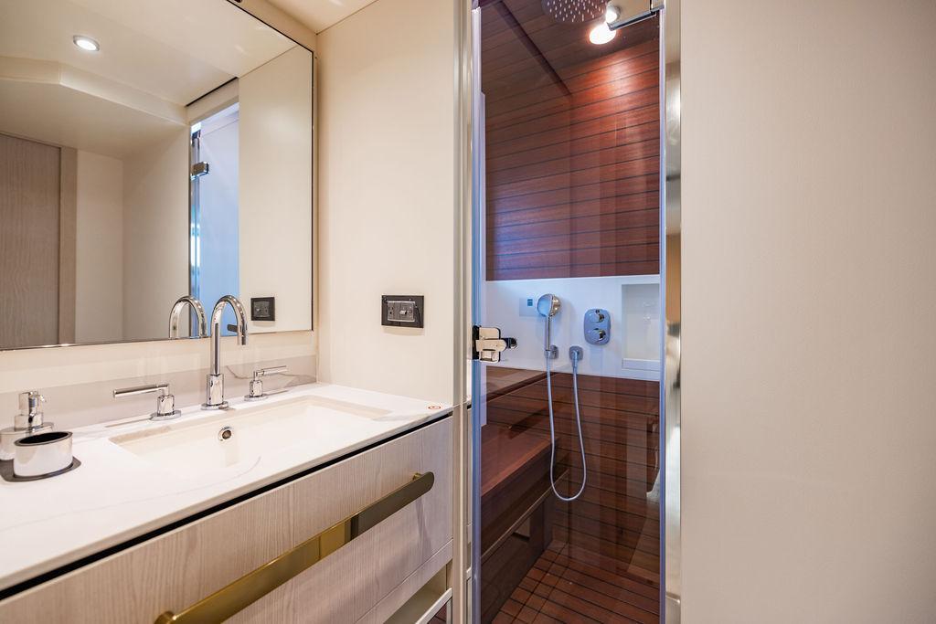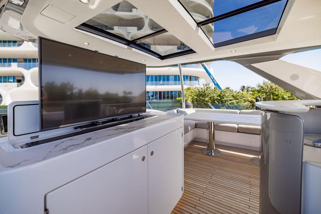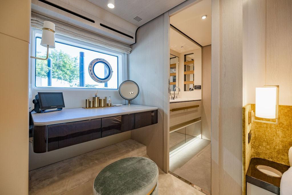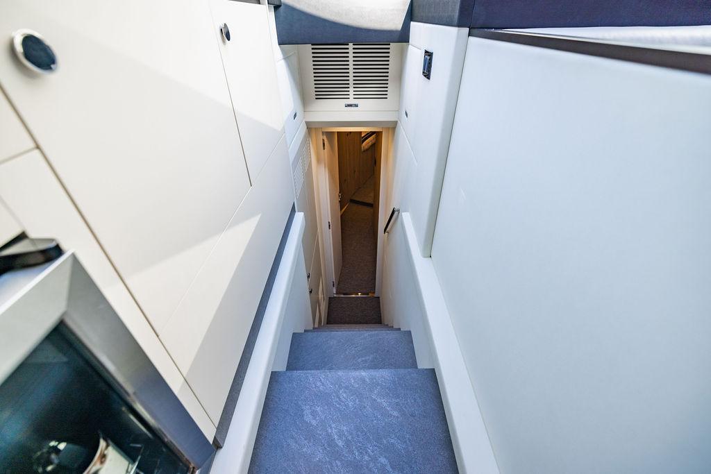 Through impeccable spatial solutions, the Fly 78 mimics the ambience of a larger yacht without compromising the sportive agility of smaller vessels. Secluded quarters eclipse behind-the-scenes service happenings, in the first ever boat in its category to organize completely partitioned areas for the galley and crew. A fluid and original onboard culture for the guests, elated by space blissand sheer sophistication.Revel in the atmosphere of the Fly 78, without compromise.Advance package :Black Water Tank Washing System, Dècor Upgrade Extra conduits,Grey Water Tank Washing System,,Miele appliances (upgrade for oven and cooktop), Watermaker predisposition (salt water - fresh water - electrical) OPTIONALS MAIN SYSTEM: 3 x VOLVO IPS 1350 (1000 hp) upgrade, Air Purification System Clearline, air conditioning raw water purification system, Cockpit docking station and bow thruster, (including engines control joystick and thruster control), Dynamic positioning system - Skyhook, Seakeeper Stabilizer 26 EXTERIOR: Bow sun shade with removable carbon fiber poles for sunbathing area and sitting area, Bow table with corian frame and synthetic marble insert, Cockpit awning (automatic), Cockpit Chair (mod. Oskar), Cockpit furniture with corian frame and synthetic marble insert top, Co-pilot seat on fly, Dimmer lights on fly, Electric awning for aft flybridge (requires hard top), Electric searchlight upgrade to ACR Flagpole, Flybridge hatch, Hard top (painted in Etna Grey), Lounge furniture on aft fly with two love seats in Batyline fabric (A000127336) and two coffee tables with corian frame and synthetic marble insert, Luxury lighting package for exteriors, Painted boot stripe, Painted flybridge furniture (frontal panel) in Grigio Savoia, Manouvering lights on bow (nr.2), Teak on flybridge deck, Telescopic gangway, Nr. 2 exterior teak stools for flybridge bar, Spreader lights on aft fly, Synthetic marble insert for the lower part of the flybridge bar furniture top, Underwater lights under sponsons (2X2) and transom (3) Oceanled S3124S, Upgraded standard exterior cushions in Batyline fabric (A000127336), Upgraded standard exterior teak tables and tops in corian frame with syntetic marble insert tops, Watertight hand control for anchor winch.INTERIOR: Co-pilot seat in main helm, Forward salon sofa (lounge version), Additional storage cabinet in vip cabin designed by Achille Salvagni, Black-out system for master cabin curtains, Carpet Besana Royal 43 Divina Icelandic in lower deck, Dividing wall with door in crew cabin, Domotic lighting system in salon, Dresser in master cabin with settee in lieu of standard sofa on port side, Electric roman blinds with integrated blackout system in salon (in lieu of standard manual roman blinds), Gentas Cement floor for galley and main helm, Heads floor in Gentash Cement 26 (in lieu of standard teak floors), Lacquered bronze color inserts on forward salon bulkhead (in lieu of standard white lacquered inserts), Master head shower wall in Quartzite Statuario (in lieu of standard laminate with slate finishing), Mosquito net for portholes Roman blinds in master cabin (in lieu of standard venetian blinds), Roman blinds with integrated blackout system in vip and guest cabins (in lieu of standard venetian blinds), Safe in crew cabin Safe in master cabin Scenic lights for interior, Set of linens for cabins (crew cabin not included), Set of linens for crew cabin (standard configuration), Set of linens for third bed in crew cabin, Set of towels for one person with Azimut logo, Third bed in crew cabin, Toilet with bidet faucet feature in master head Wooden floor in main deckAPPLIANCES: Barbecue for flybridge furniture, Dishwasher Icemaker on fly Refrigerator and icemaker for cockpit furniture, Washer and dryer in crew cabin (2 units), Winecooler in galleyELECTRONICS: Garmin AIS 800 Garmin videocameras (nr.3), Raymarine Flir M364-C thermal camera, Volvo Glass Platinum packageVIDEO - TV - HI-FI Audio/Video Package (with SAT TV Antenna KVH Tracvision HD7 and Decoders) (hi-lo system for TV in salon included), Flybridge furniture with 43'' TV and lift with decoders and antennaEXTRAS; SMALLER HI-LO TABLE IN SALON TO BE ALIGNED TO THE AFT SIDE OF THE SOFA, IN ONE SINGLE FINISHING: BRUSHED OAK GRAY 10 GLOSS SALON COFFEE TABLE IN LEATHER A000120541 IN LIEU OF STD. LEATHER A000139335