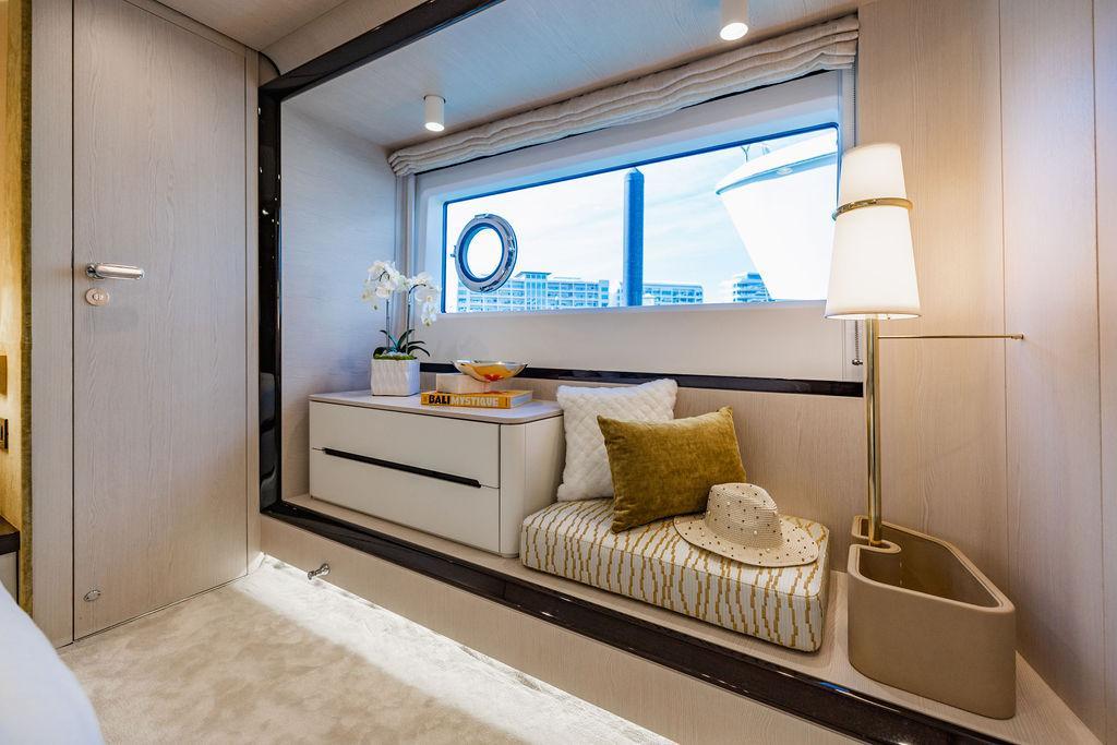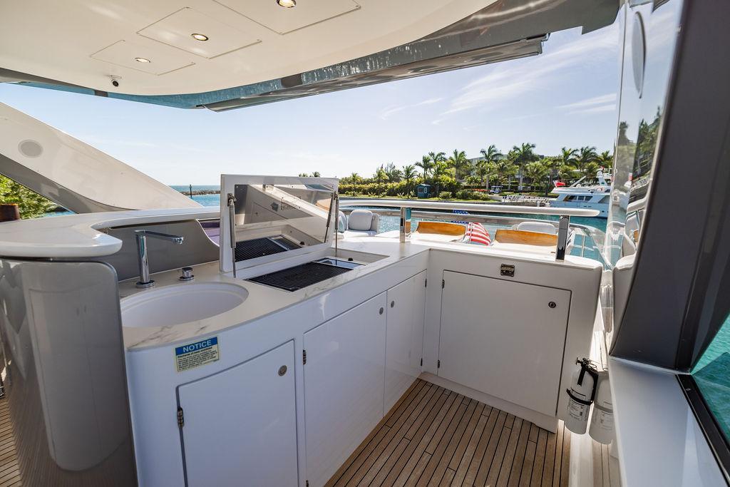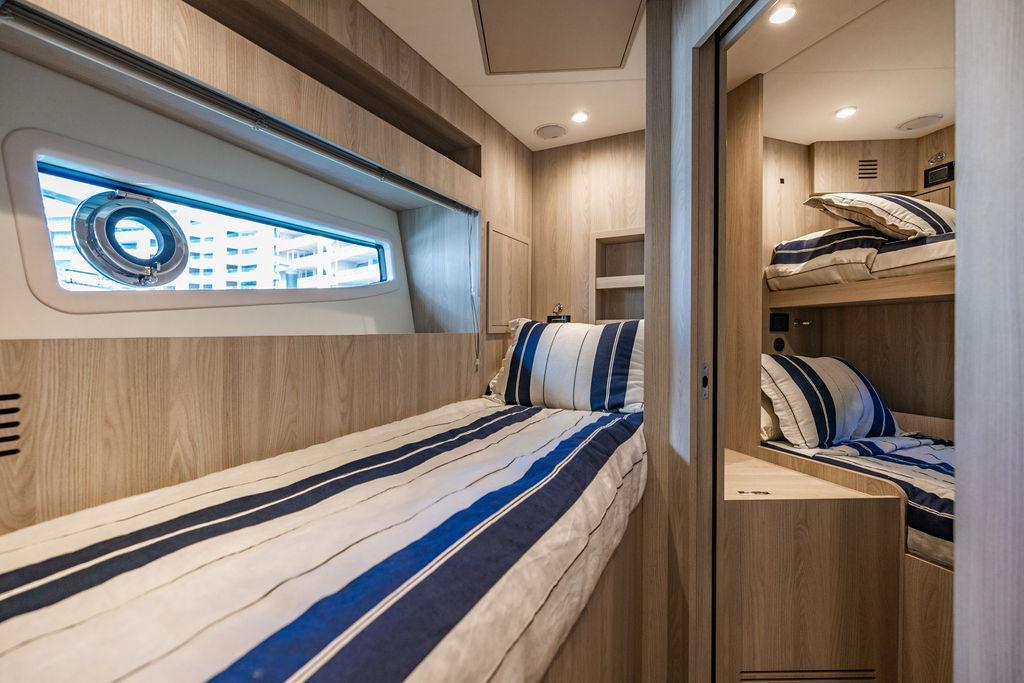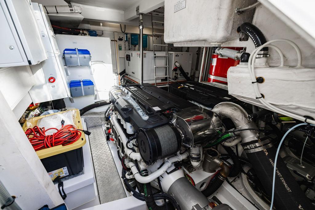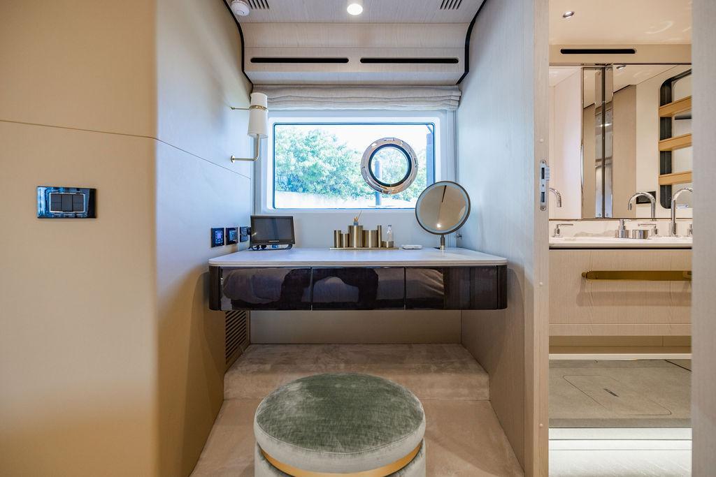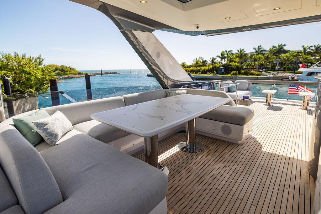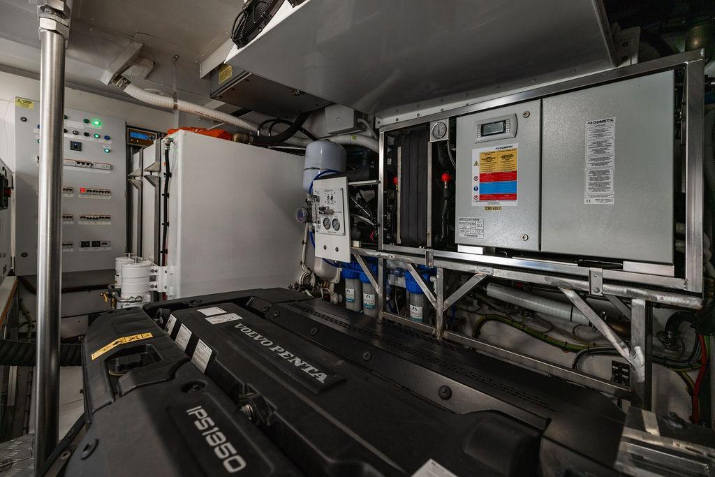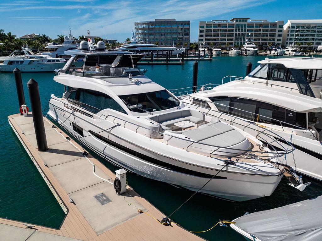 Through impeccable spatial solutions, the Fly 78 mimics the ambience of a larger yacht without compromising the sportive agility of smaller vessels. Secluded quarters eclipse behind-the-scenes service happenings, in the first ever boat in its category to organize completely partitioned areas for the galley and crew. A fluid and original onboard culture for the guests, elated by space blissand sheer sophistication.Revel in the atmosphere of the Fly 78, without compromise.Advance package :Black Water Tank Washing System, Dècor Upgrade Extra conduits,Grey Water Tank Washing System,,Miele appliances (upgrade for oven and cooktop), Watermaker predisposition (salt water - fresh water - electrical) OPTIONALS MAIN SYSTEM: 3 x VOLVO IPS 1350 (1000 hp) upgrade, Air Purification System Clearline, air conditioning raw water purification system, Cockpit docking station and bow thruster, (including engines control joystick and thruster control), Dynamic positioning system - Skyhook, Seakeeper Stabilizer 26 EXTERIOR: Bow sun shade with removable carbon fiber poles for sunbathing area and sitting area, Bow table with corian frame and synthetic marble insert, Cockpit awning (automatic), Cockpit Chair (mod. Oskar), Cockpit furniture with corian frame and synthetic marble insert top, Co-pilot seat on fly, Dimmer lights on fly, Electric awning for aft flybridge (requires hard top), Electric searchlight upgrade to ACR Flagpole, Flybridge hatch, Hard top (painted in Etna Grey), Lounge furniture on aft fly with two love seats in Batyline fabric (A000127336) and two coffee tables with corian frame and synthetic marble insert, Luxury lighting package for exteriors, Painted boot stripe, Painted flybridge furniture (frontal panel) in Grigio Savoia, Manouvering lights on bow (nr.2), Teak on flybridge deck, Telescopic gangway, Nr. 2 exterior teak stools for flybridge bar, Spreader lights on aft fly, Synthetic marble insert for the lower part of the flybridge bar furniture top, Underwater lights under sponsons (2X2) and transom (3) Oceanled S3124S, Upgraded standard exterior cushions in Batyline fabric (A000127336), Upgraded standard exterior teak tables and tops in corian frame with syntetic marble insert tops, Watertight hand control for anchor winch.INTERIOR: Co-pilot seat in main helm, Forward salon sofa (lounge version), Additional storage cabinet in vip cabin designed by Achille Salvagni, Black-out system for master cabin curtains, Carpet Besana Royal 43 Divina Icelandic in lower deck, Dividing wall with door in crew cabin, Domotic lighting system in salon, Dresser in master cabin with settee in lieu of standard sofa on port side, Electric roman blinds with integrated blackout system in salon (in lieu of standard manual roman blinds), Gentas Cement floor for galley and main helm, Heads floor in Gentash Cement 26 (in lieu of standard teak floors), Lacquered bronze color inserts on forward salon bulkhead (in lieu of standard white lacquered inserts), Master head shower wall in Quartzite Statuario (in lieu of standard laminate with slate finishing), Mosquito net for portholes Roman blinds in master cabin (in lieu of standard venetian blinds), Roman blinds with integrated blackout system in vip and guest cabins (in lieu of standard venetian blinds), Safe in crew cabin Safe in master cabin Scenic lights for interior, Set of linens for cabins (crew cabin not included), Set of linens for crew cabin (standard configuration), Set of linens for third bed in crew cabin, Set of towels for one person with Azimut logo, Third bed in crew cabin, Toilet with bidet faucet feature in master head Wooden floor in main deckAPPLIANCES: Barbecue for flybridge furniture, Dishwasher Icemaker on fly Refrigerator and icemaker for cockpit furniture, Washer and dryer in crew cabin (2 units), Winecooler in galleyELECTRONICS: Garmin AIS 800 Garmin videocameras (nr.3), Raymarine Flir M364-C thermal camera, Volvo Glass Platinum packageVIDEO - TV - HI-FI Audio/Video Package (with SAT TV Antenna KVH Tracvision HD7 and Decoders) (hi-lo system for TV in salon included), Flybridge furniture with 43'' TV and lift with decoders and antennaEXTRAS; SMALLER HI-LO TABLE IN SALON TO BE ALIGNED TO THE AFT SIDE OF THE SOFA, IN ONE SINGLE FINISHING: BRUSHED OAK GRAY 10 GLOSS SALON COFFEE TABLE IN LEATHER A000120541 IN LIEU OF STD. LEATHER A000139335
