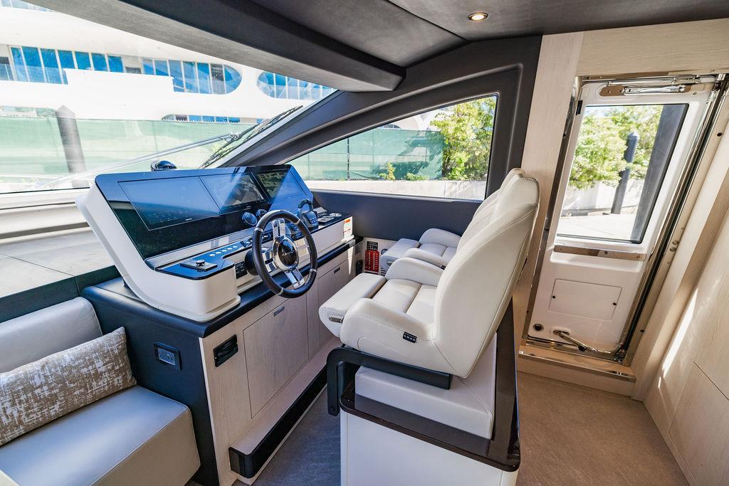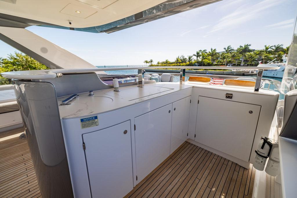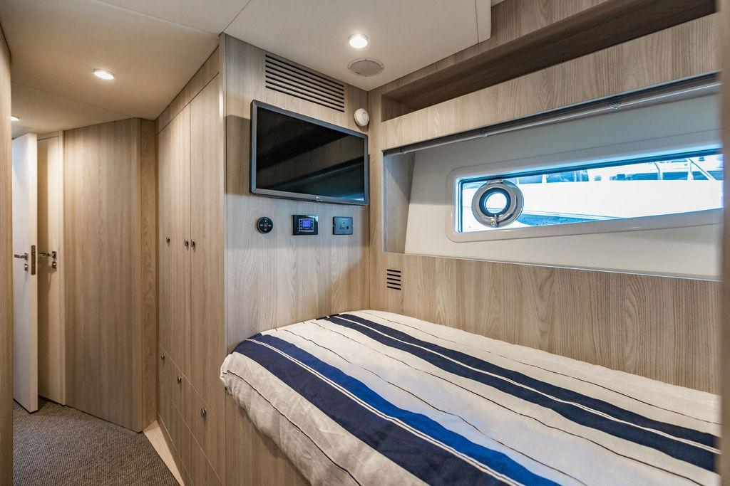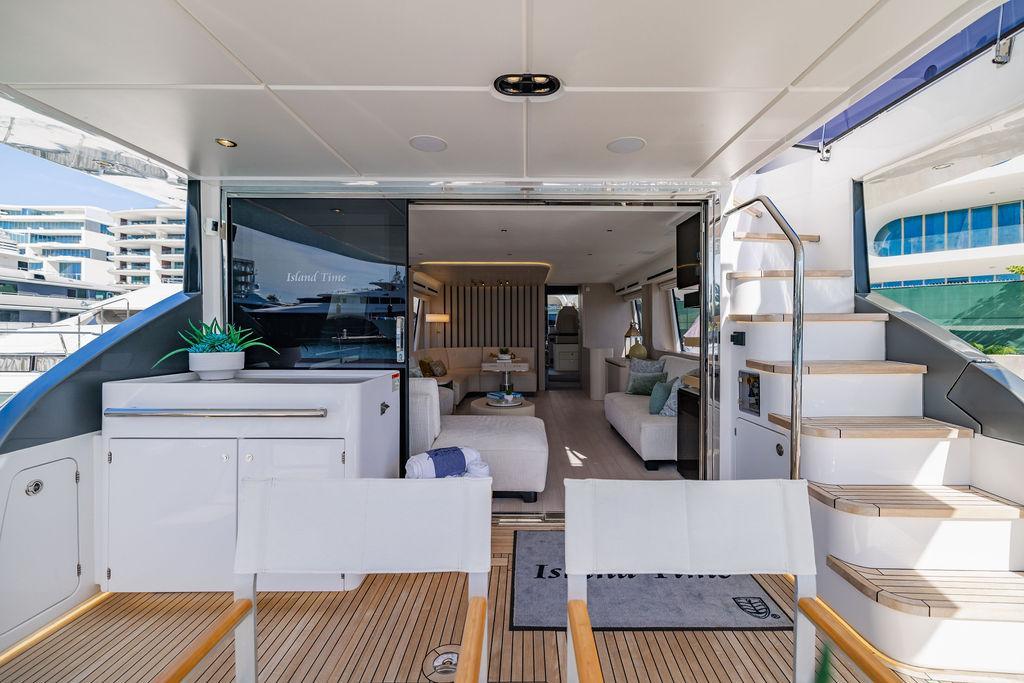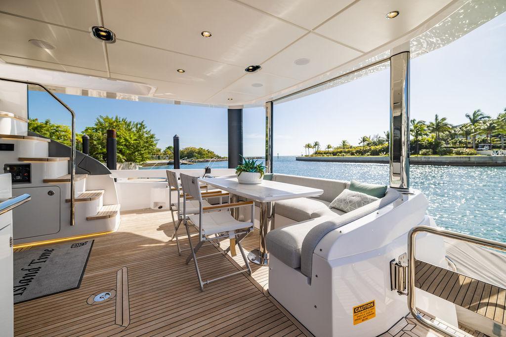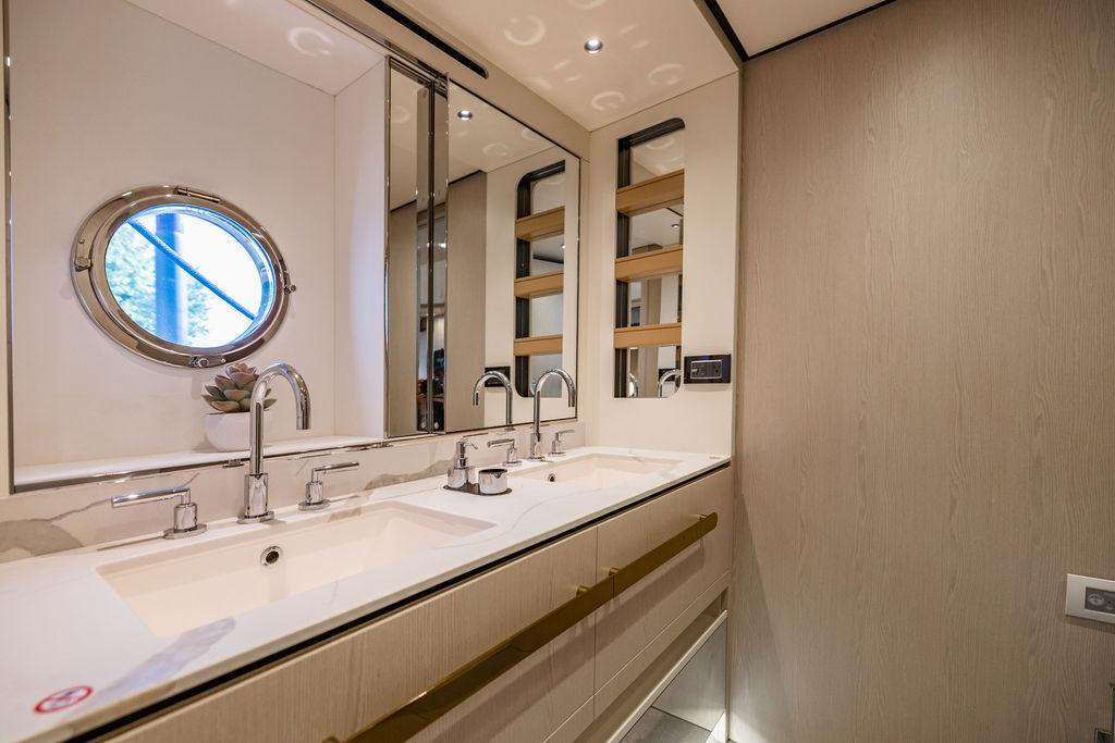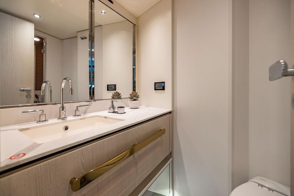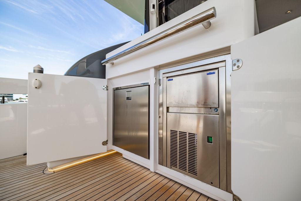 Through impeccable spatial solutions, the Fly 78 mimics the ambience of a larger yacht without compromising the sportive agility of smaller vessels. Secluded quarters eclipse behind-the-scenes service happenings, in the first ever boat in its category to organize completely partitioned areas for the galley and crew. A fluid and original onboard culture for the guests, elated by space blissand sheer sophistication.Revel in the atmosphere of the Fly 78, without compromise.Advance package :Black Water Tank Washing System, Dècor Upgrade Extra conduits,Grey Water Tank Washing System,,Miele appliances (upgrade for oven and cooktop), Watermaker predisposition (salt water - fresh water - electrical) OPTIONALS MAIN SYSTEM: 3 x VOLVO IPS 1350 (1000 hp) upgrade, Air Purification System Clearline, air conditioning raw water purification system, Cockpit docking station and bow thruster, (including engines control joystick and thruster control), Dynamic positioning system - Skyhook, Seakeeper Stabilizer 26 EXTERIOR: Bow sun shade with removable carbon fiber poles for sunbathing area and sitting area, Bow table with corian frame and synthetic marble insert, Cockpit awning (automatic), Cockpit Chair (mod. Oskar), Cockpit furniture with corian frame and synthetic marble insert top, Co-pilot seat on fly, Dimmer lights on fly, Electric awning for aft flybridge (requires hard top), Electric searchlight upgrade to ACR Flagpole, Flybridge hatch, Hard top (painted in Etna Grey), Lounge furniture on aft fly with two love seats in Batyline fabric (A000127336) and two coffee tables with corian frame and synthetic marble insert, Luxury lighting package for exteriors, Painted boot stripe, Painted flybridge furniture (frontal panel) in Grigio Savoia, Manouvering lights on bow (nr.2), Teak on flybridge deck, Telescopic gangway, Nr. 2 exterior teak stools for flybridge bar, Spreader lights on aft fly, Synthetic marble insert for the lower part of the flybridge bar furniture top, Underwater lights under sponsons (2X2) and transom (3) Oceanled S3124S, Upgraded standard exterior cushions in Batyline fabric (A000127336), Upgraded standard exterior teak tables and tops in corian frame with syntetic marble insert tops, Watertight hand control for anchor winch.INTERIOR: Co-pilot seat in main helm, Forward salon sofa (lounge version), Additional storage cabinet in vip cabin designed by Achille Salvagni, Black-out system for master cabin curtains, Carpet Besana Royal 43 Divina Icelandic in lower deck, Dividing wall with door in crew cabin, Domotic lighting system in salon, Dresser in master cabin with settee in lieu of standard sofa on port side, Electric roman blinds with integrated blackout system in salon (in lieu of standard manual roman blinds), Gentas Cement floor for galley and main helm, Heads floor in Gentash Cement 26 (in lieu of standard teak floors), Lacquered bronze color inserts on forward salon bulkhead (in lieu of standard white lacquered inserts), Master head shower wall in Quartzite Statuario (in lieu of standard laminate with slate finishing), Mosquito net for portholes Roman blinds in master cabin (in lieu of standard venetian blinds), Roman blinds with integrated blackout system in vip and guest cabins (in lieu of standard venetian blinds), Safe in crew cabin Safe in master cabin Scenic lights for interior, Set of linens for cabins (crew cabin not included), Set of linens for crew cabin (standard configuration), Set of linens for third bed in crew cabin, Set of towels for one person with Azimut logo, Third bed in crew cabin, Toilet with bidet faucet feature in master head Wooden floor in main deckAPPLIANCES: Barbecue for flybridge furniture, Dishwasher Icemaker on fly Refrigerator and icemaker for cockpit furniture, Washer and dryer in crew cabin (2 units), Winecooler in galleyELECTRONICS: Garmin AIS 800 Garmin videocameras (nr.3), Raymarine Flir M364-C thermal camera, Volvo Glass Platinum packageVIDEO - TV - HI-FI Audio/Video Package (with SAT TV Antenna KVH Tracvision HD7 and Decoders) (hi-lo system for TV in salon included), Flybridge furniture with 43'' TV and lift with decoders and antennaEXTRAS; SMALLER HI-LO TABLE IN SALON TO BE ALIGNED TO THE AFT SIDE OF THE SOFA, IN ONE SINGLE FINISHING: BRUSHED OAK GRAY 10 GLOSS SALON COFFEE TABLE IN LEATHER A000120541 IN LIEU OF STD. LEATHER A000139335