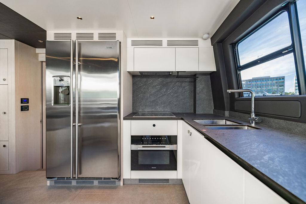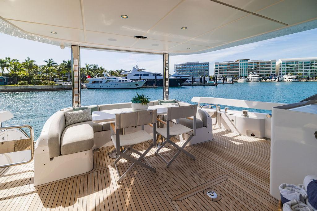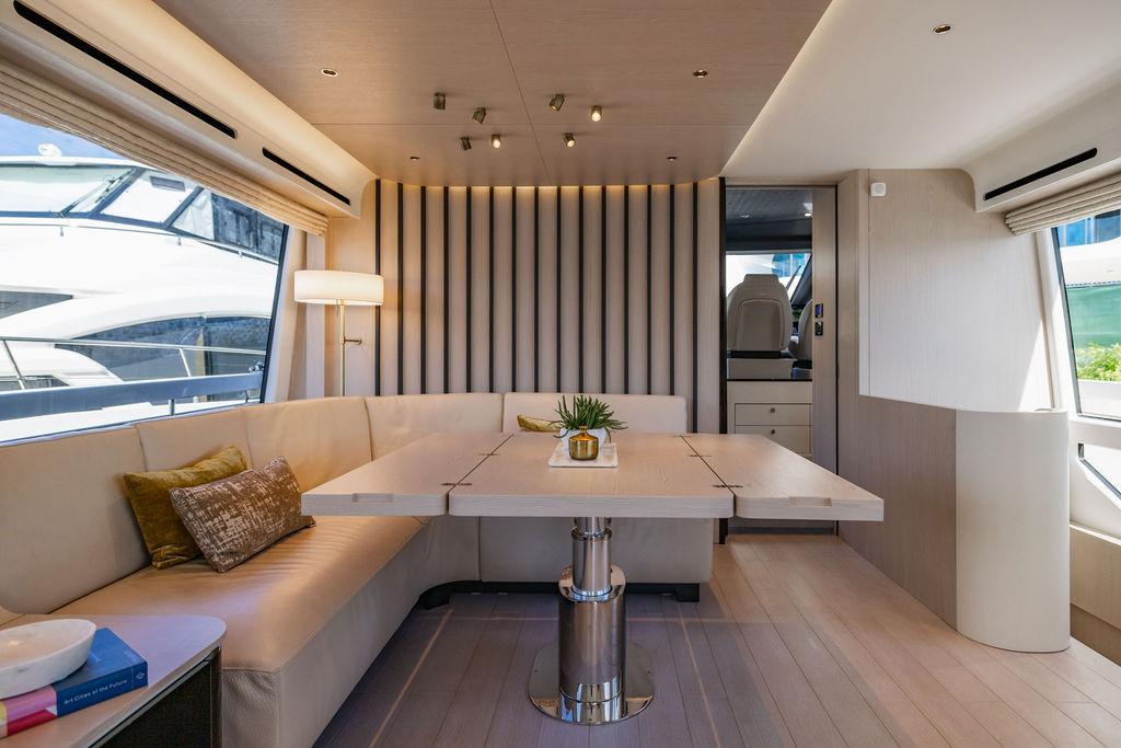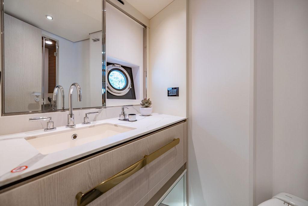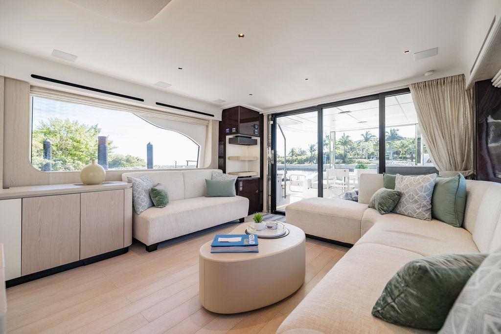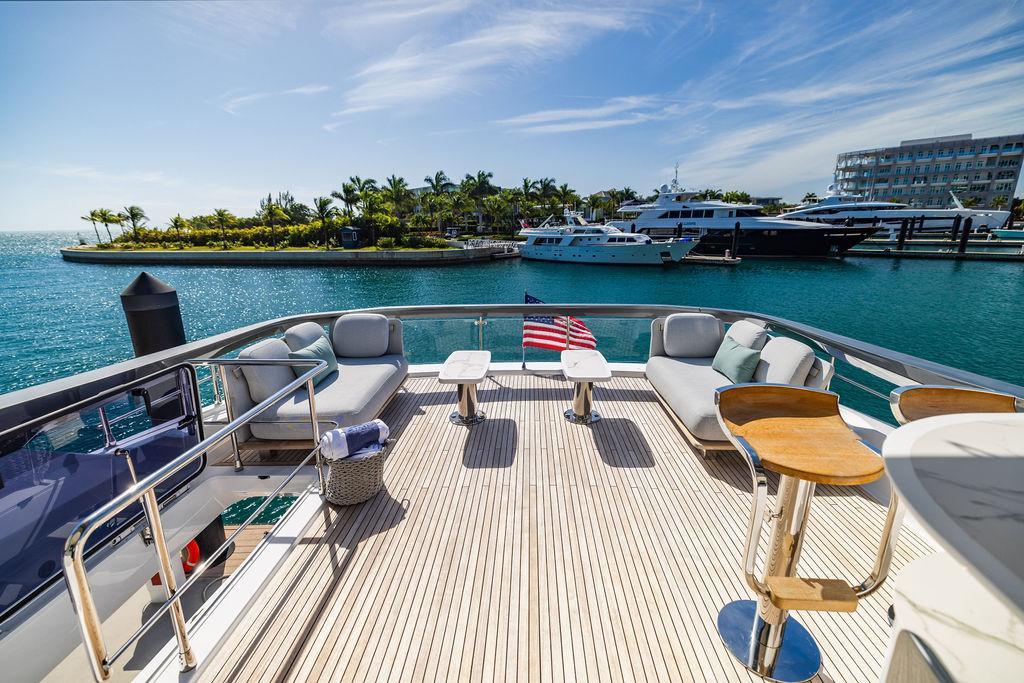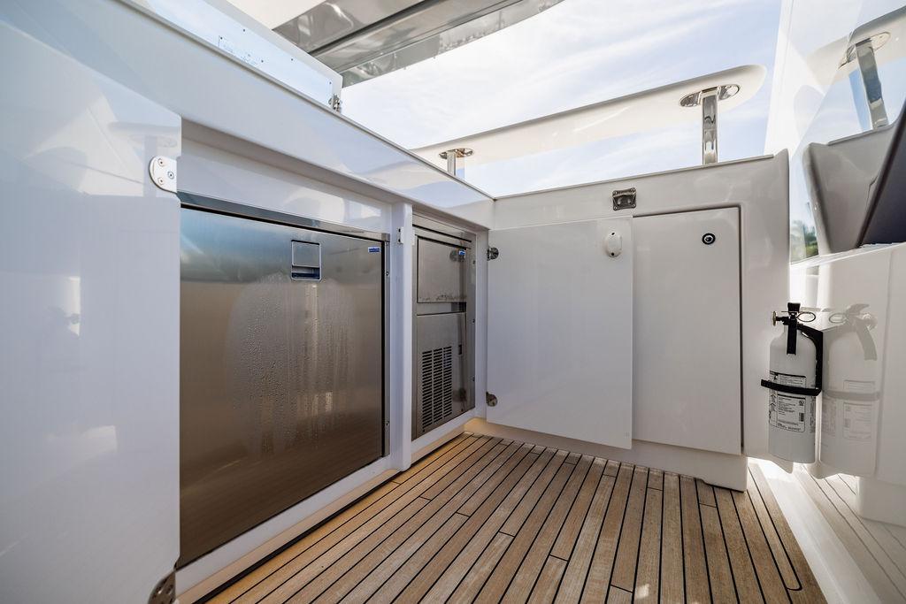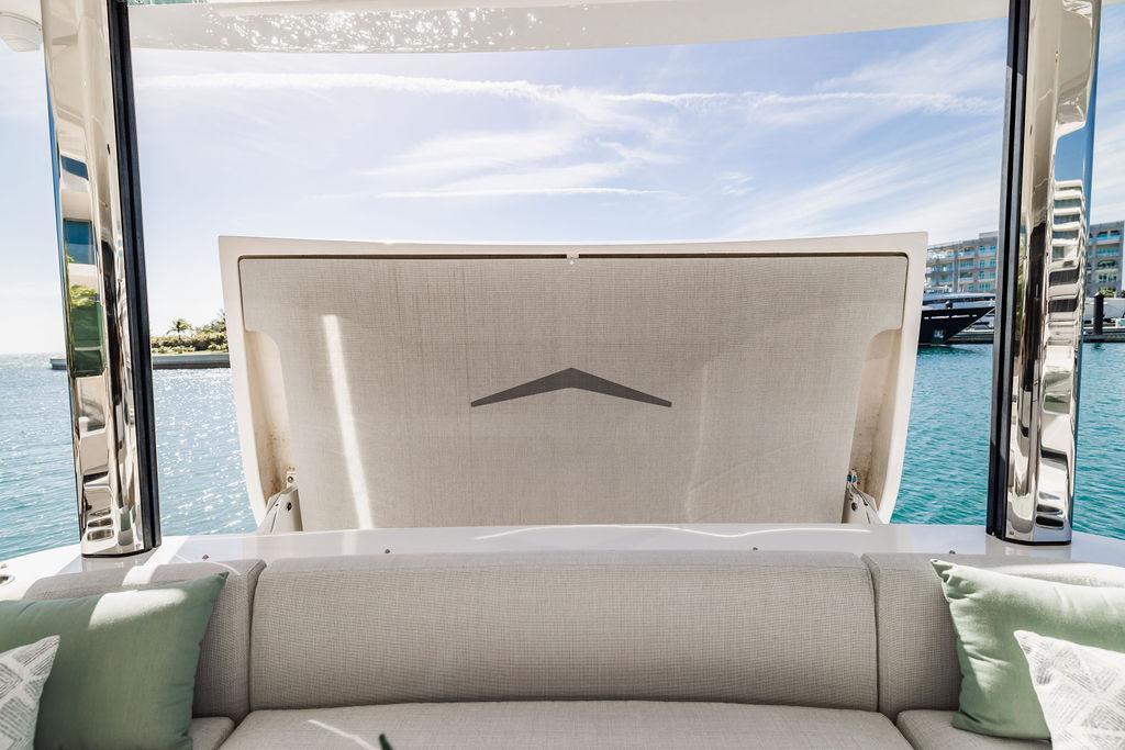 Through impeccable spatial solutions, the Fly 78 mimics the ambience of a larger yacht without compromising the sportive agility of smaller vessels. Secluded quarters eclipse behind-the-scenes service happenings, in the first ever boat in its category to organize completely partitioned areas for the galley and crew. A fluid and original onboard culture for the guests, elated by space blissand sheer sophistication.Revel in the atmosphere of the Fly 78, without compromise.Advance package :Black Water Tank Washing System, Dècor Upgrade Extra conduits,Grey Water Tank Washing System,,Miele appliances (upgrade for oven and cooktop), Watermaker predisposition (salt water - fresh water - electrical) OPTIONALS MAIN SYSTEM: 3 x VOLVO IPS 1350 (1000 hp) upgrade, Air Purification System Clearline, air conditioning raw water purification system, Cockpit docking station and bow thruster, (including engines control joystick and thruster control), Dynamic positioning system - Skyhook, Seakeeper Stabilizer 26 EXTERIOR: Bow sun shade with removable carbon fiber poles for sunbathing area and sitting area, Bow table with corian frame and synthetic marble insert, Cockpit awning (automatic), Cockpit Chair (mod. Oskar), Cockpit furniture with corian frame and synthetic marble insert top, Co-pilot seat on fly, Dimmer lights on fly, Electric awning for aft flybridge (requires hard top), Electric searchlight upgrade to ACR Flagpole, Flybridge hatch, Hard top (painted in Etna Grey), Lounge furniture on aft fly with two love seats in Batyline fabric (A000127336) and two coffee tables with corian frame and synthetic marble insert, Luxury lighting package for exteriors, Painted boot stripe, Painted flybridge furniture (frontal panel) in Grigio Savoia, Manouvering lights on bow (nr.2), Teak on flybridge deck, Telescopic gangway, Nr. 2 exterior teak stools for flybridge bar, Spreader lights on aft fly, Synthetic marble insert for the lower part of the flybridge bar furniture top, Underwater lights under sponsons (2X2) and transom (3) Oceanled S3124S, Upgraded standard exterior cushions in Batyline fabric (A000127336), Upgraded standard exterior teak tables and tops in corian frame with syntetic marble insert tops, Watertight hand control for anchor winch.INTERIOR: Co-pilot seat in main helm, Forward salon sofa (lounge version), Additional storage cabinet in vip cabin designed by Achille Salvagni, Black-out system for master cabin curtains, Carpet Besana Royal 43 Divina Icelandic in lower deck, Dividing wall with door in crew cabin, Domotic lighting system in salon, Dresser in master cabin with settee in lieu of standard sofa on port side, Electric roman blinds with integrated blackout system in salon (in lieu of standard manual roman blinds), Gentas Cement floor for galley and main helm, Heads floor in Gentash Cement 26 (in lieu of standard teak floors), Lacquered bronze color inserts on forward salon bulkhead (in lieu of standard white lacquered inserts), Master head shower wall in Quartzite Statuario (in lieu of standard laminate with slate finishing), Mosquito net for portholes Roman blinds in master cabin (in lieu of standard venetian blinds), Roman blinds with integrated blackout system in vip and guest cabins (in lieu of standard venetian blinds), Safe in crew cabin Safe in master cabin Scenic lights for interior, Set of linens for cabins (crew cabin not included), Set of linens for crew cabin (standard configuration), Set of linens for third bed in crew cabin, Set of towels for one person with Azimut logo, Third bed in crew cabin, Toilet with bidet faucet feature in master head Wooden floor in main deckAPPLIANCES: Barbecue for flybridge furniture, Dishwasher Icemaker on fly Refrigerator and icemaker for cockpit furniture, Washer and dryer in crew cabin (2 units), Winecooler in galleyELECTRONICS: Garmin AIS 800 Garmin videocameras (nr.3), Raymarine Flir M364-C thermal camera, Volvo Glass Platinum packageVIDEO - TV - HI-FI Audio/Video Package (with SAT TV Antenna KVH Tracvision HD7 and Decoders) (hi-lo system for TV in salon included), Flybridge furniture with 43'' TV and lift with decoders and antennaEXTRAS; SMALLER HI-LO TABLE IN SALON TO BE ALIGNED TO THE AFT SIDE OF THE SOFA, IN ONE SINGLE FINISHING: BRUSHED OAK GRAY 10 GLOSS SALON COFFEE TABLE IN LEATHER A000120541 IN LIEU OF STD. LEATHER A000139335