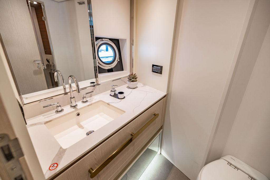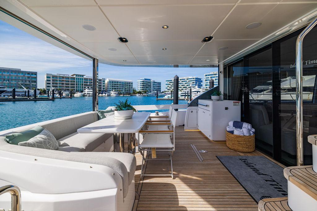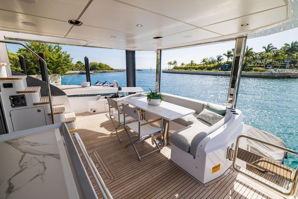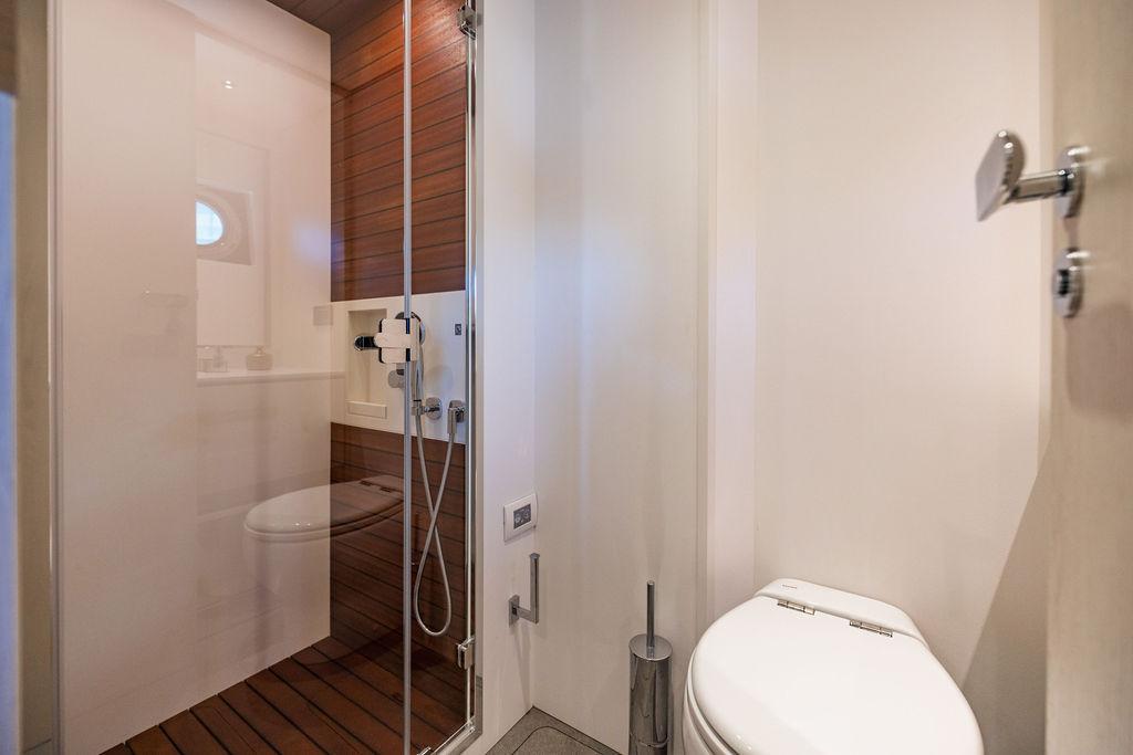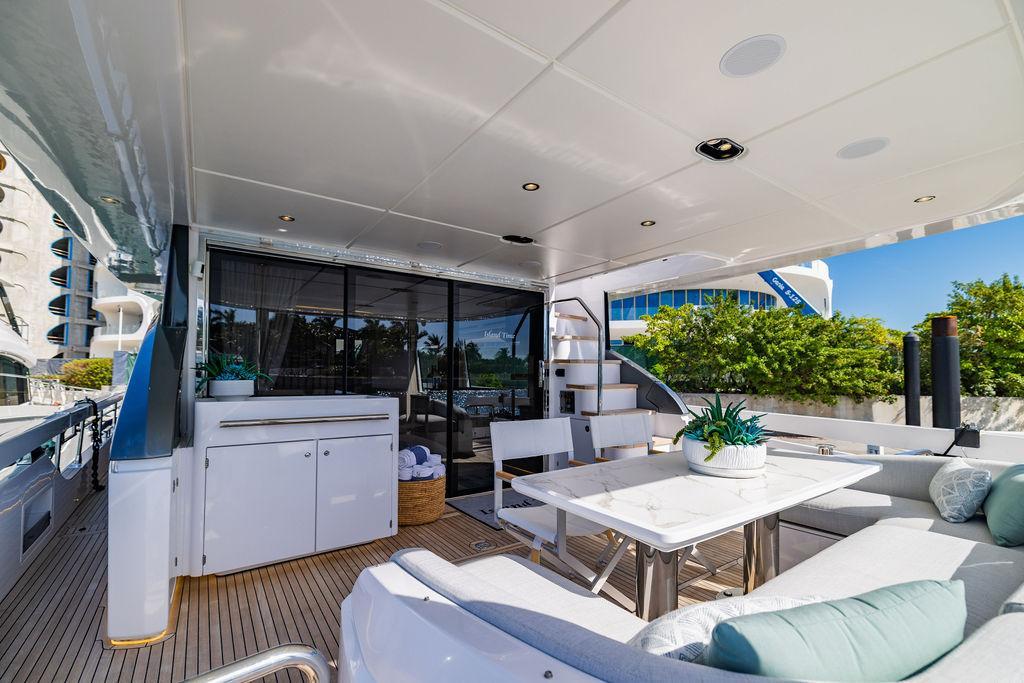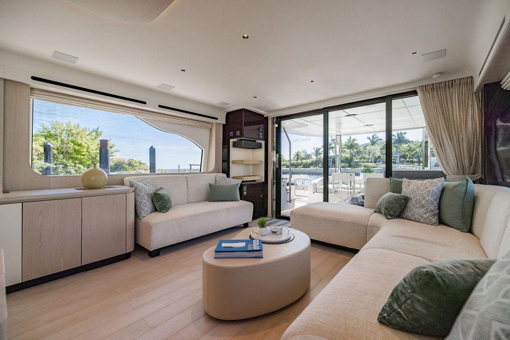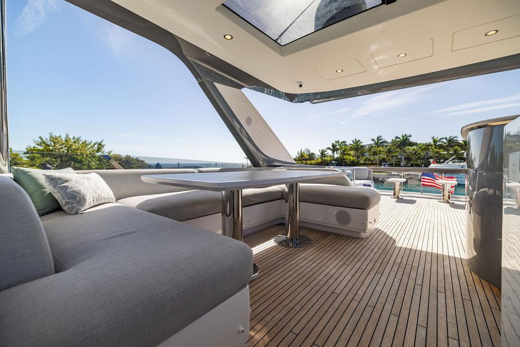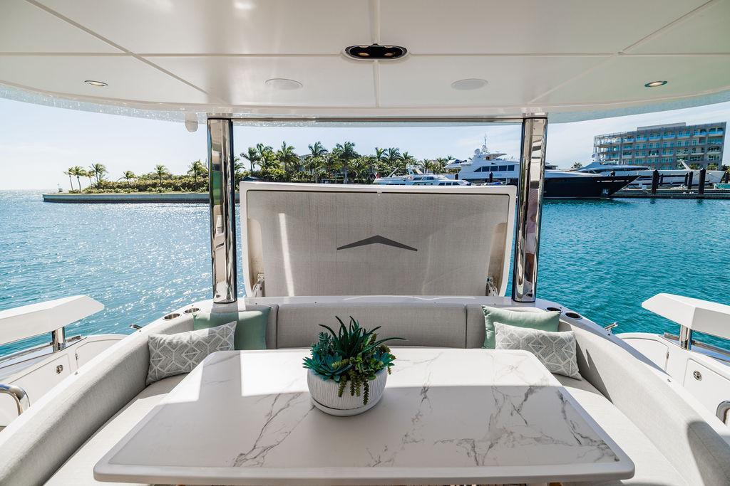 Through impeccable spatial solutions, the Fly 78 mimics the ambience of a larger yacht without compromising the sportive agility of smaller vessels. Secluded quarters eclipse behind-the-scenes service happenings, in the first ever boat in its category to organize completely partitioned areas for the galley and crew. A fluid and original onboard culture for the guests, elated by space blissand sheer sophistication.Revel in the atmosphere of the Fly 78, without compromise.Advance package :Black Water Tank Washing System, Dècor Upgrade Extra conduits,Grey Water Tank Washing System,,Miele appliances (upgrade for oven and cooktop), Watermaker predisposition (salt water - fresh water - electrical) OPTIONALS MAIN SYSTEM: 3 x VOLVO IPS 1350 (1000 hp) upgrade, Air Purification System Clearline, air conditioning raw water purification system, Cockpit docking station and bow thruster, (including engines control joystick and thruster control), Dynamic positioning system - Skyhook, Seakeeper Stabilizer 26 EXTERIOR: Bow sun shade with removable carbon fiber poles for sunbathing area and sitting area, Bow table with corian frame and synthetic marble insert, Cockpit awning (automatic), Cockpit Chair (mod. Oskar), Cockpit furniture with corian frame and synthetic marble insert top, Co-pilot seat on fly, Dimmer lights on fly, Electric awning for aft flybridge (requires hard top), Electric searchlight upgrade to ACR Flagpole, Flybridge hatch, Hard top (painted in Etna Grey), Lounge furniture on aft fly with two love seats in Batyline fabric (A000127336) and two coffee tables with corian frame and synthetic marble insert, Luxury lighting package for exteriors, Painted boot stripe, Painted flybridge furniture (frontal panel) in Grigio Savoia, Manouvering lights on bow (nr.2), Teak on flybridge deck, Telescopic gangway, Nr. 2 exterior teak stools for flybridge bar, Spreader lights on aft fly, Synthetic marble insert for the lower part of the flybridge bar furniture top, Underwater lights under sponsons (2X2) and transom (3) Oceanled S3124S, Upgraded standard exterior cushions in Batyline fabric (A000127336), Upgraded standard exterior teak tables and tops in corian frame with syntetic marble insert tops, Watertight hand control for anchor winch.INTERIOR: Co-pilot seat in main helm, Forward salon sofa (lounge version), Additional storage cabinet in vip cabin designed by Achille Salvagni, Black-out system for master cabin curtains, Carpet Besana Royal 43 Divina Icelandic in lower deck, Dividing wall with door in crew cabin, Domotic lighting system in salon, Dresser in master cabin with settee in lieu of standard sofa on port side, Electric roman blinds with integrated blackout system in salon (in lieu of standard manual roman blinds), Gentas Cement floor for galley and main helm, Heads floor in Gentash Cement 26 (in lieu of standard teak floors), Lacquered bronze color inserts on forward salon bulkhead (in lieu of standard white lacquered inserts), Master head shower wall in Quartzite Statuario (in lieu of standard laminate with slate finishing), Mosquito net for portholes Roman blinds in master cabin (in lieu of standard venetian blinds), Roman blinds with integrated blackout system in vip and guest cabins (in lieu of standard venetian blinds), Safe in crew cabin Safe in master cabin Scenic lights for interior, Set of linens for cabins (crew cabin not included), Set of linens for crew cabin (standard configuration), Set of linens for third bed in crew cabin, Set of towels for one person with Azimut logo, Third bed in crew cabin, Toilet with bidet faucet feature in master head Wooden floor in main deckAPPLIANCES: Barbecue for flybridge furniture, Dishwasher Icemaker on fly Refrigerator and icemaker for cockpit furniture, Washer and dryer in crew cabin (2 units), Winecooler in galleyELECTRONICS: Garmin AIS 800 Garmin videocameras (nr.3), Raymarine Flir M364-C thermal camera, Volvo Glass Platinum packageVIDEO - TV - HI-FI Audio/Video Package (with SAT TV Antenna KVH Tracvision HD7 and Decoders) (hi-lo system for TV in salon included), Flybridge furniture with 43'' TV and lift with decoders and antennaEXTRAS; SMALLER HI-LO TABLE IN SALON TO BE ALIGNED TO THE AFT SIDE OF THE SOFA, IN ONE SINGLE FINISHING: BRUSHED OAK GRAY 10 GLOSS SALON COFFEE TABLE IN LEATHER A000120541 IN LIEU OF STD. LEATHER A000139335