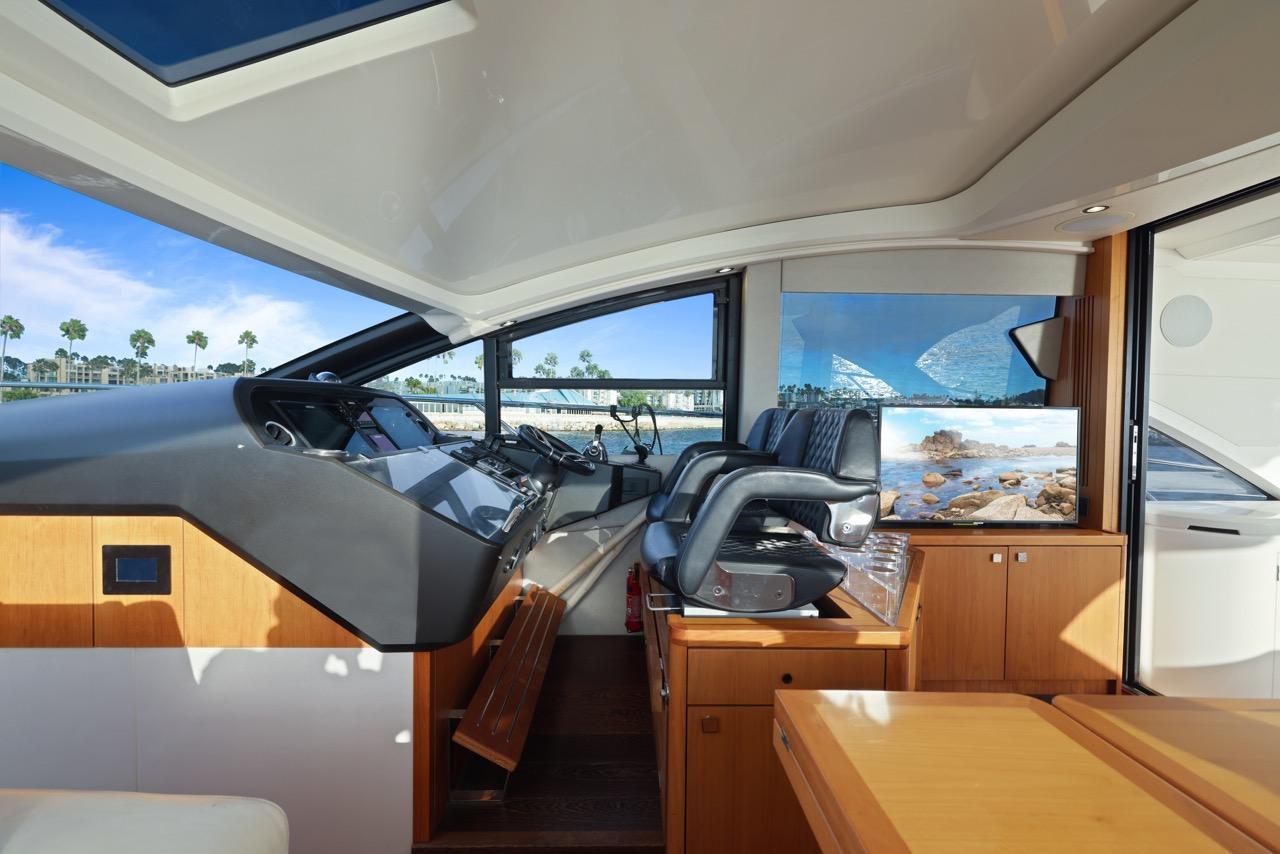 Aft docking station with second shaft drive throttles, thruster control, multi-panel, and horn for easy docking. (Software updated via Vodia).