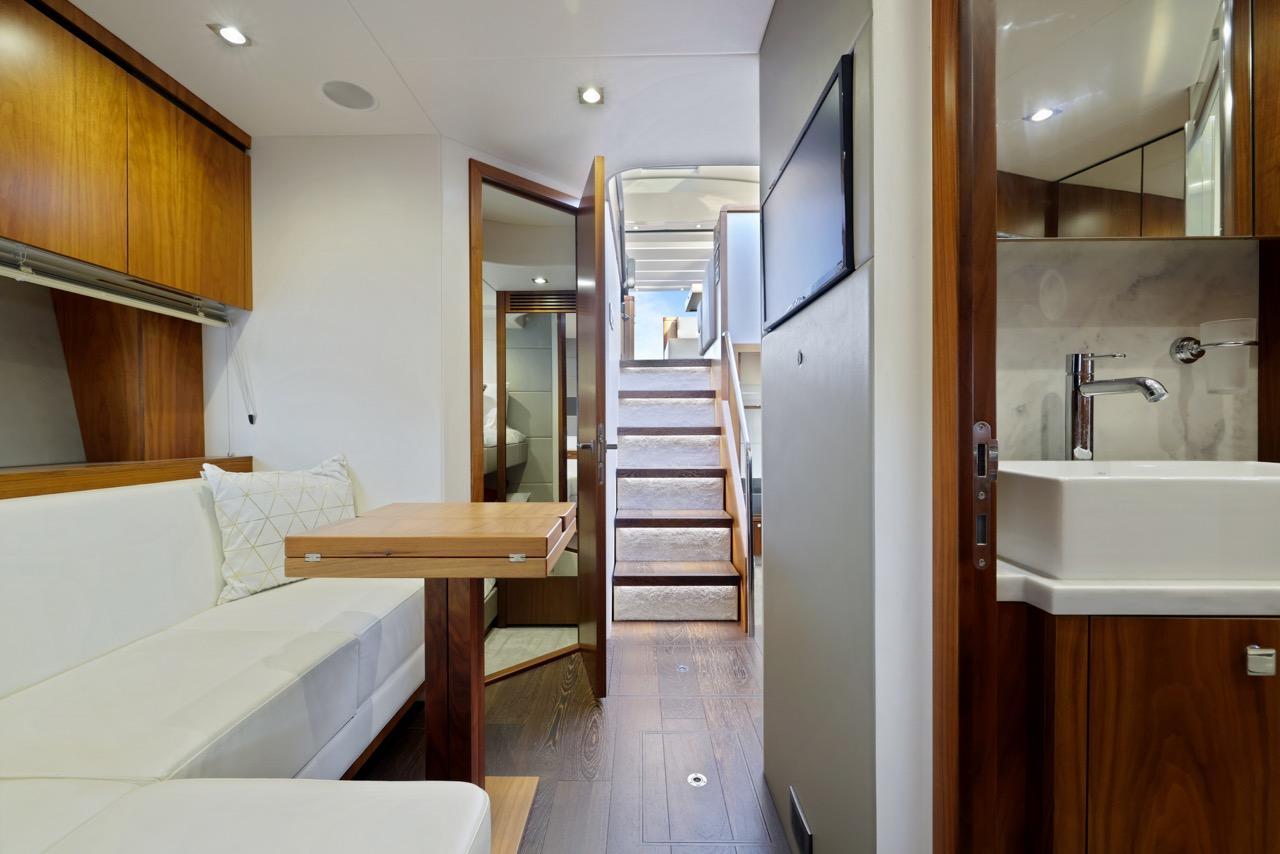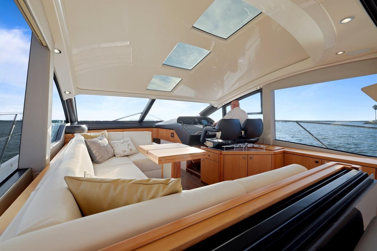 Seating and aft sunbathing cushions are upholstered in Silvertex Plata for a sleek, modern look.