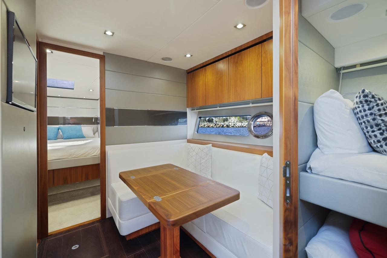 - Forward Cabin: Samsung 22" Television, Fusion MS-AV750 DVD/CD/Radio with Bluetooth, infrared remote, and Fusion PP-FR652 speakers.