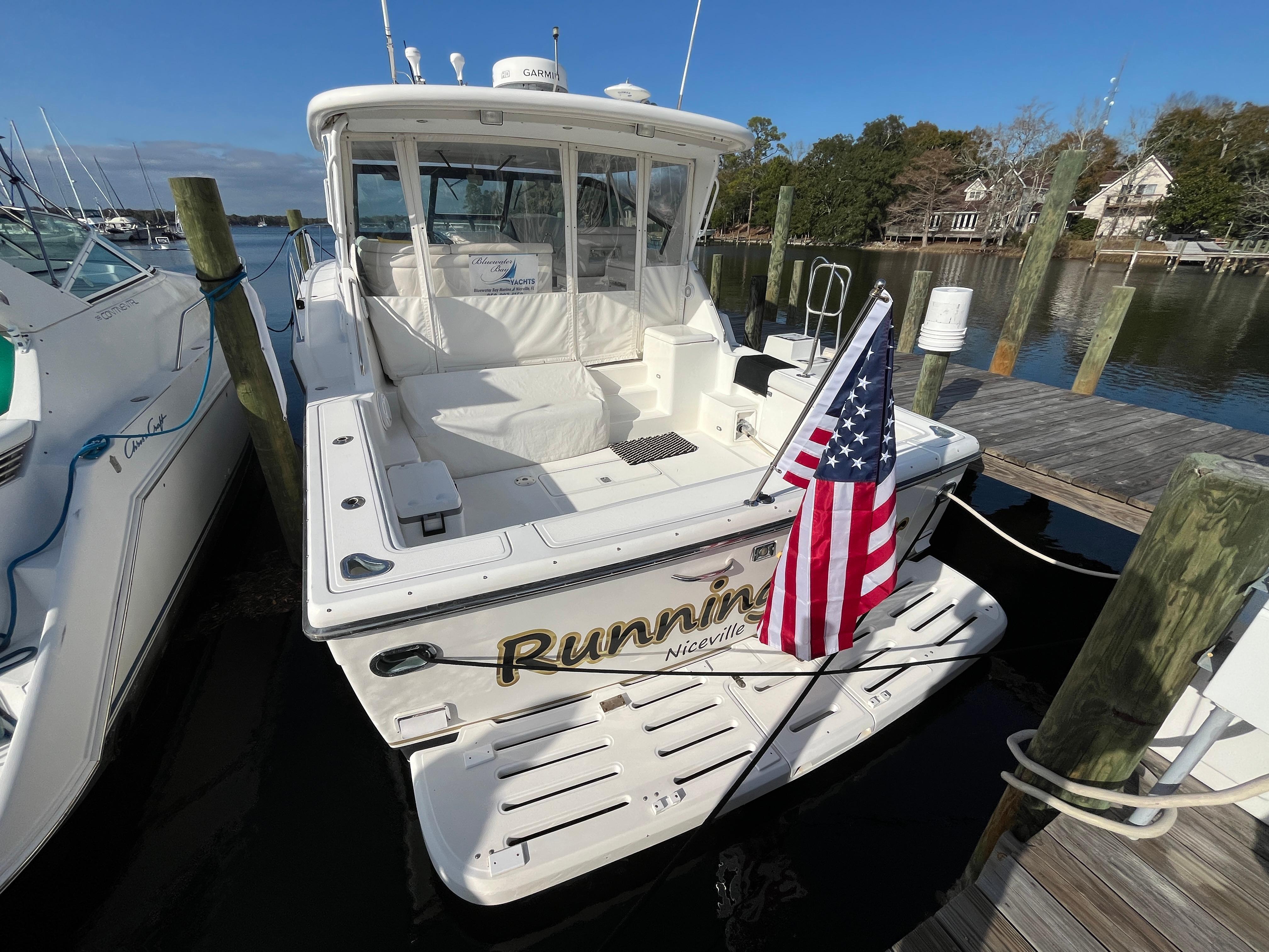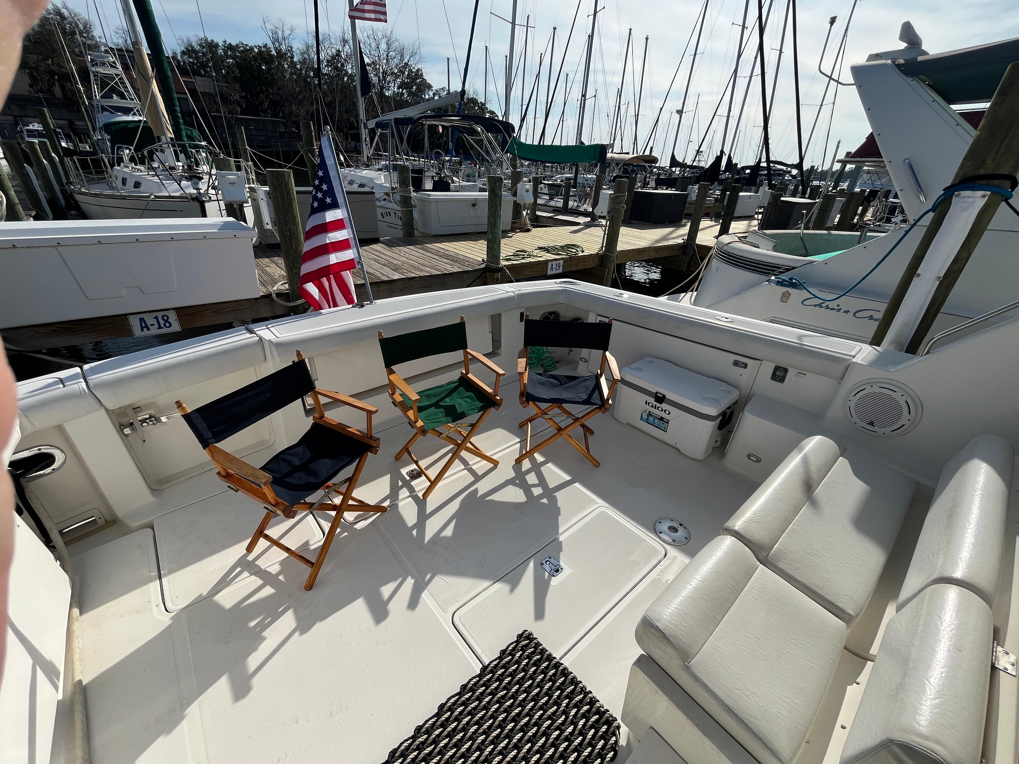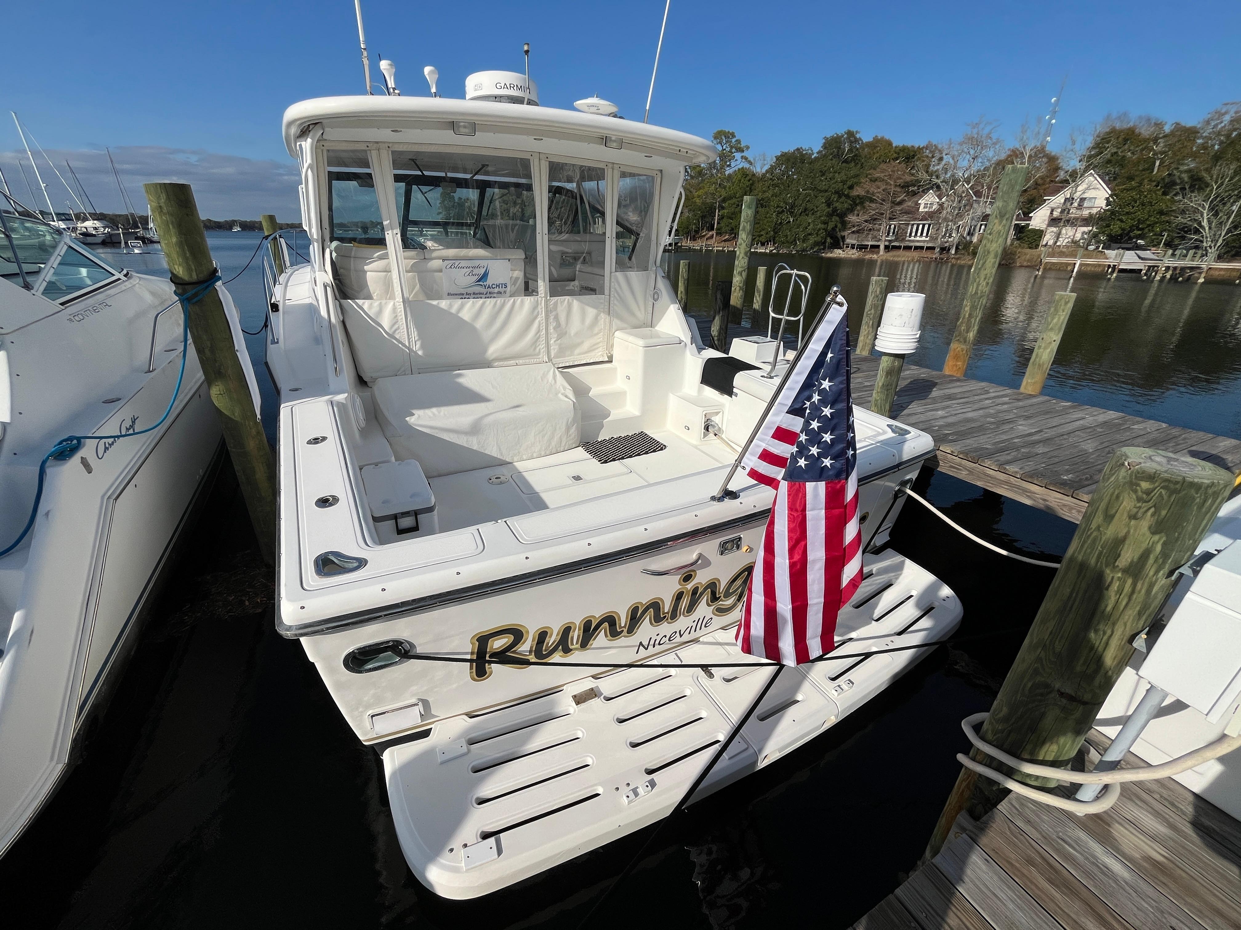 This very nice example of the popular 4100 open shows very well a the owners have kept her up with pride of ownership. For both the cruising and fishing enthusiast, this model offers plenty of cockpit area for relaxing and fishing. The cockpit is huge - 168 square feet, with seating that includes an oversized helm seat, companion L-lounge, portside aft-facing lounge seat (lifts for walk-in engine room entry. The seat can be replaced with optional bait prep center (also with engine room entry). Below deck is a spacious retreat with lounge (convertible to dinette or double berth), full galley and exceptional storage space. The owner's stateroom has a queen-sized pedestal bed, his/hers cedar-lined hanging lockers, and standard TV with remote. The completely private starboard head is over-sized, with access from both the salon or the owner's stateroom.