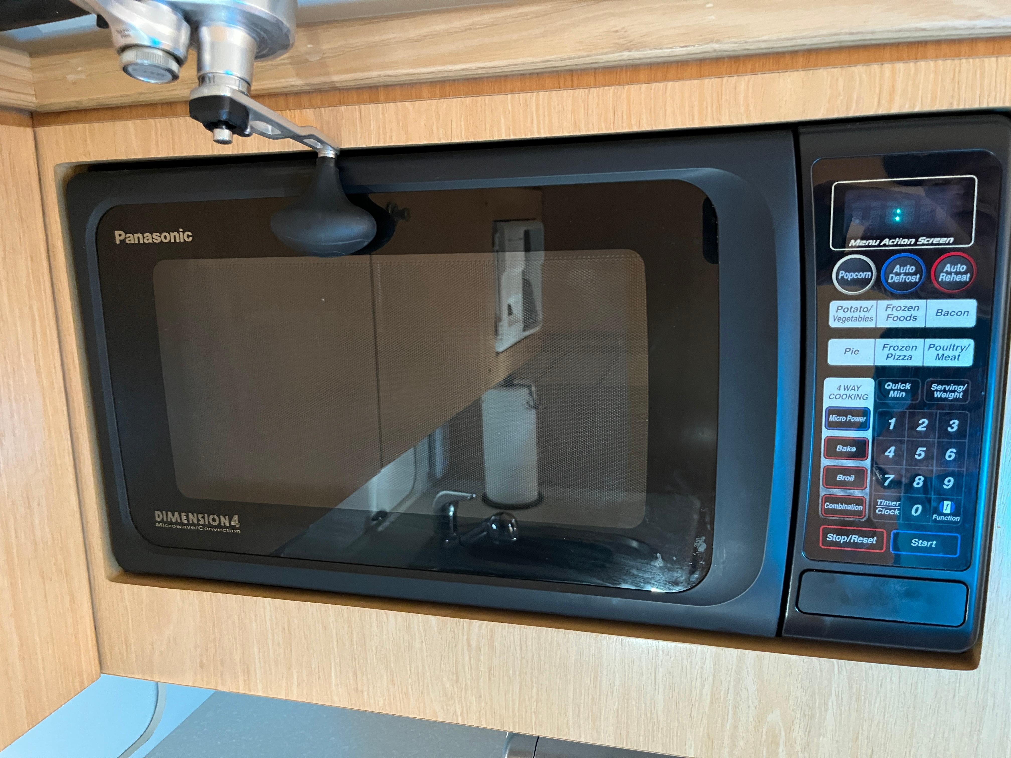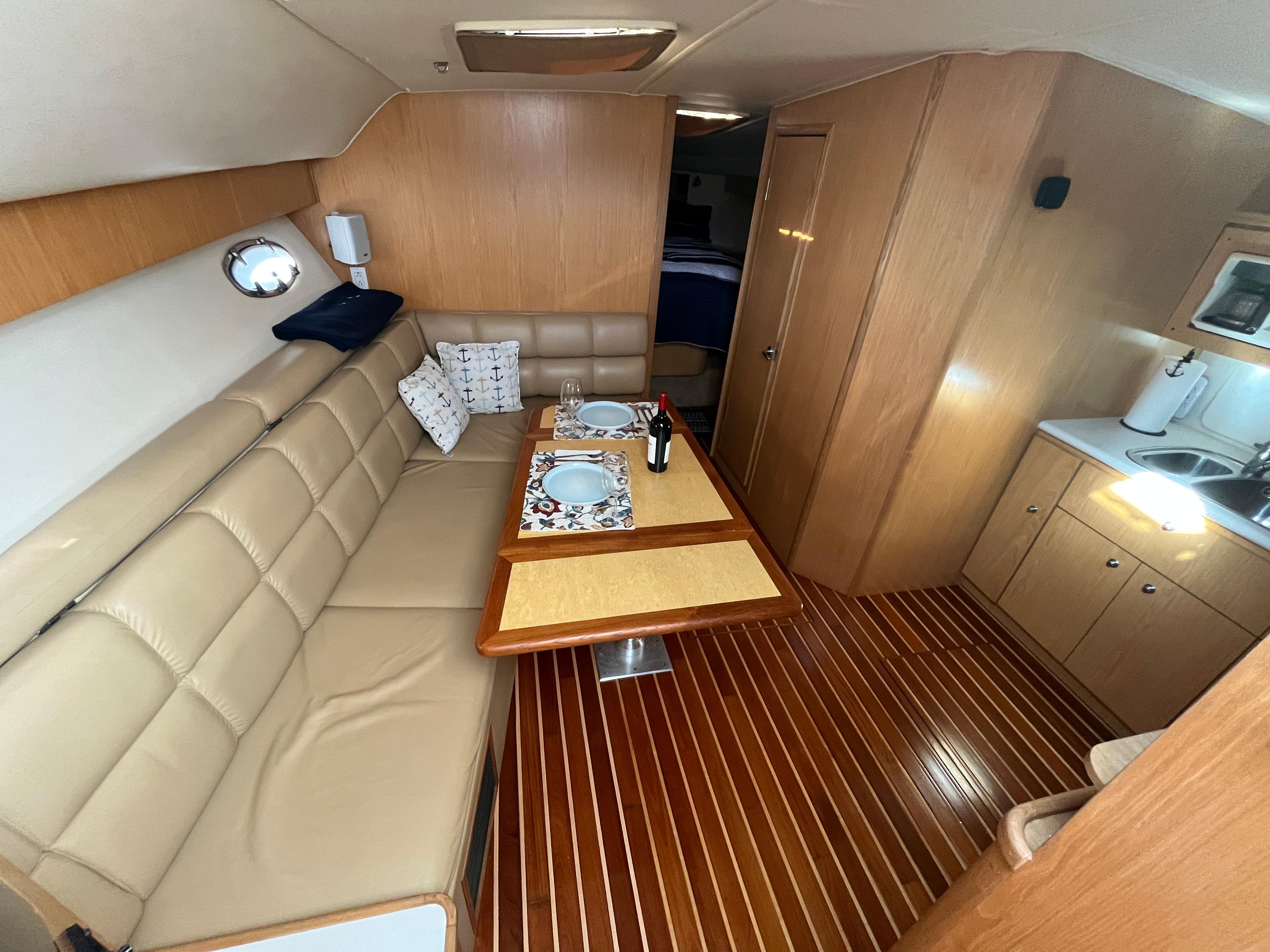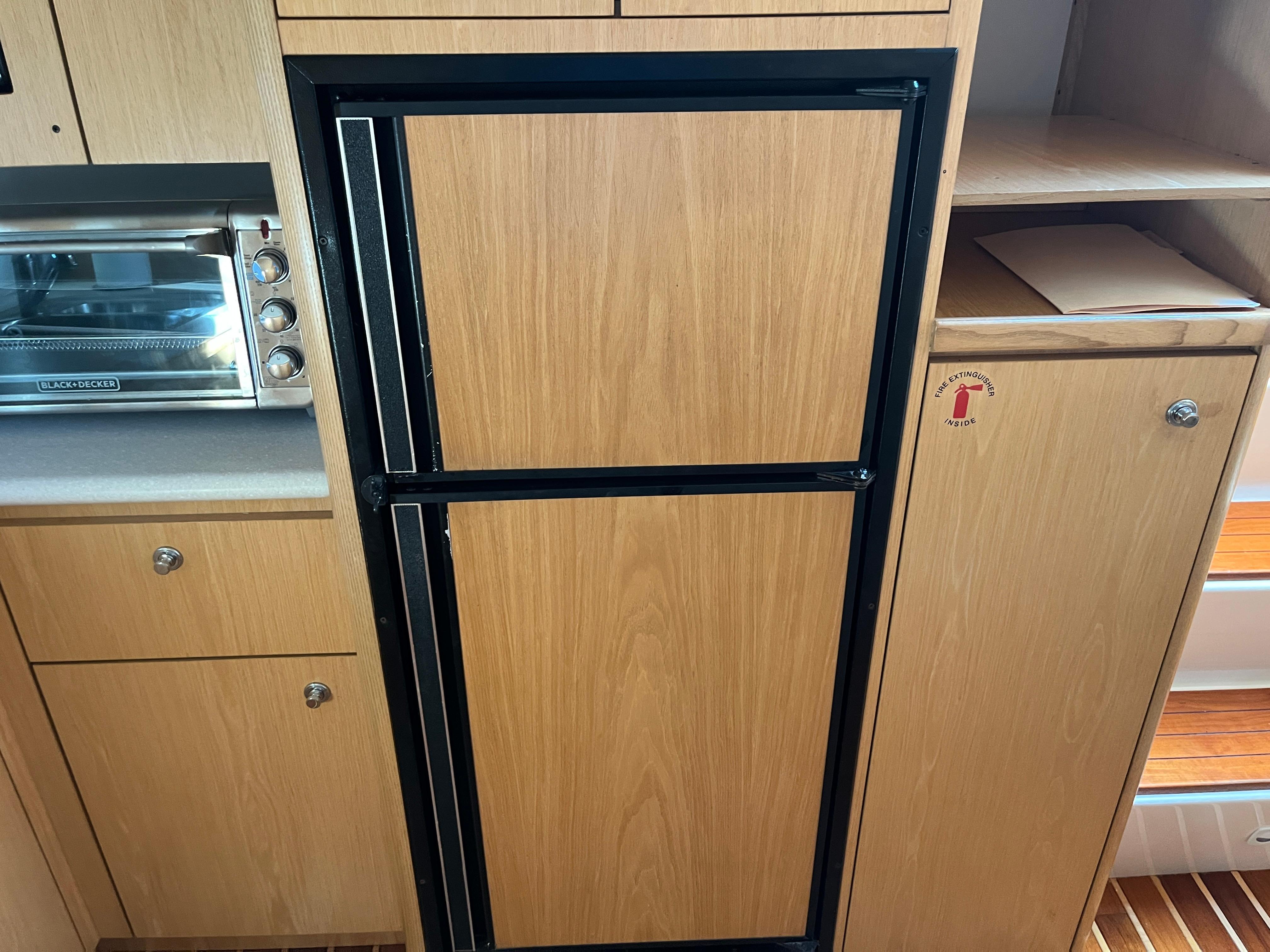 Additional DescriptionThe cabin on the 4100 is huge, featuring a queen sized pedestal berth forward with a lot of storage below. The owner's stateroom also has two hanging lockers, hullside shelves, a solid cabin door, and access to the head. The full fiberglass head provides plenty of room, and features a molded marble countertop with integrated sink and storage below. There is an upper linen storage locker with pull- out storage basket, mirrored vanity above the sink, separate shower stall with bi-fold glass door, integrated seat and shower sump pump, and full frame wood doors. The dinette is convertible to a large double berth and a pullman-style berth. The galley has Corian countertops, S.S. double sink with cover, two burner electric cooktop, built-in coffee maker, microwave convection oven, upright refrigerator and freezer, and tons of storage.