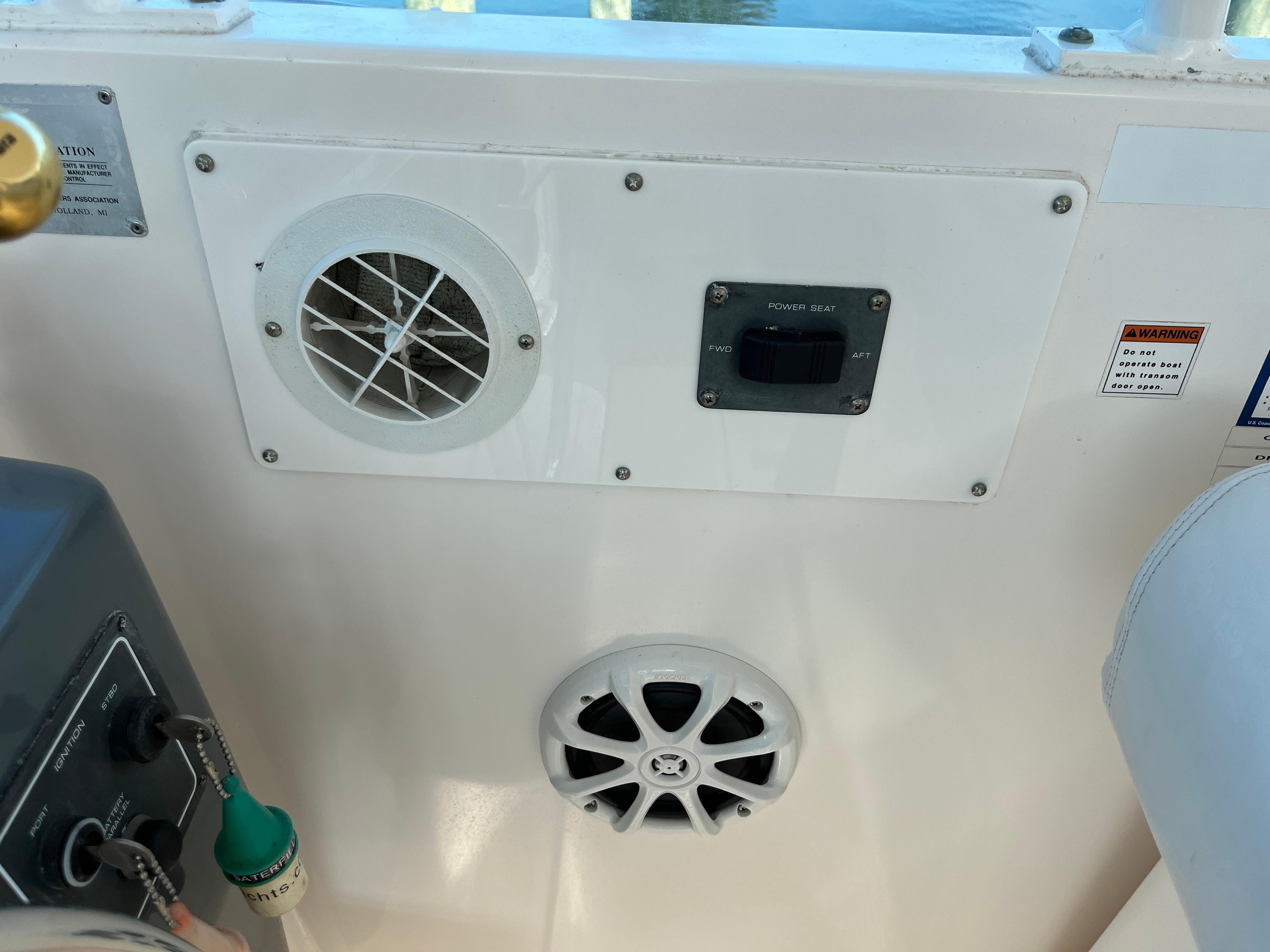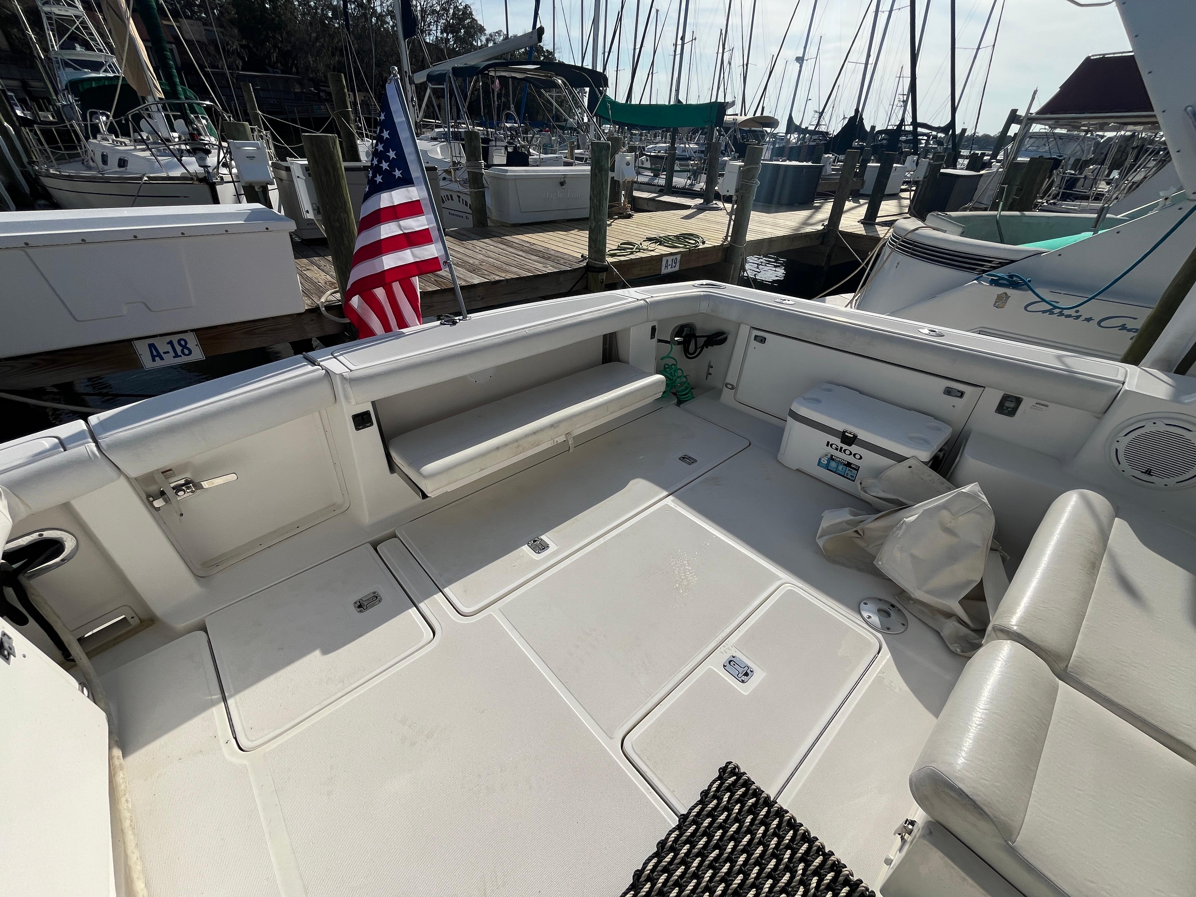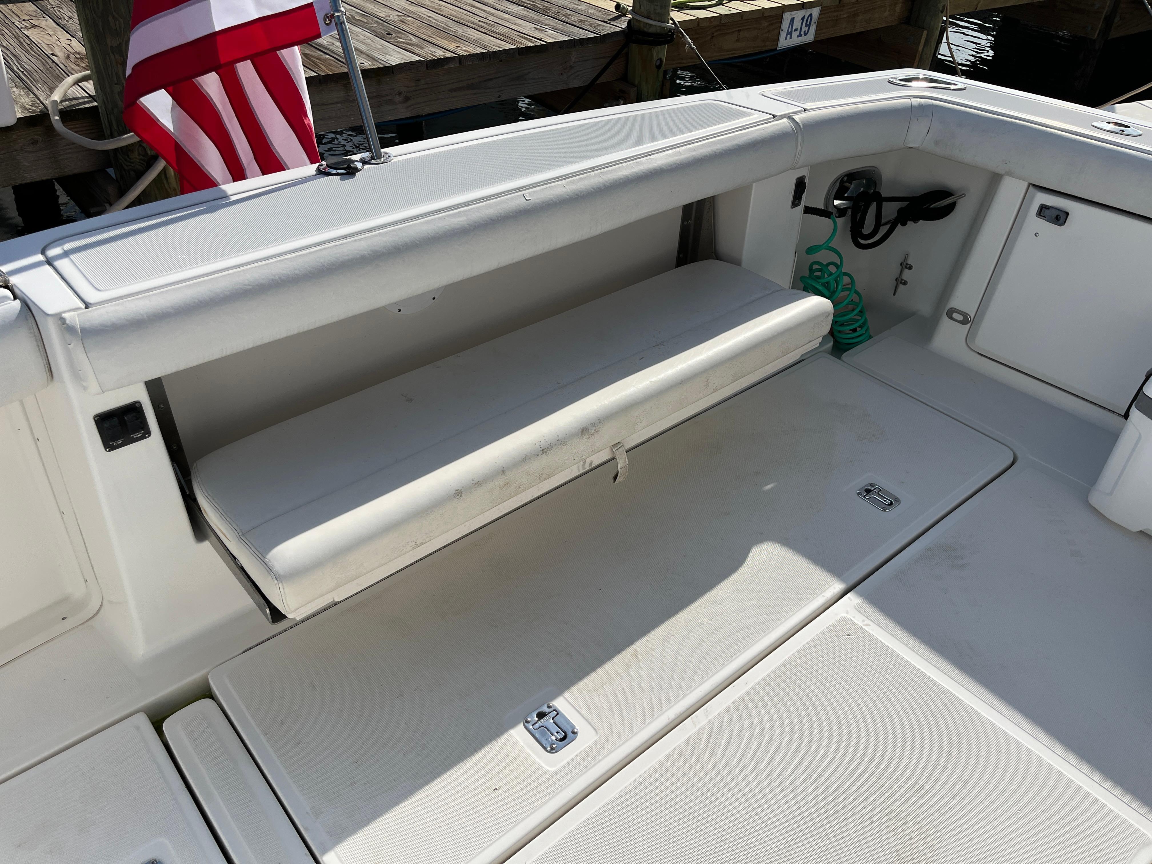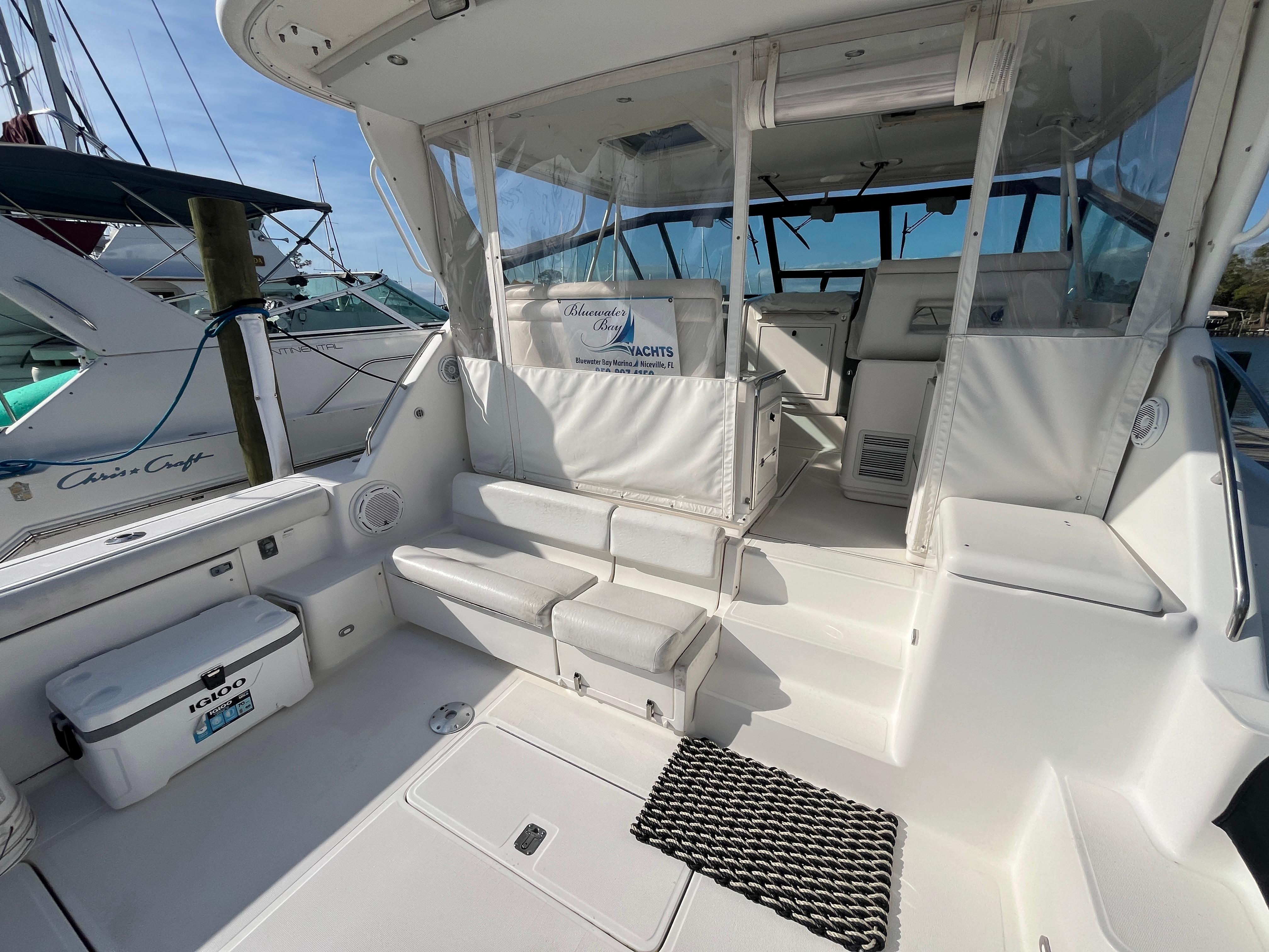 Additional DescriptionThe cockpit on the 4100 Open can be outfitted for fishing, cruising, or both. There is a 2-piece acrylic sliding companionway door with lock to the port side. At centerline is a chart flat with drink holders, lockable glove compartment, and chart book storage. The “heads up” fiberglass tilt-away helm station with drink holders and full flush mount electronics capabilities is to starboard. The oversized power helm seat has a wet bar aft, drink holders, and top loading insulated cooler. The portside curved companion seat with insulated cooler, storage, drink holders, and a hand rail is standard. Directly behind the curved lounge is an aft-facing cockpit lounge - an optional fold-down transom seat is available. The cockpit sole is reinforced for a fighting chair, and a bait and tackle prep center with circulating livewell can replace the aft facing seat for the serious angler. Flush cockpit storage boxes are standard and an additional circulating livewell with macerator can be added to one of the boxes if desired. Lockable rod storage is also an option which can be placed either port or starboard, or both. Engine room access is from either the bridge deck through a drop-down hatch or through a walk-in door in the lower cockpit. Padded cockpit bolsters, courtesy lights with remote, and molded in steps, show the attention to detail in this boat.