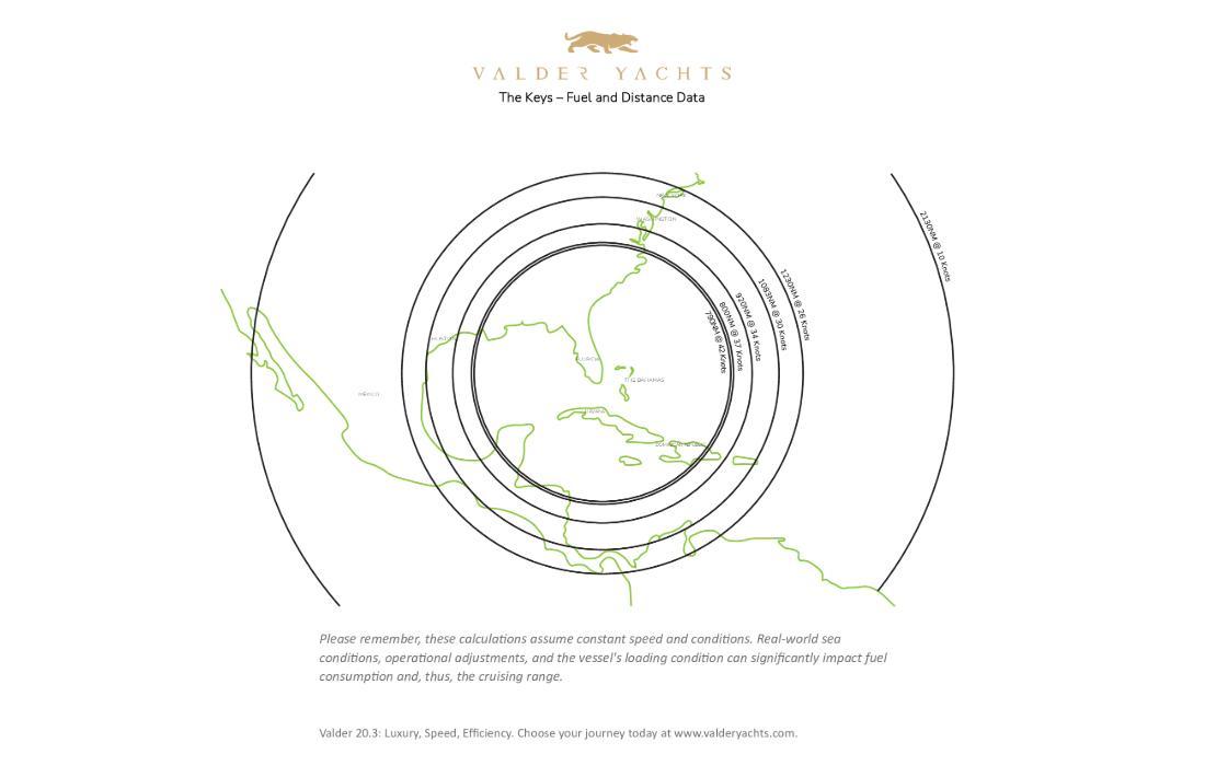 • 2000 RPM: Hit 34 knots, 10.82 L/NM. Travel 832 NM in 24 hours.