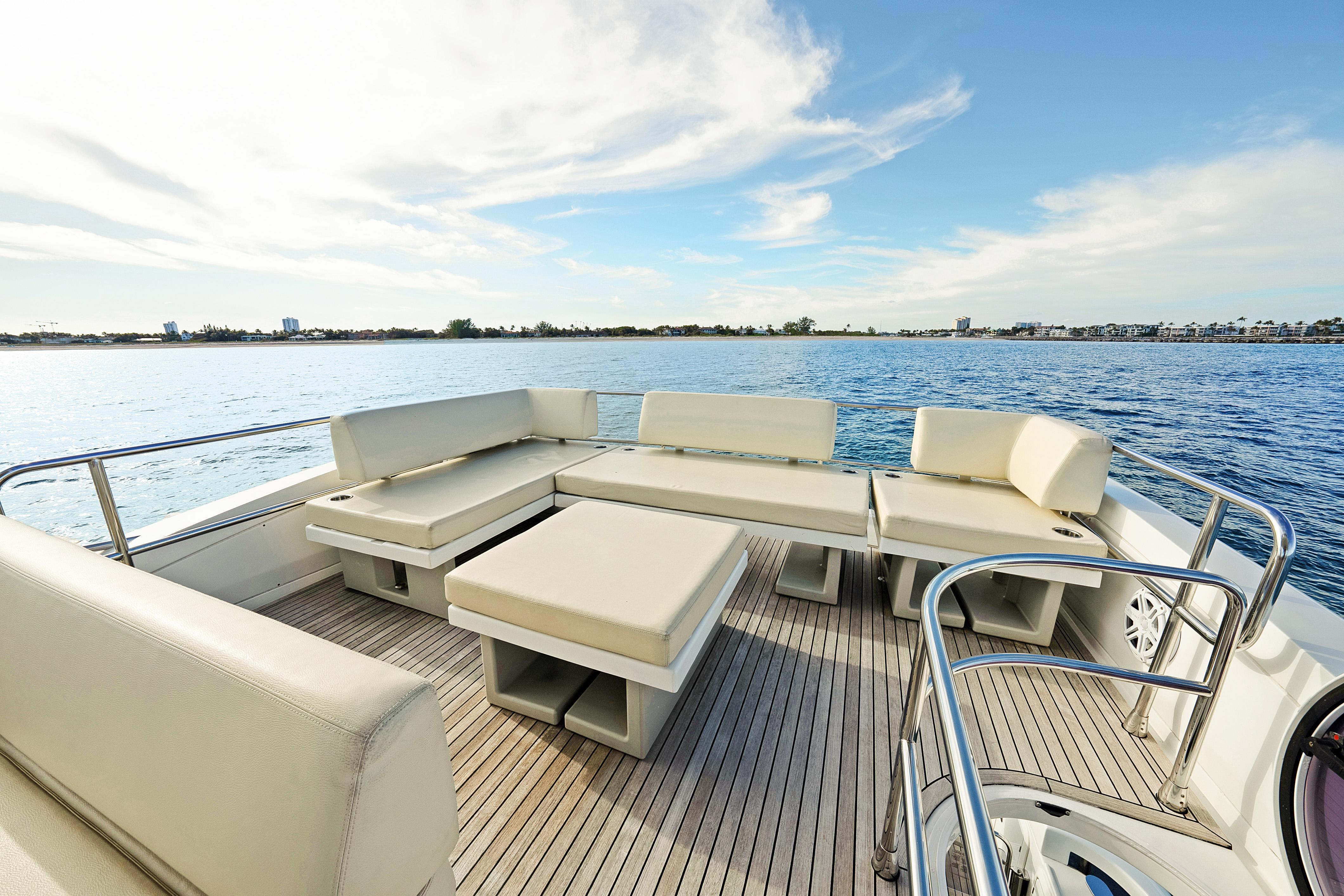 - 2-Seat helm forward of the wet bar area which includes, grill, refrigerator and sink