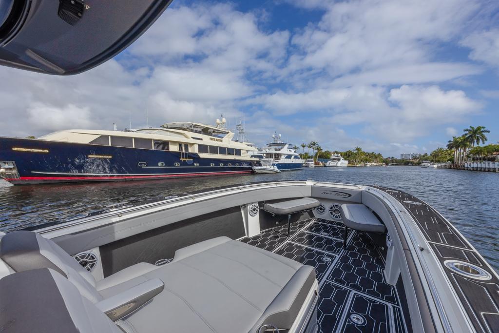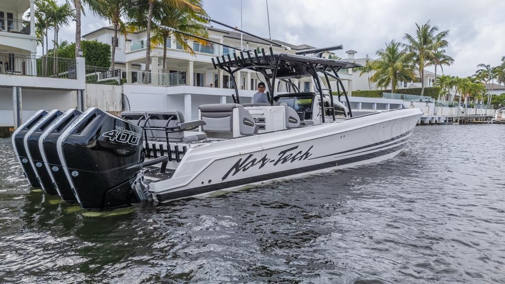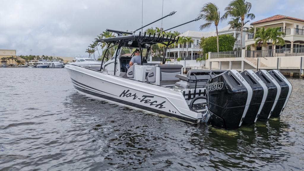Fishermen will entice even the toughest catches in the Nor-Tech 392 Superfish. Custom-built for the fisherman in mind, the 392 Superfish is a composite construction of fiberglass and Kevlar, making this one heavy, stable, and tough boat. The Superfish is a little wider at the waterline than most boats of her size and the fuel tanks are at the centerline, making for a very stable ride. Enjoy ample storage for tackle and bait, as well as a custom built-in fish station and tuna tubes. The entire single-level cockpit is self-draining via and under-deck plumbing system glassed into the cockpit liner. Quad Mercury 400R engines give you the speed you want for any excursion or fishing tournament. Run your boat hard and be part of a known Mercury service network to get back on the water in time for the next tournament.