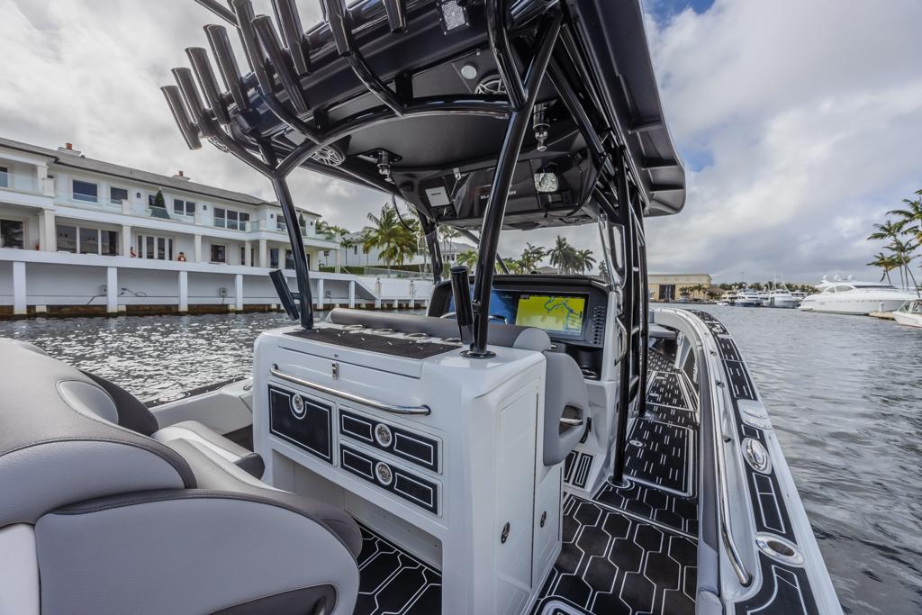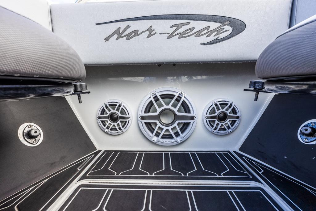 Serious anglers will appreciate the efforts Nor-Tech took to create the finest sea chest pump system ever developed on a fishing boat. At the transom, there are two 65 gallon live wells and built-in tuna tubes. Rod holders are located throughout the boat, from bow to stern. A removeable tower encourage you to reel in the biggest catch possible. The 392 Superfish has one of the most comfortable pilot and co-pilot seats, inspired by seats found in race cars for ultimate comfort and security. From the pilot seat, you’ll feel cared for with navigation screens and an ergonomically designed steering column.
