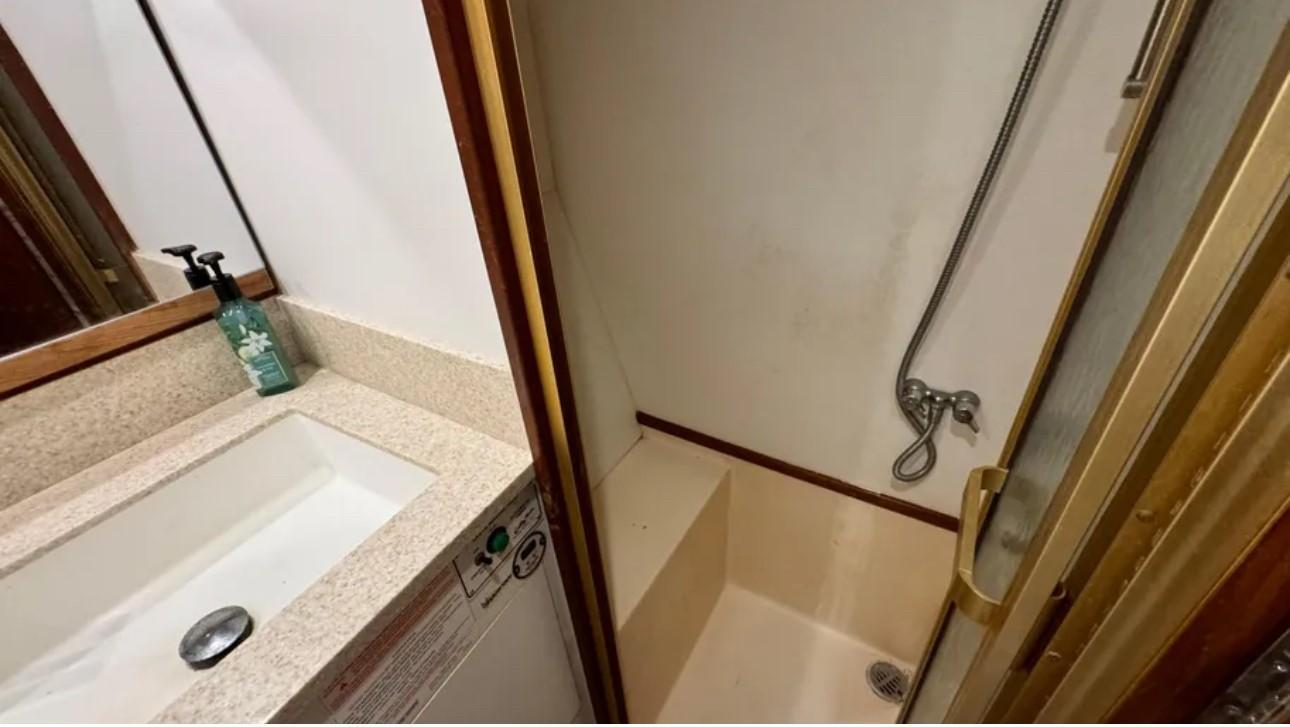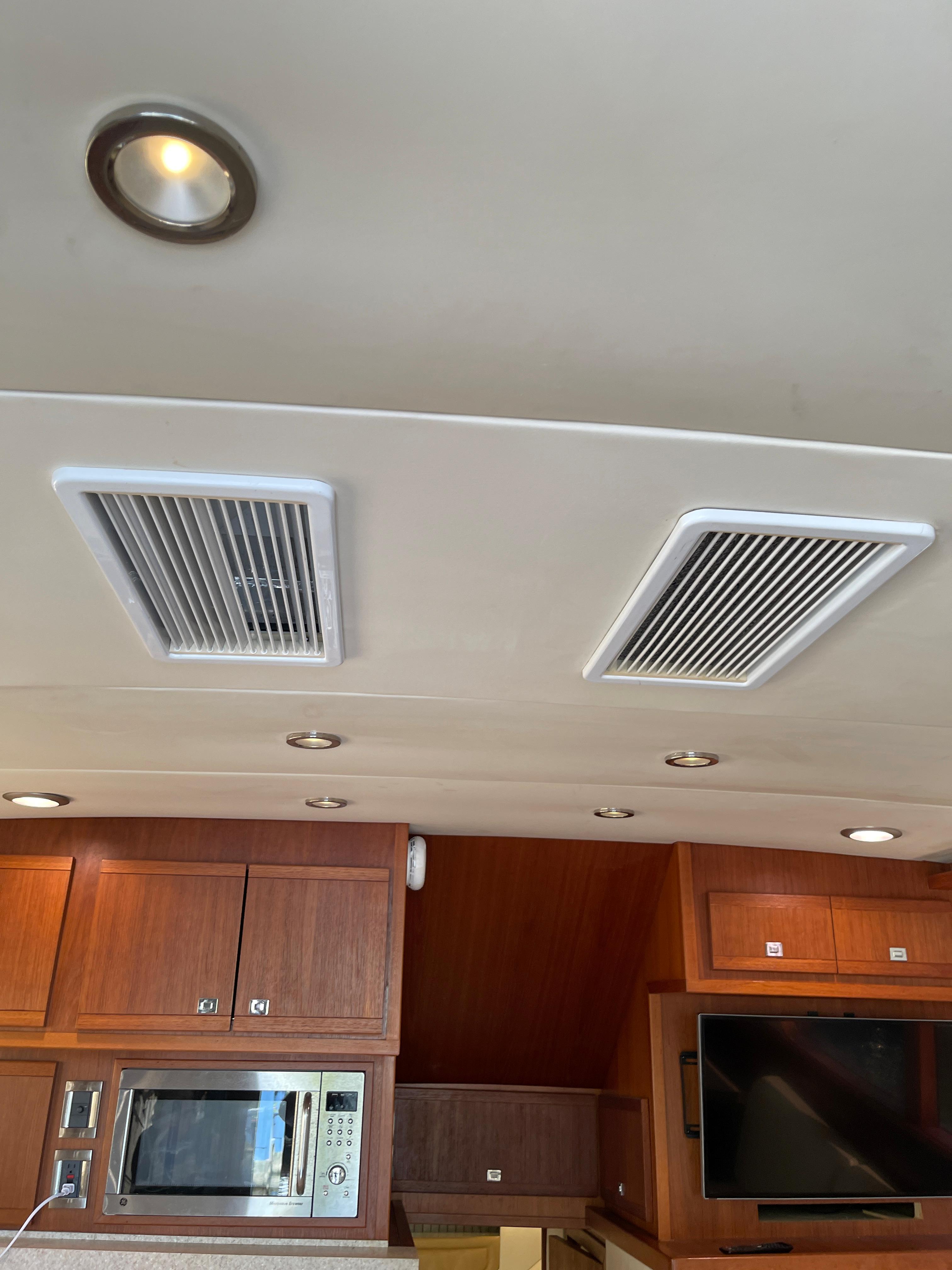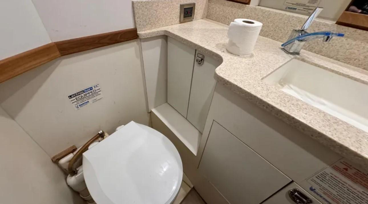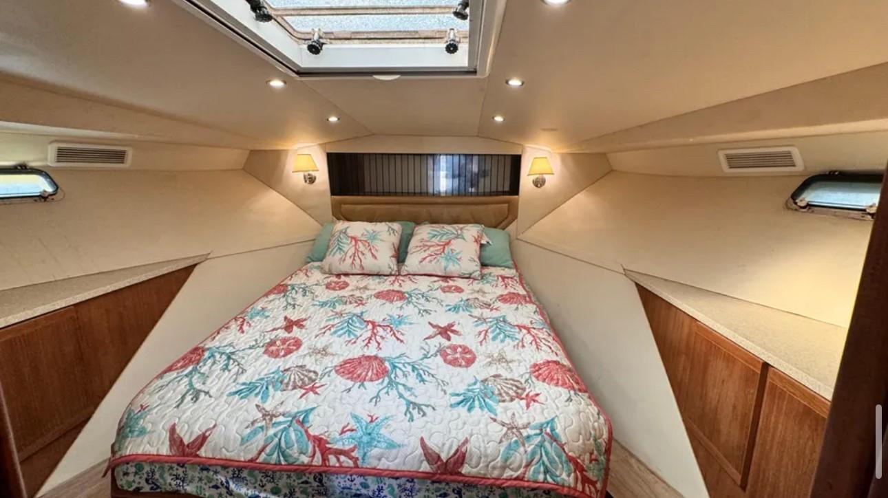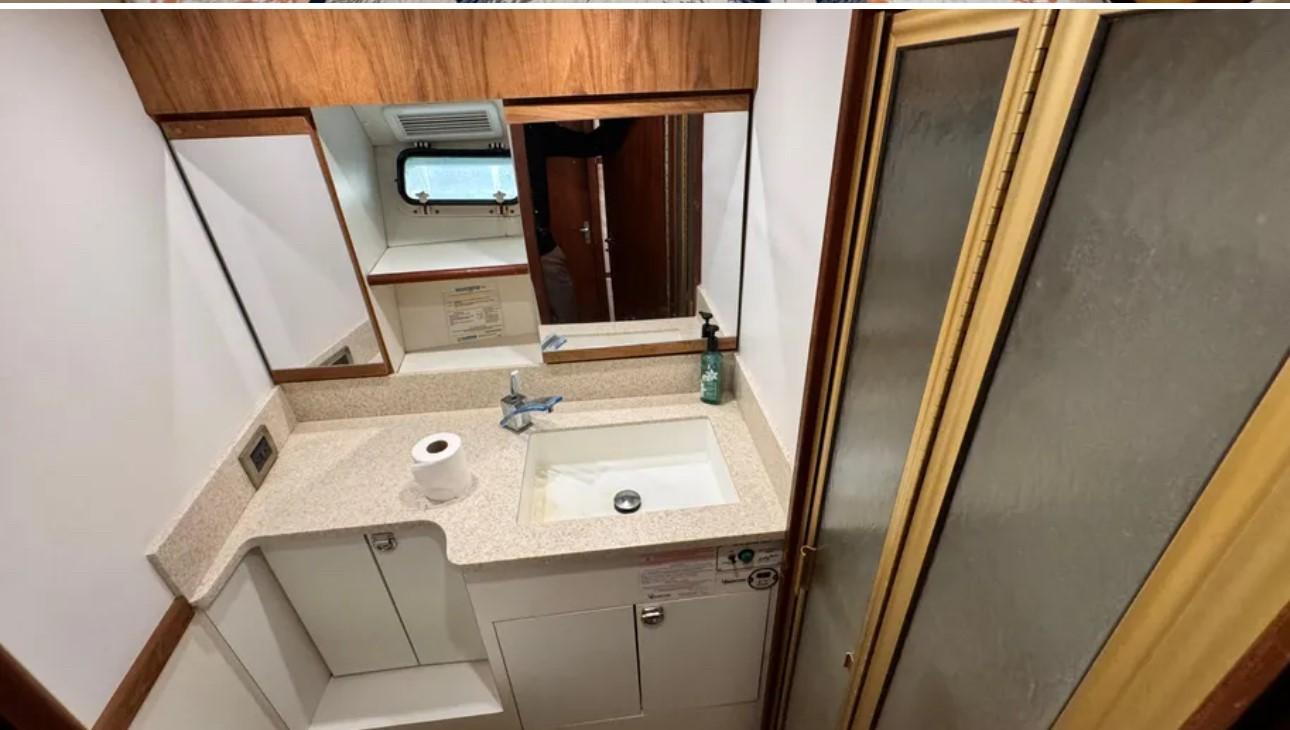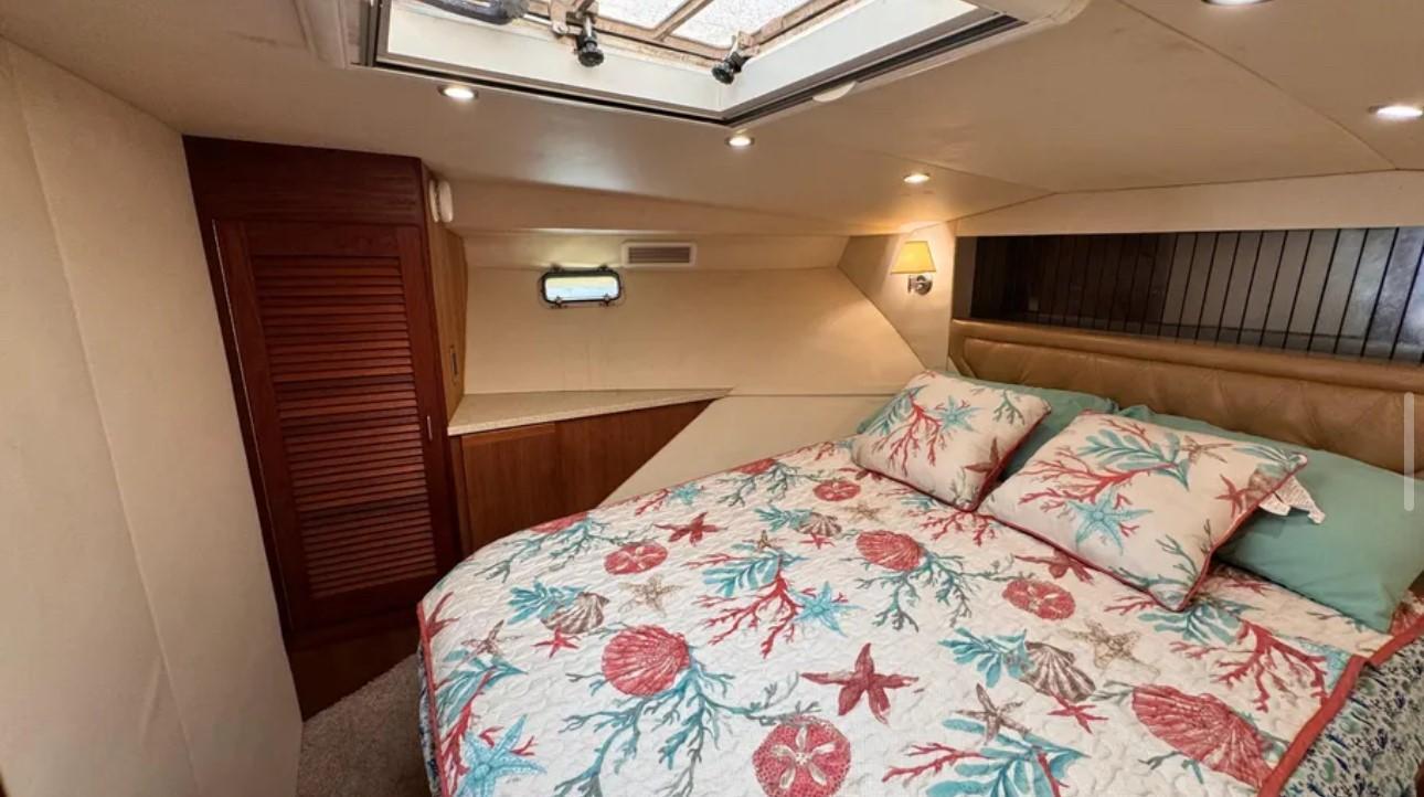 Features a center queen bed with ample storage under an on both sides of the bed. The Master Stateroom Head features a full stand up shower.