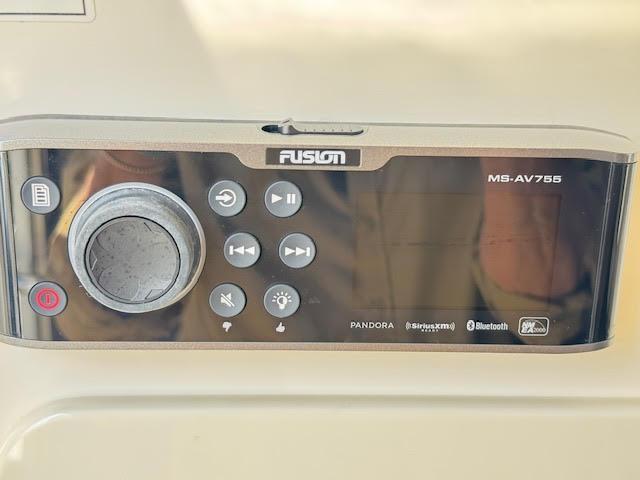 - Stereo – Fusion color LCD, iPod/iPhone dock audio, AM/FM/USB audio/VHF/WX/Sirus XM TM ready, JL Audio waterproof speakers (6), amplifier (1), bow mounted remote control (1), MP3 inputs and 12-V receptacle in glove box and sun lounge armrest (2) (Fusion integration into Raymarine with Navigation Package) (Fusion Bluetooth enabled)