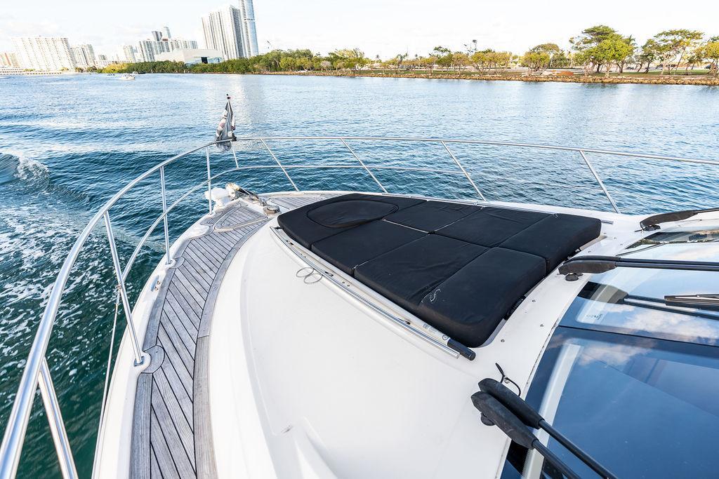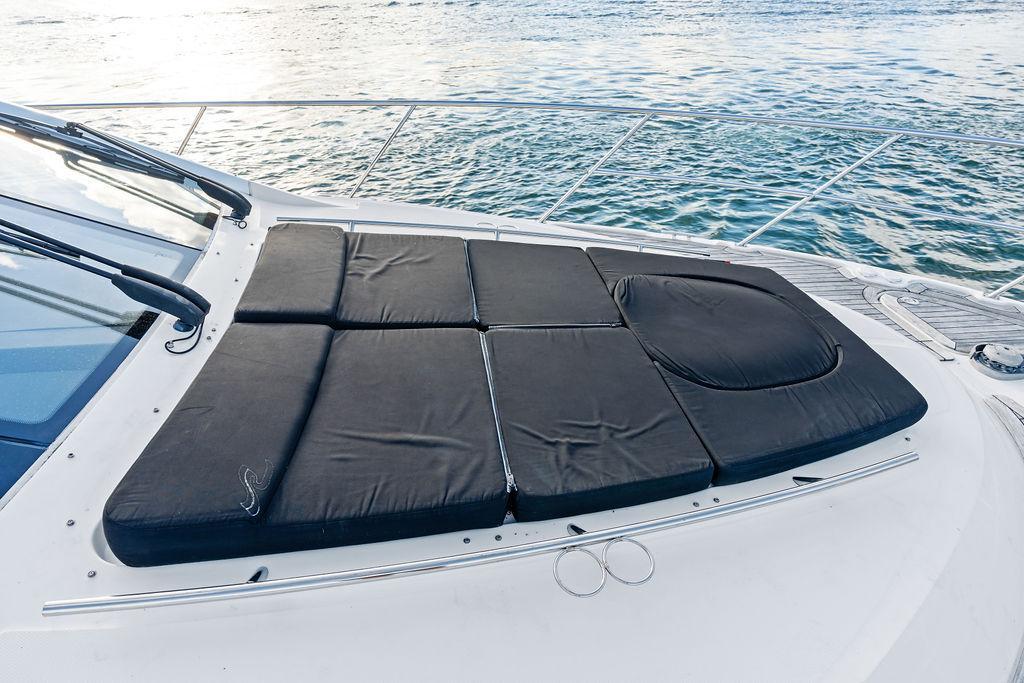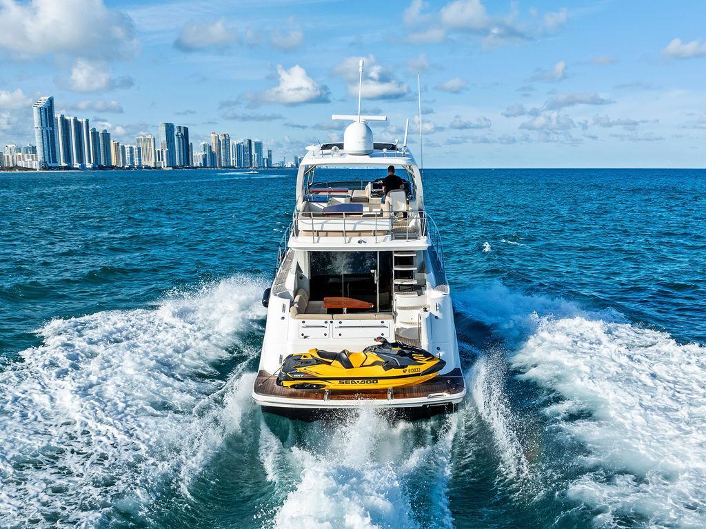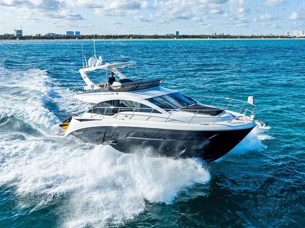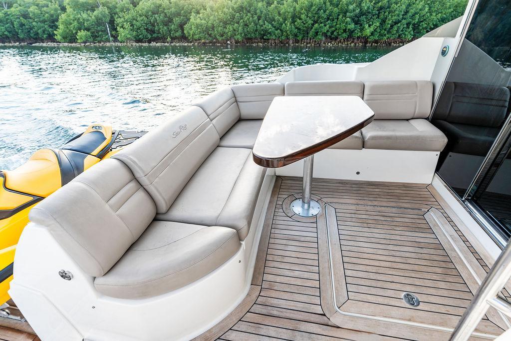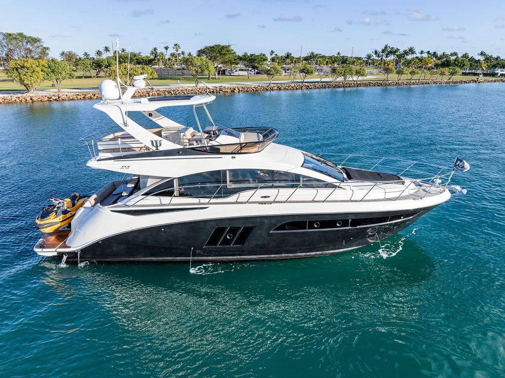 The Sea Ray 510 Fly was designed for comfort and performance. It features a sleek, contemporary exterior with sharp lines and a spacious layout ideal for both entertaining and relaxing on the water. The 510 Fly has a striking profile with an extended cockpit perfect for alfresco dining, a large hydraulic swim platform, and wide side decks that make moving around easy. The flybridge is one of its standout features, offering panoramic views, an abundance of seating at the U-shaped dinette, a sunpad for lounging, a wet bar, and a helm station for piloting from above.Inside, the 510 Fly offers a bright and airy salon with large windows, creating an open, airy feel. The interior is finished with high-quality materials such as rich woods, plush seating, and stainless steel accents. The salon area is equipped with a well-appointed entertainment system and a dining area. Below Deck, the 510 has a three-cabin, two-head layout, offering a full-beam primary stateroom amidships with an ensuite head and shower. The VIP stateroom is located forward, and the third stateroom is equipped with twin beds. The galley is positioned down below, offering modern appliances and plenty of storage. Powered by twin 600 h.p. Cummins QSC 8.3 Zeus pods, the 510 Fly delivers a smooth and responsive cruising experience. Effortlessly cruising 26 knots, makes it ideal for both leisurely cruising and faster trips.Overall, the 2015 Sea Ray 510 Fly is an elegant, spacious yacht with an emphasis on both performance and comfort, making it perfect for long-distance cruising or entertaining guests. Sea Doo not included in sale. Key FeaturesSeakeeper Watermaker Real Teak decks Wine refrigerator in third cabin Upgraded swim platform suitable for lifting a 1,000lb jet skiExpansive bridge layout with multiple seating, lounging and dining areasLuxurious full beam master stateroom with multiple configurationsSocial zone design with galley up and featuring continuous cockpit / salon interactionV-Drive w/Digital Throttle & Shift or optional Zeus Propulsion with joystick controlStandard three stateroom layout and two full heads, each with separate showersStandard, fully complemented, upper & lower helm stationsStandard Raymarine® e125 Radar/Chartplotter combo at lower control station