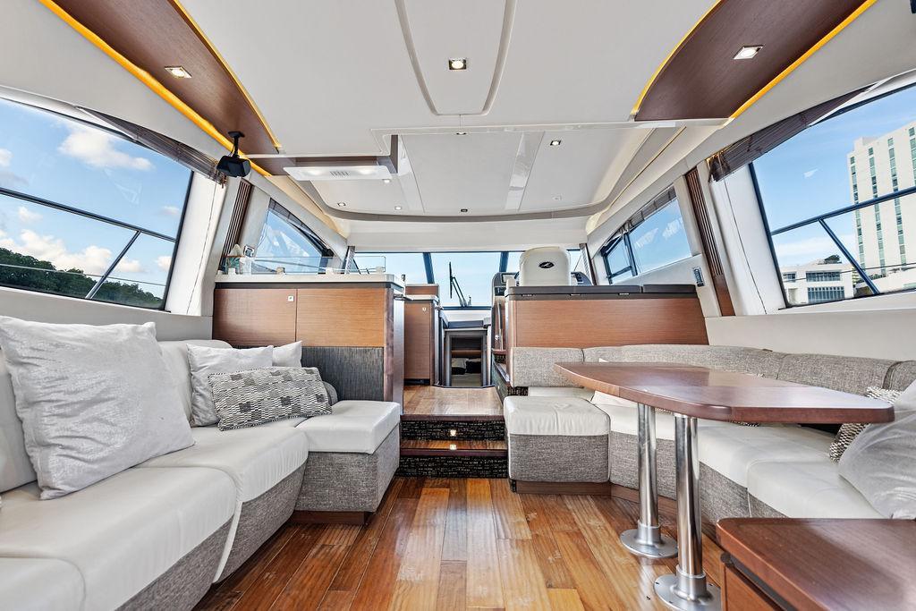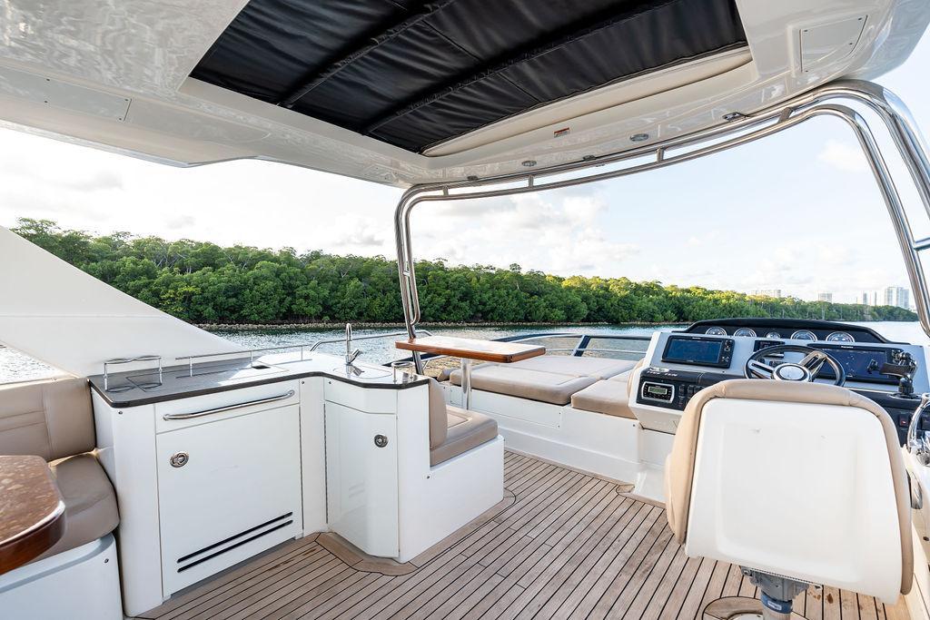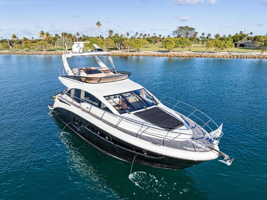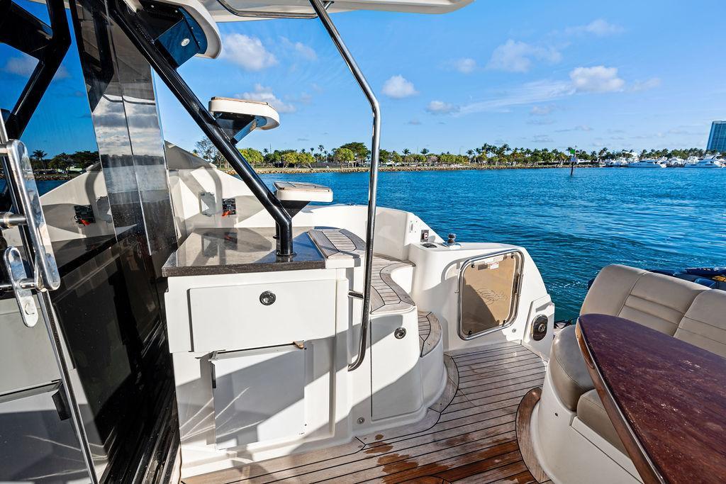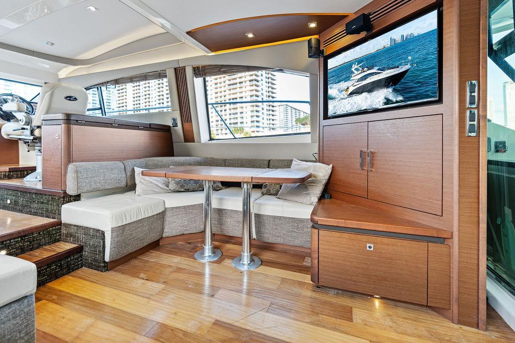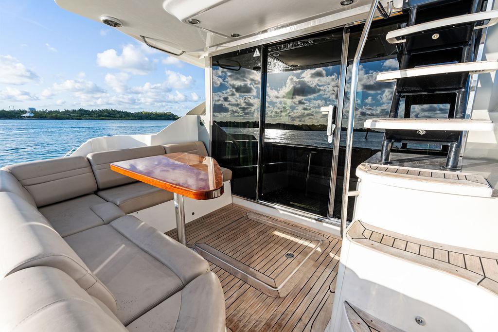 The Sea Ray 510 Fly was designed for comfort and performance. It features a sleek, contemporary exterior with sharp lines and a spacious layout ideal for both entertaining and relaxing on the water. The 510 Fly has a striking profile with an extended cockpit perfect for alfresco dining, a large hydraulic swim platform, and wide side decks that make moving around easy. The flybridge is one of its standout features, offering panoramic views, an abundance of seating at the U-shaped dinette, a sunpad for lounging, a wet bar, and a helm station for piloting from above.Inside, the 510 Fly offers a bright and airy salon with large windows, creating an open, airy feel. The interior is finished with high-quality materials such as rich woods, plush seating, and stainless steel accents. The salon area is equipped with a well-appointed entertainment system and a dining area. Below Deck, the 510 has a three-cabin, two-head layout, offering a full-beam primary stateroom amidships with an ensuite head and shower. The VIP stateroom is located forward, and the third stateroom is equipped with twin beds. The galley is positioned down below, offering modern appliances and plenty of storage. Powered by twin 600 h.p. Cummins QSC 8.3 Zeus pods, the 510 Fly delivers a smooth and responsive cruising experience. Effortlessly cruising 26 knots, makes it ideal for both leisurely cruising and faster trips.Overall, the 2015 Sea Ray 510 Fly is an elegant, spacious yacht with an emphasis on both performance and comfort, making it perfect for long-distance cruising or entertaining guests. Sea Doo not included in sale. Key FeaturesSeakeeper Watermaker Real Teak decks Wine refrigerator in third cabin Upgraded swim platform suitable for lifting a 1,000lb jet skiExpansive bridge layout with multiple seating, lounging and dining areasLuxurious full beam master stateroom with multiple configurationsSocial zone design with galley up and featuring continuous cockpit / salon interactionV-Drive w/Digital Throttle & Shift or optional Zeus Propulsion with joystick controlStandard three stateroom layout and two full heads, each with separate showersStandard, fully complemented, upper & lower helm stationsStandard Raymarine® e125 Radar/Chartplotter combo at lower control station