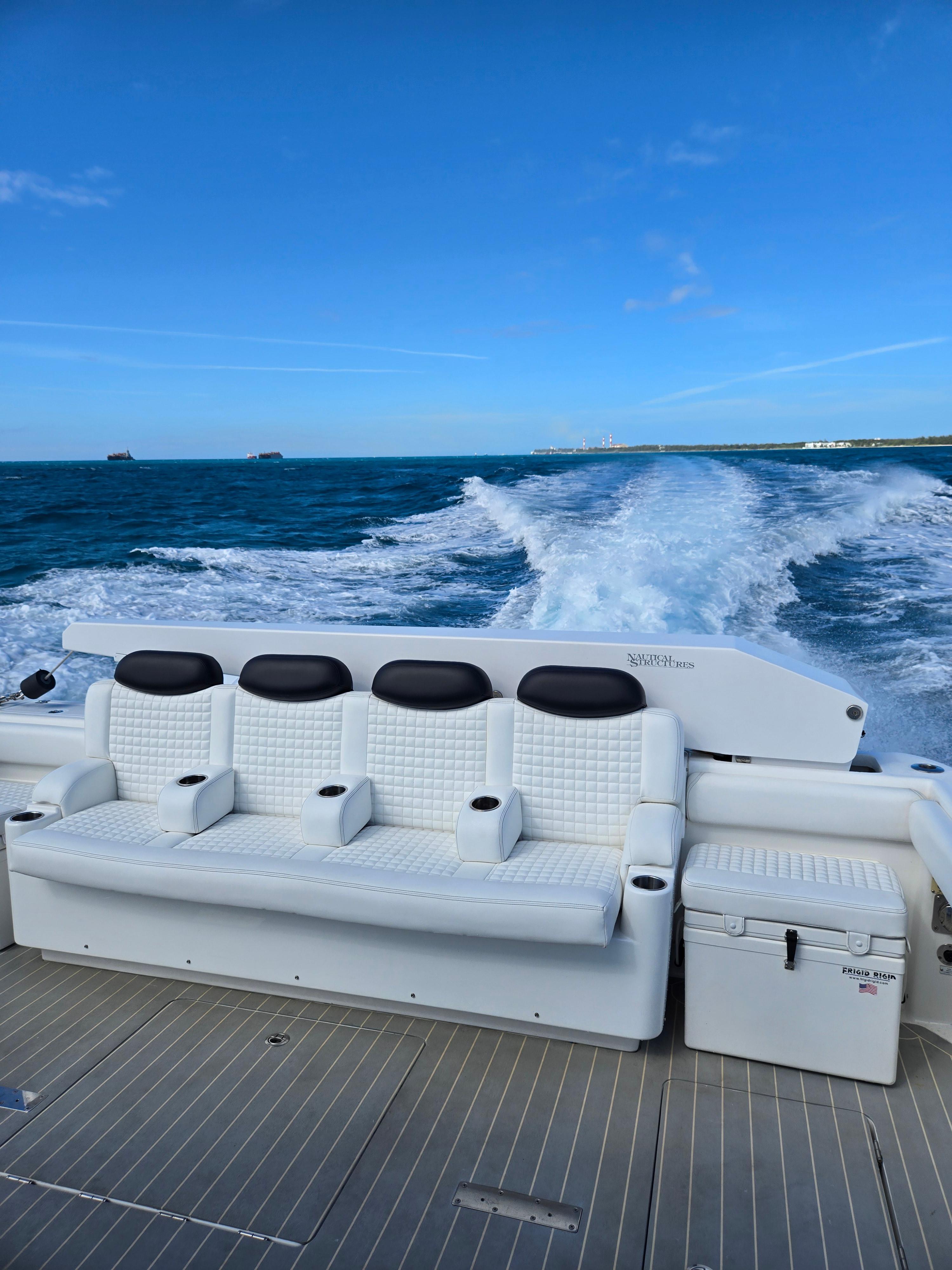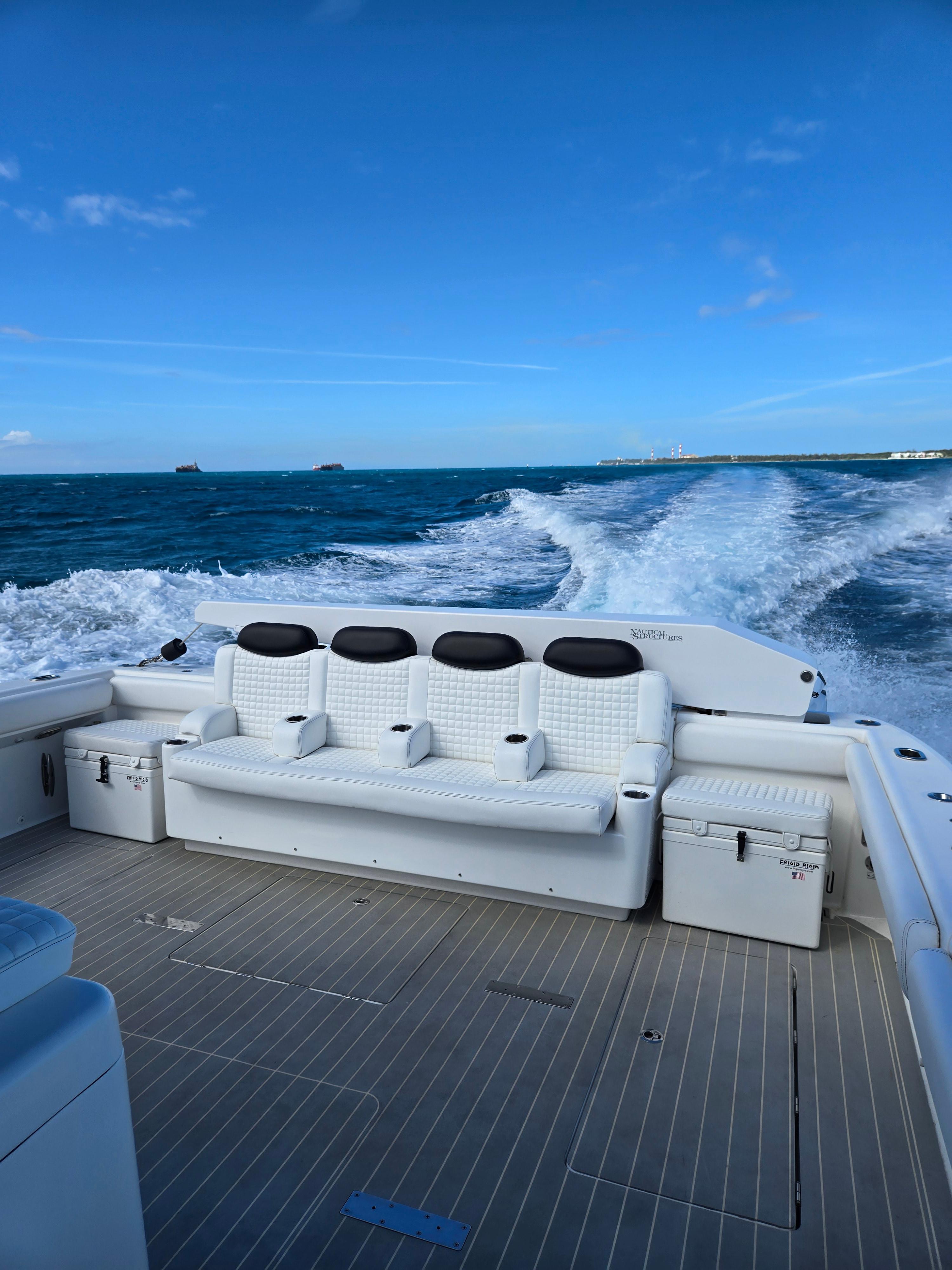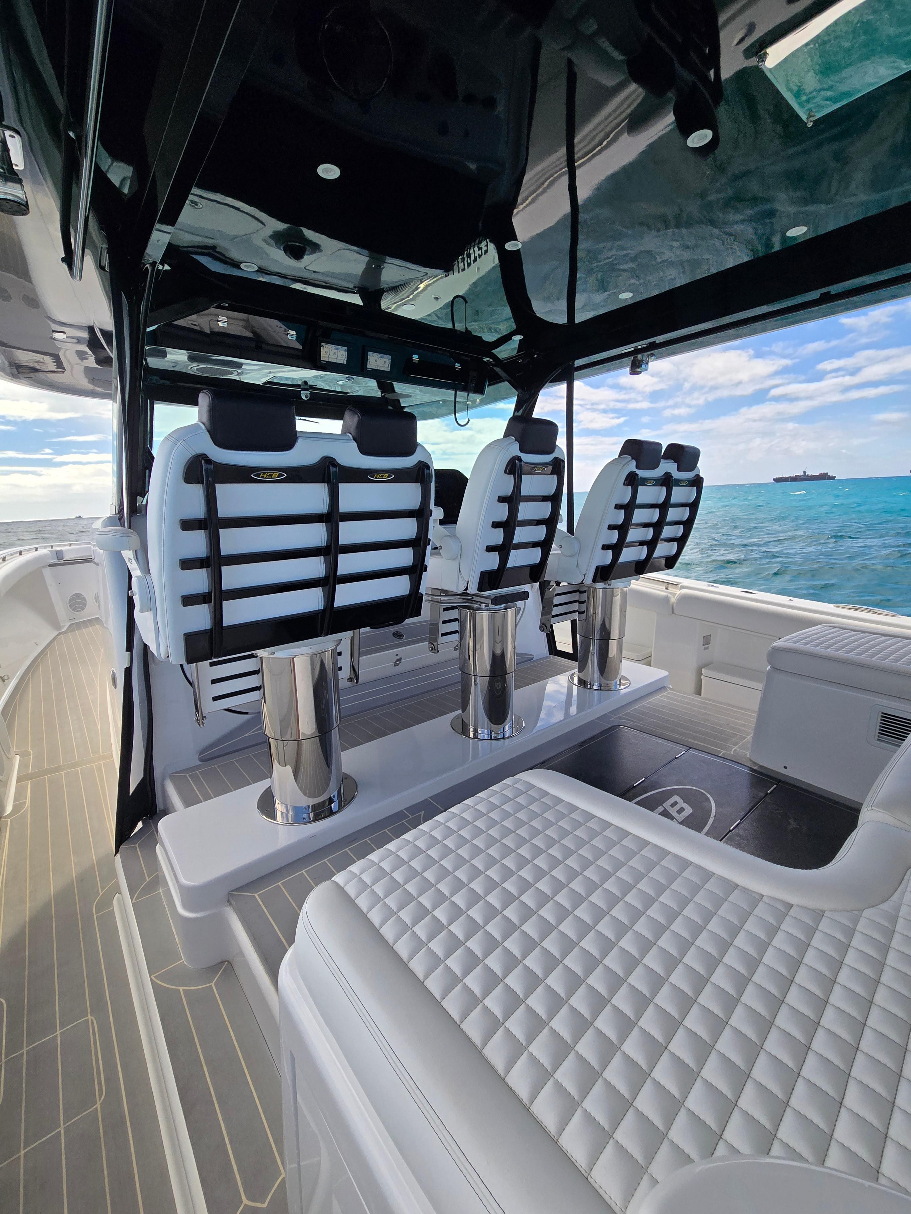 Seating - Transom Cooler Seats, 28 Qt, Port and Starboard with Cushions and Backrests Seating - Helm Chairs for 5 with Swivel and Vertical Adjustment; Fold Down Footrests and Custom Ladder Backs