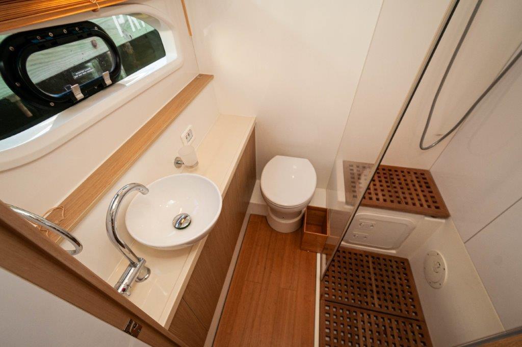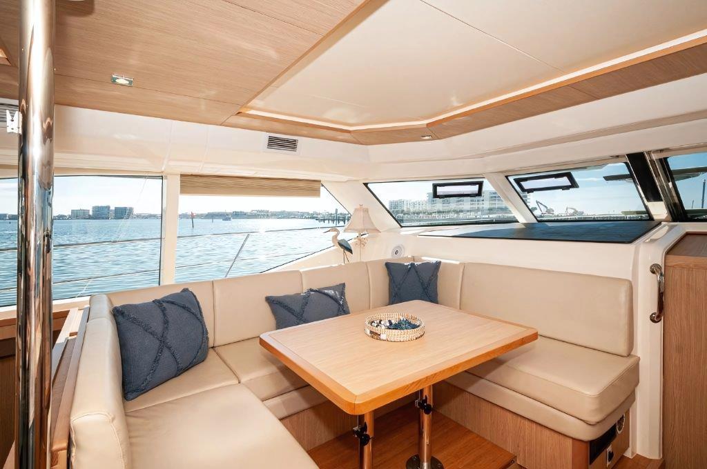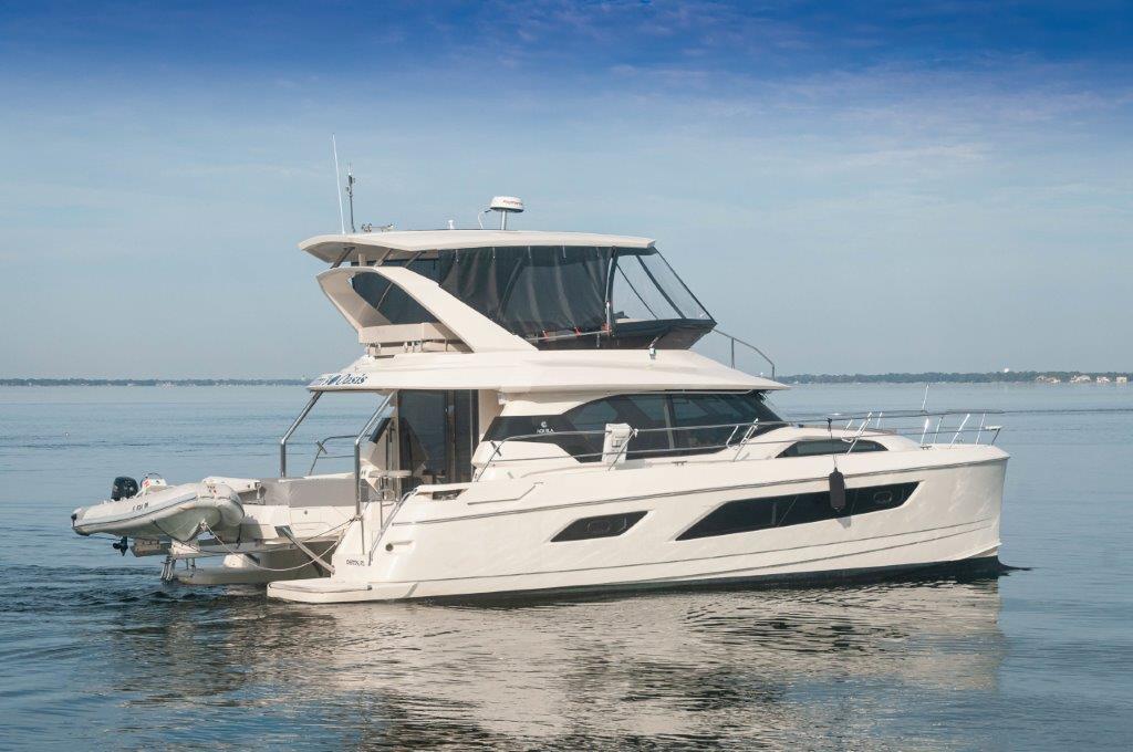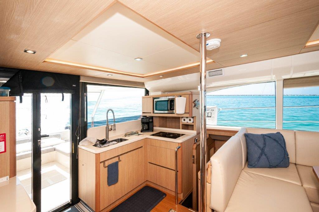 This 2018 Aquila 44 Catamaran, named "Mimi's Oasis", has NEVER been in charter service, which is a key advantage for discerning buyers. It features a spacious interior typically found in larger yachts, with a full-beam primary stateroom and two guest cabins, each equipped with private heads and enclosed showers. This Catamaran includes a second helm station on the flybridge, providing better visibility for docking, along with approximately $60,000 in upgrades and social seating areas. Storage is abundant throughout the vessel, with large lockers ideal for lines and luggage. The boat is powered by engines in each hull for easy maneuverability, and it also comes with a center console tender and a watermaker for extended trips. "Mimi’s Oasis" offers a range of features and options, making it an exceptional choice for serious cruising. The spacious salon and galley area includes modern appliances, a high-low table with very comfortable U-shaped seating for six adults. The table can be lowered and will then accommodate a cushion (included) that can then sleep an additional two people. Overall, "Mimi's Oasis" is highly equipped for serious cruising and ready for viewing.