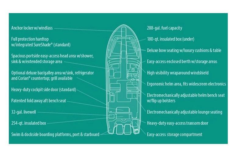 - Hardtop - integrated hardtop w/painted aluminum frame, storage net, LED spreader lights, tri-colored (red, blue, white) LED recessed lights (6), flush mount electronics area, hatch, side mounted rod holders (4), outrigger plates, side curtains (ivory) & SureShade® electrically retractable shade w/Sunbrella® canvas (oyster)