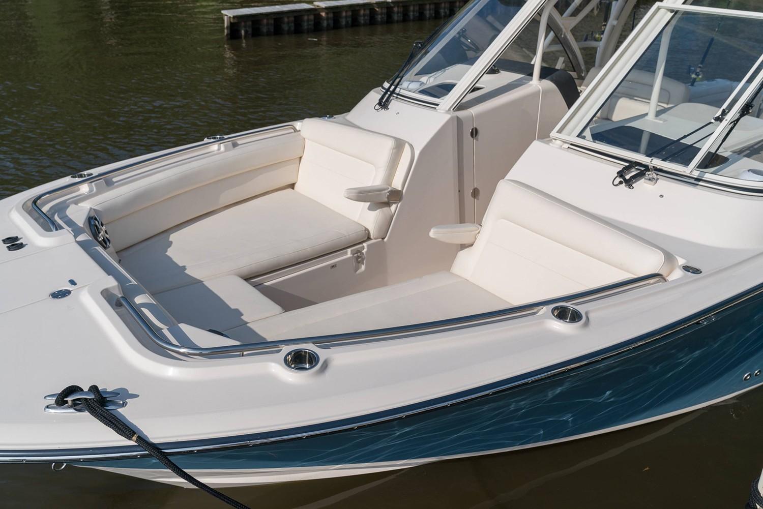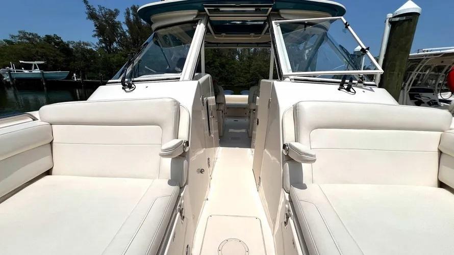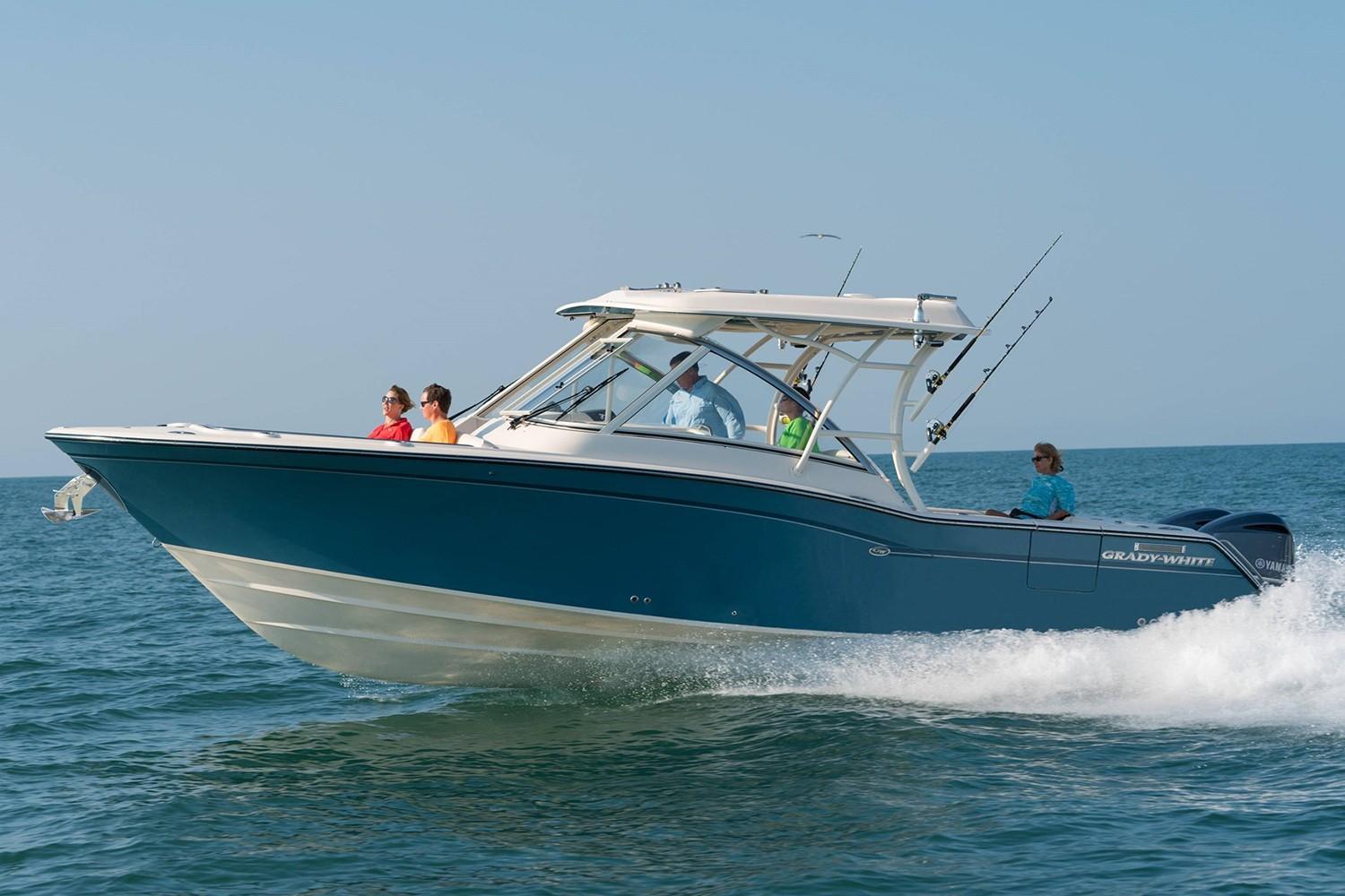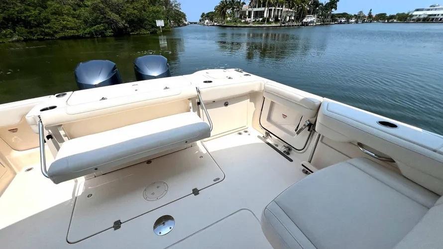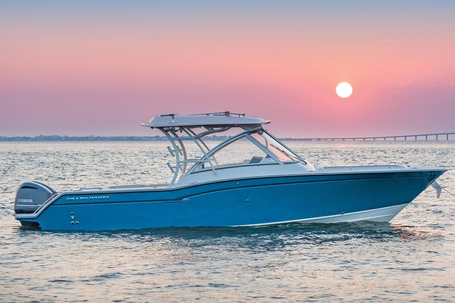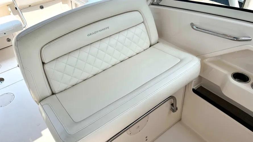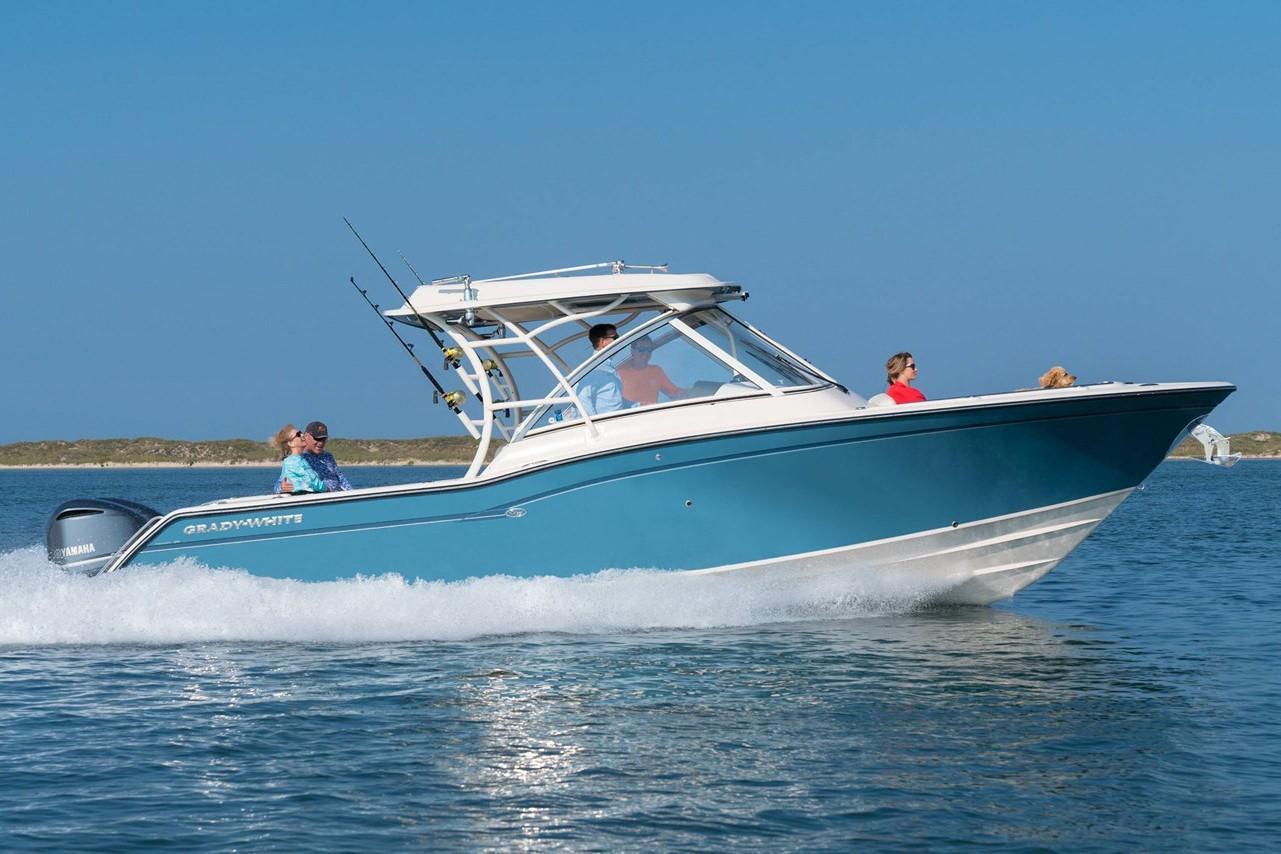 2019 Grady-White Freedom 325 powered by twin Yamaha F300 motors with digital electronic controls and 361 hours of use. Gorgeous Seaport Blue full hull color, bow thruster, twin 16" SIMRAD displays with radar, VHF radio and more. Great layout with plentiful cushioned seating under a large hard top and the comfort of a full windshield. Grady-White has the best running hull in the business with the softest ride you will find. Call Cannons Marina today for more information. Grady-White presents the 32-foot Freedom 325, an incredibly versatile favorite for offshore fishing and all-around coastal cruising and entertaining. This beamy, spacious, super high quality dual console boat features roomy consoles with a very easy-to-access head, shower and berth, plus a standard hardtop, livewell, and standard side access and transom doors. Optional generator, air conditioning, and wet bar with refrigerator. Luxurious seating, port and starboard swim platforms—the Freedom 325 combines the incomparable SeaV2® ride with all-day, all-play comfort and function.