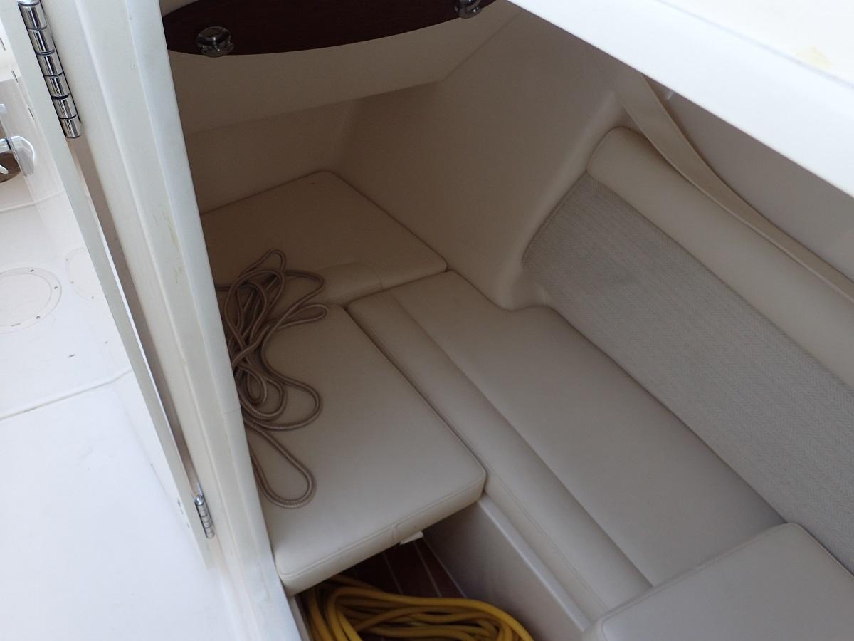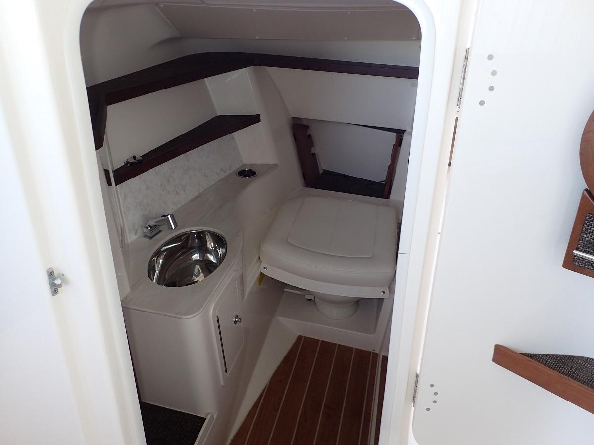 - Portside console w/sink, cedar lined storage closet, indirect lighting, extended storage area, fold down seat w/cushion & VacuFlush® head w/freshwater supply, 10-gallon (38 l) holding tank, overboard discharge & deck pump out