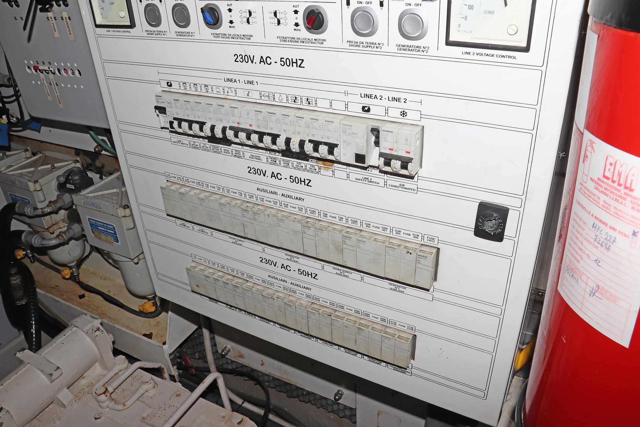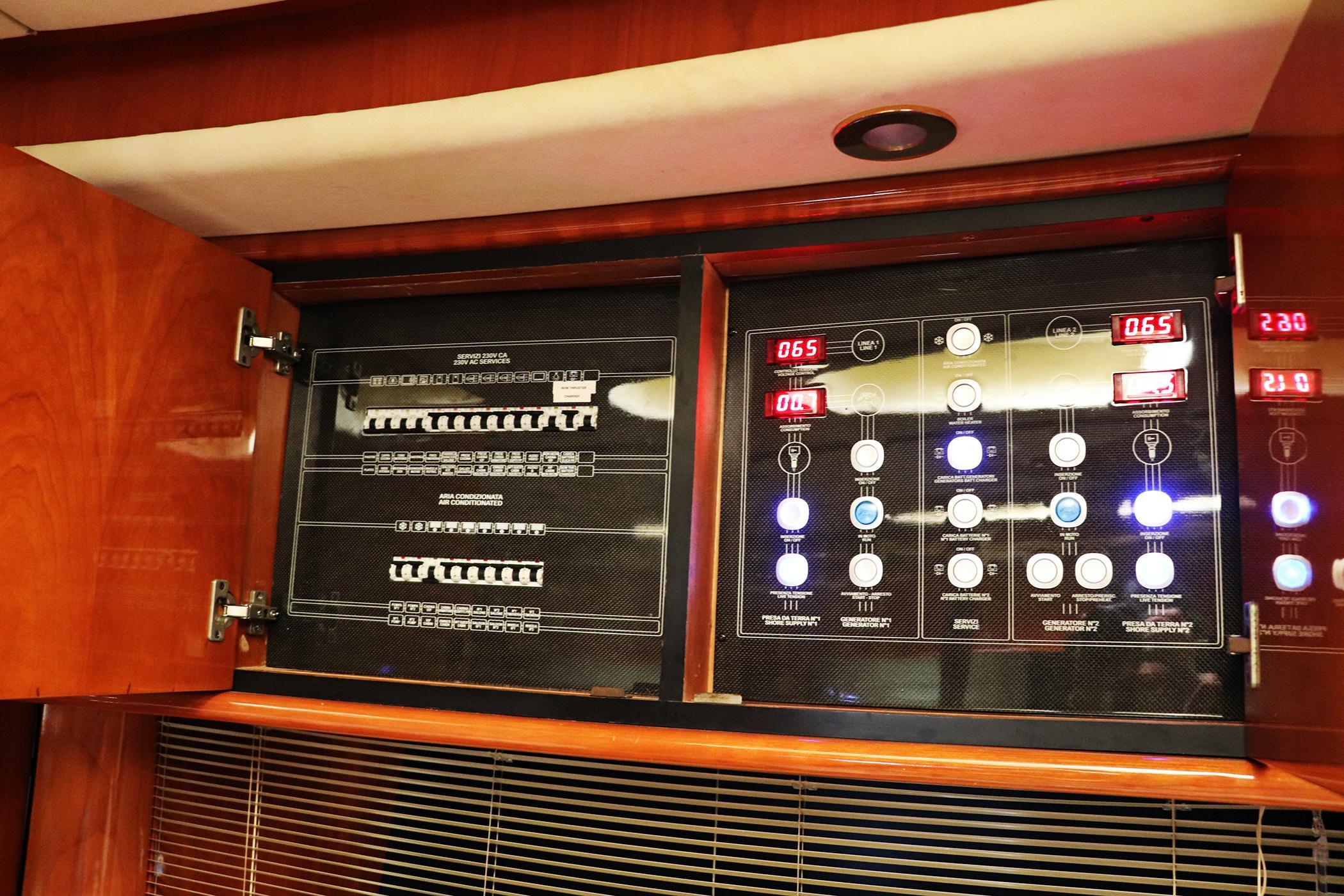 OTHERS: Wheelhouse controls: horn, water level, depth analog gauge, magnum energy charger control, trim tabs level indicator, clock, light switches, bilge pumps, deph sounder, windlass up/down, anchor and navigation lights, engine room blowers, windshield wipers and wash, trim tabs.