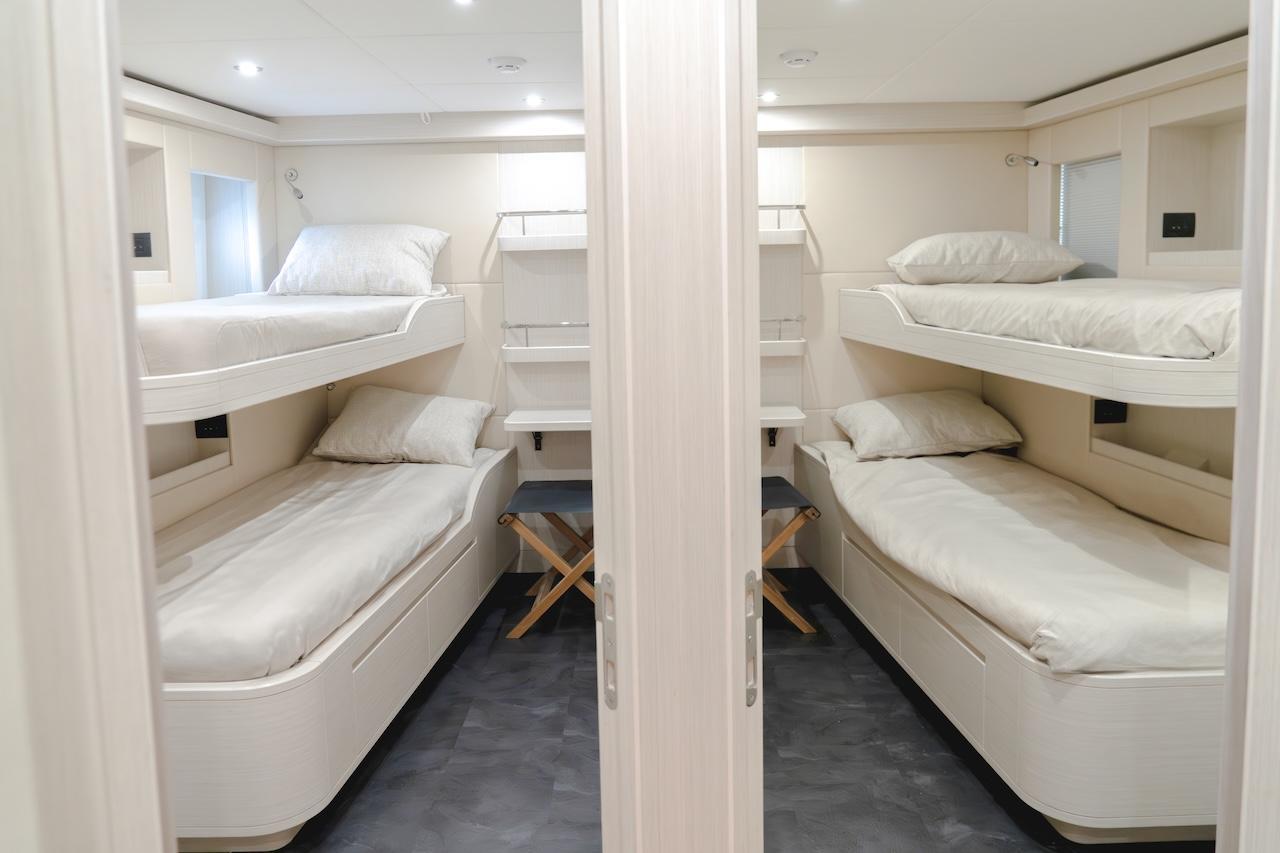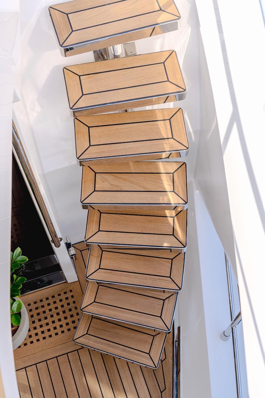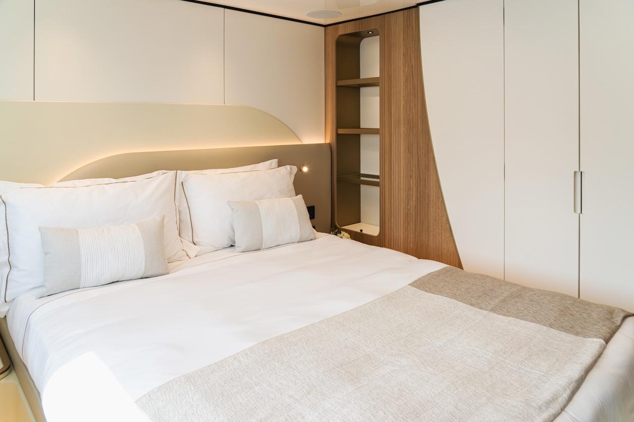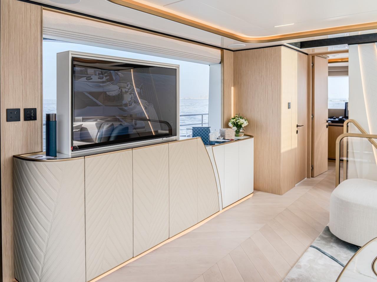 Expansive glass skylights bathe the yacht in natural light, enhancing its open and airy ambiance while creating a seamless indoor-outdoor connection. The yacht's thoughtfully curated interior design balances form and function, ensuring an unparalleled level of comfort. Floor-to-ceiling patio doors frame the expansive entertainment and dining areas, providing breathtaking views and an immersive ocean experience. The owner’s stateroom, a true sanctuary of privacy and elegance, features a private terrace with stunning 270-degree views, setting the stage for unforgettable moments on board.