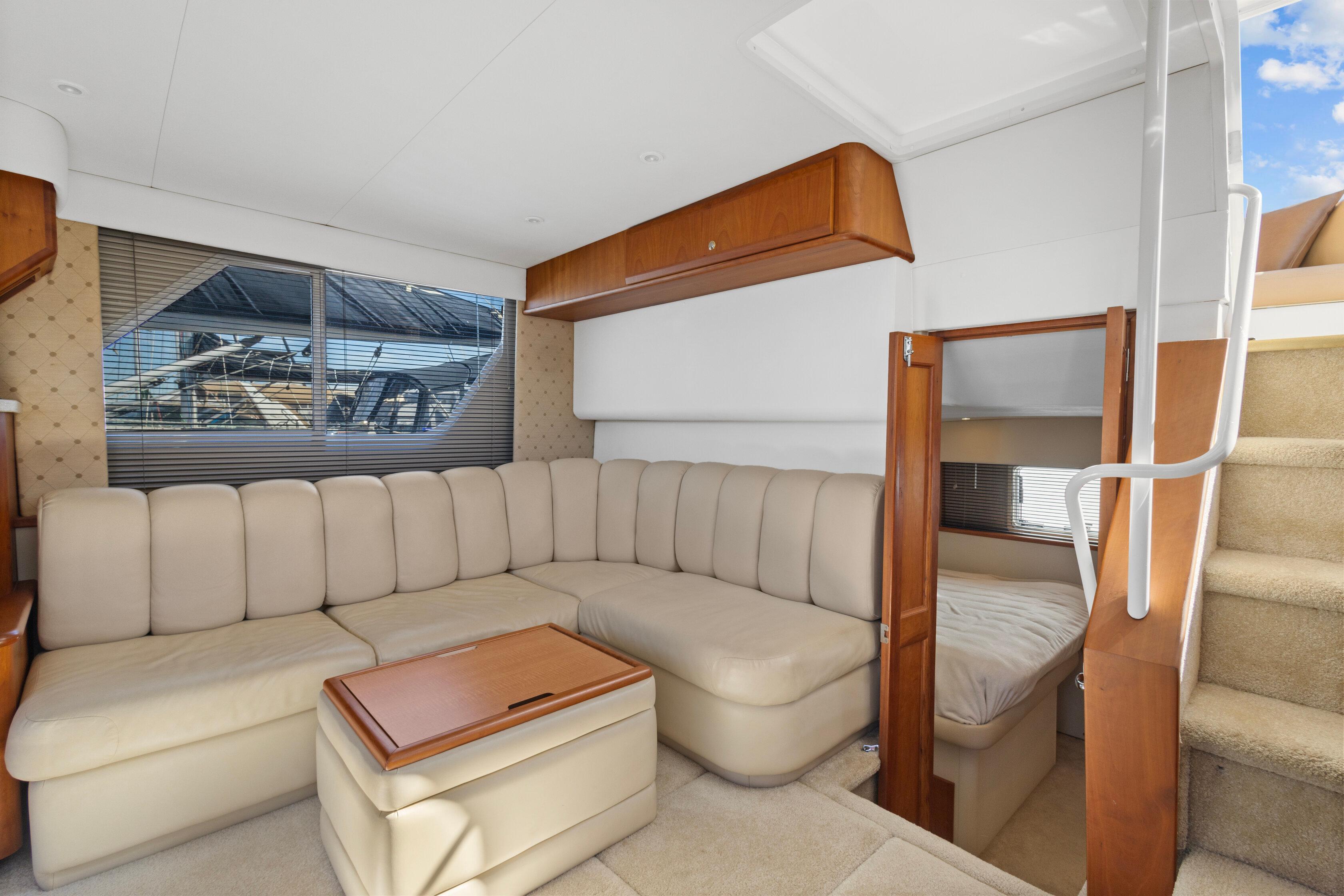 Salon: Descend into the inviting Main Salon from the aft deck, where spaciousness meets elegance in an open-concept design that seamlessly integrates the galley and dinette area. The salon boasts a bright and open atmosphere, featuring large windows adorned with wooden mini-blinds. The ambiance is further enhanced by gloss-finished wood paneling and a cream-colored headliner, creating a welcoming and sophisticated interior.