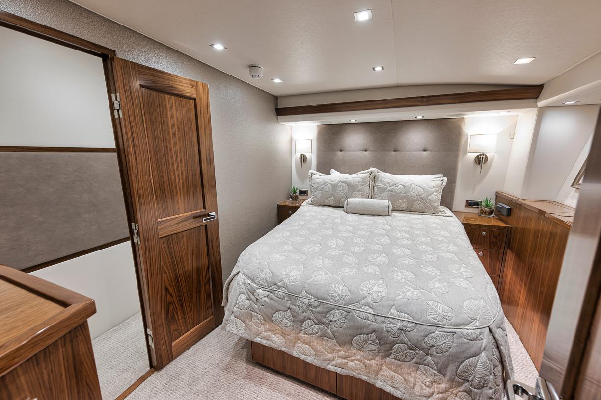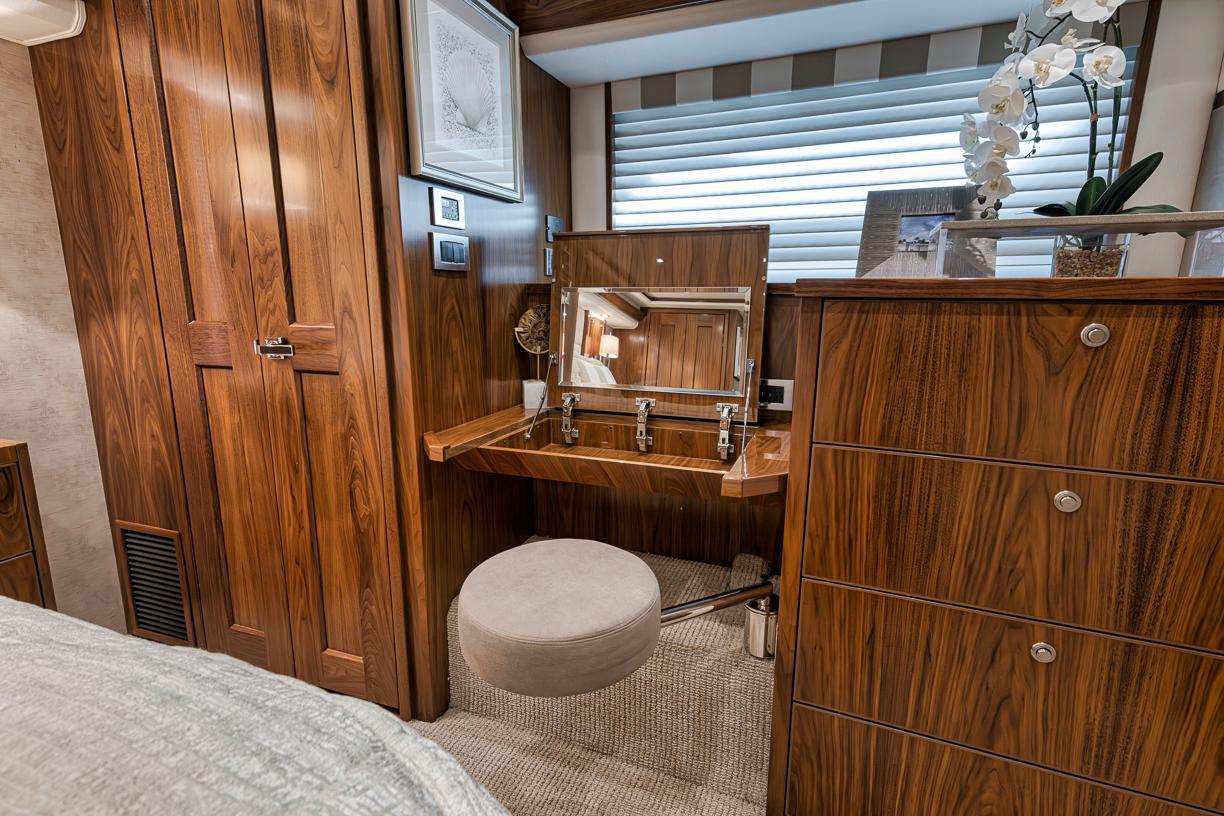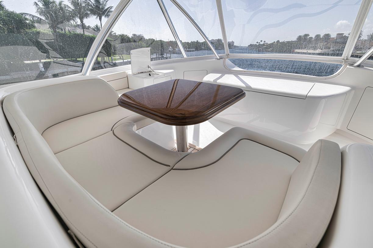 - Teak decks, mezzanine, teak coaming and covering. Full faux painted aft bulkhead, transom and toe rail