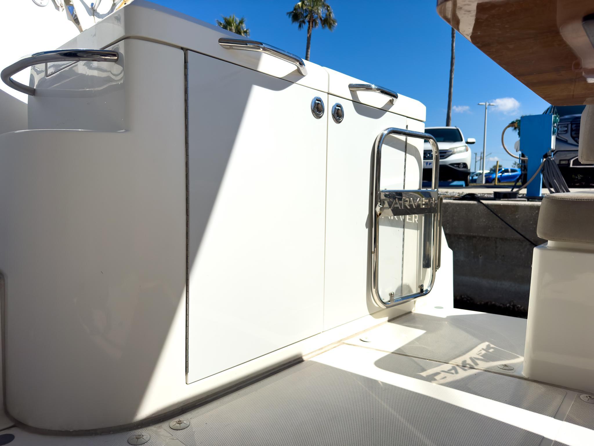- Swim Platform: Integrated into the yacht’s hull and deck. Access to the cockpit from the swim platform is through a transom door on the starboard side of the yacht. Telescoping boarding ladder is installed in recessed area of swim platform.