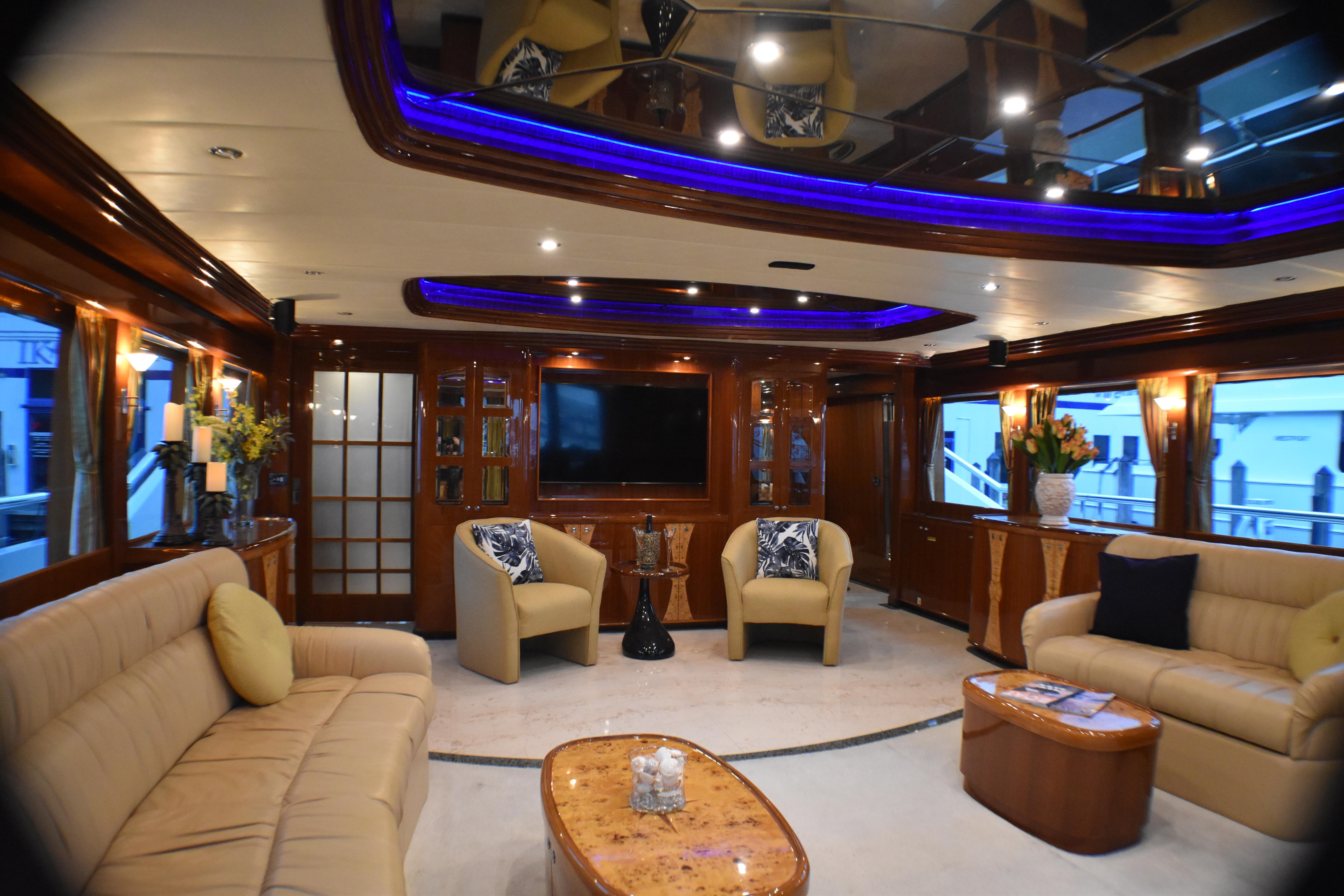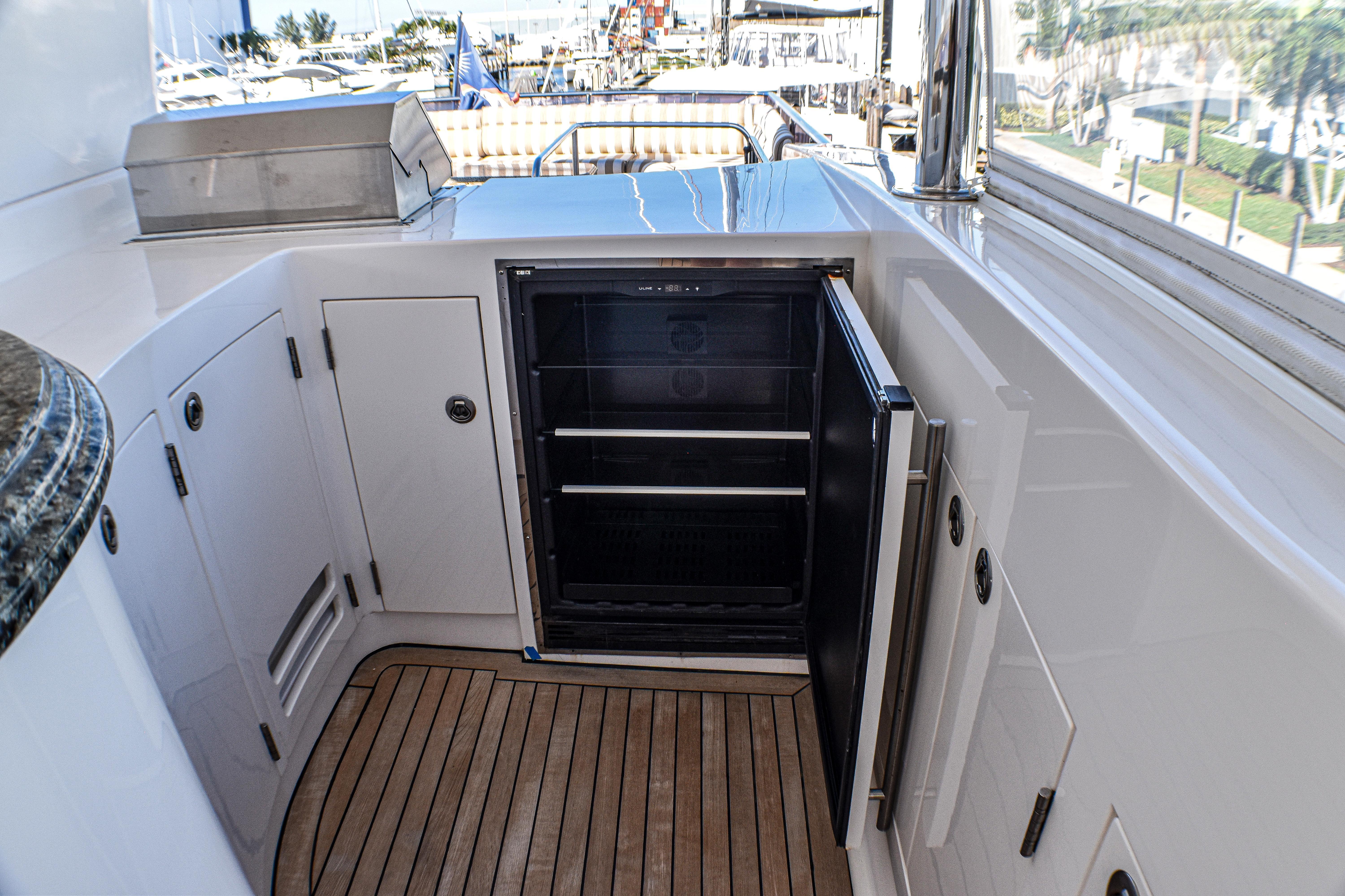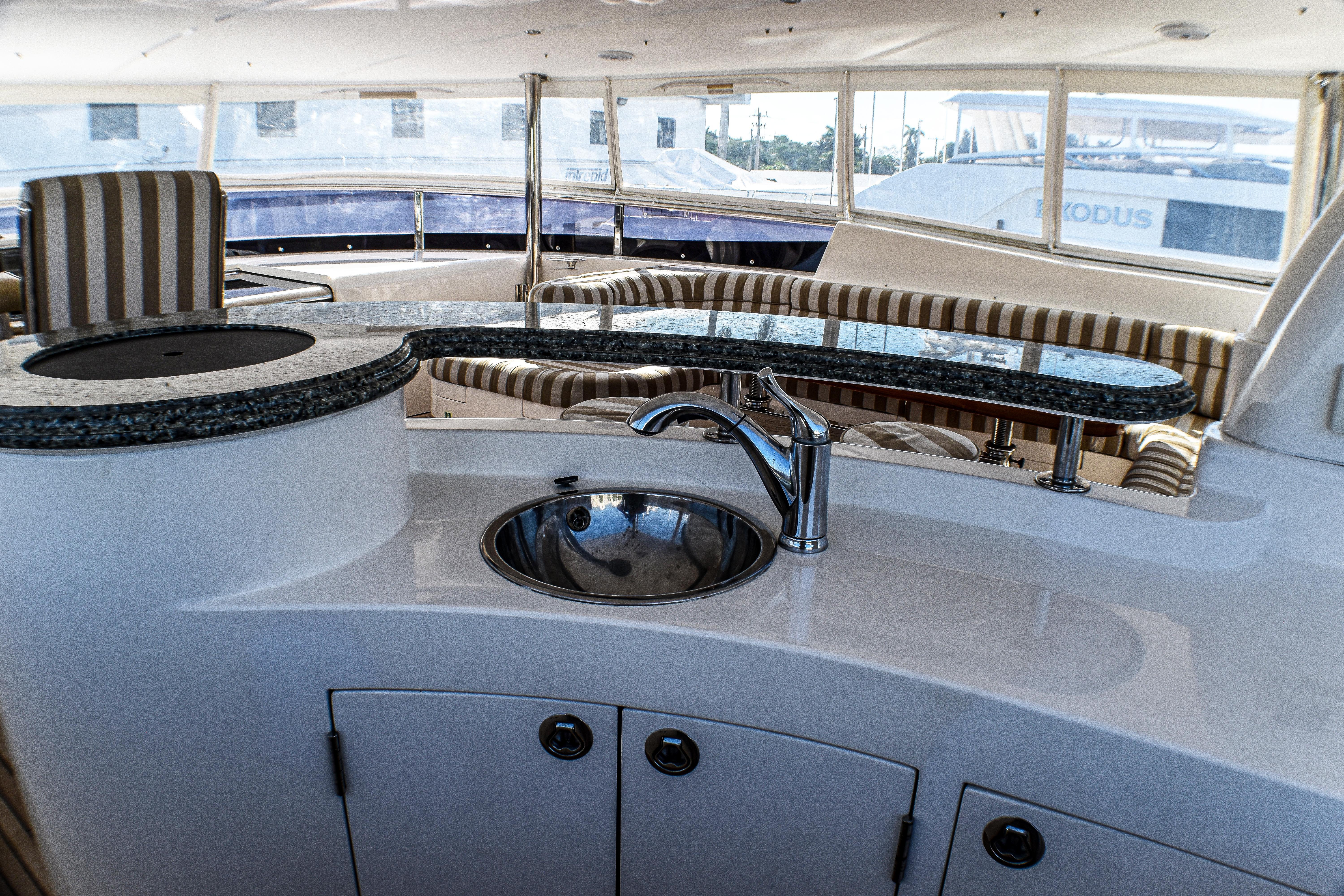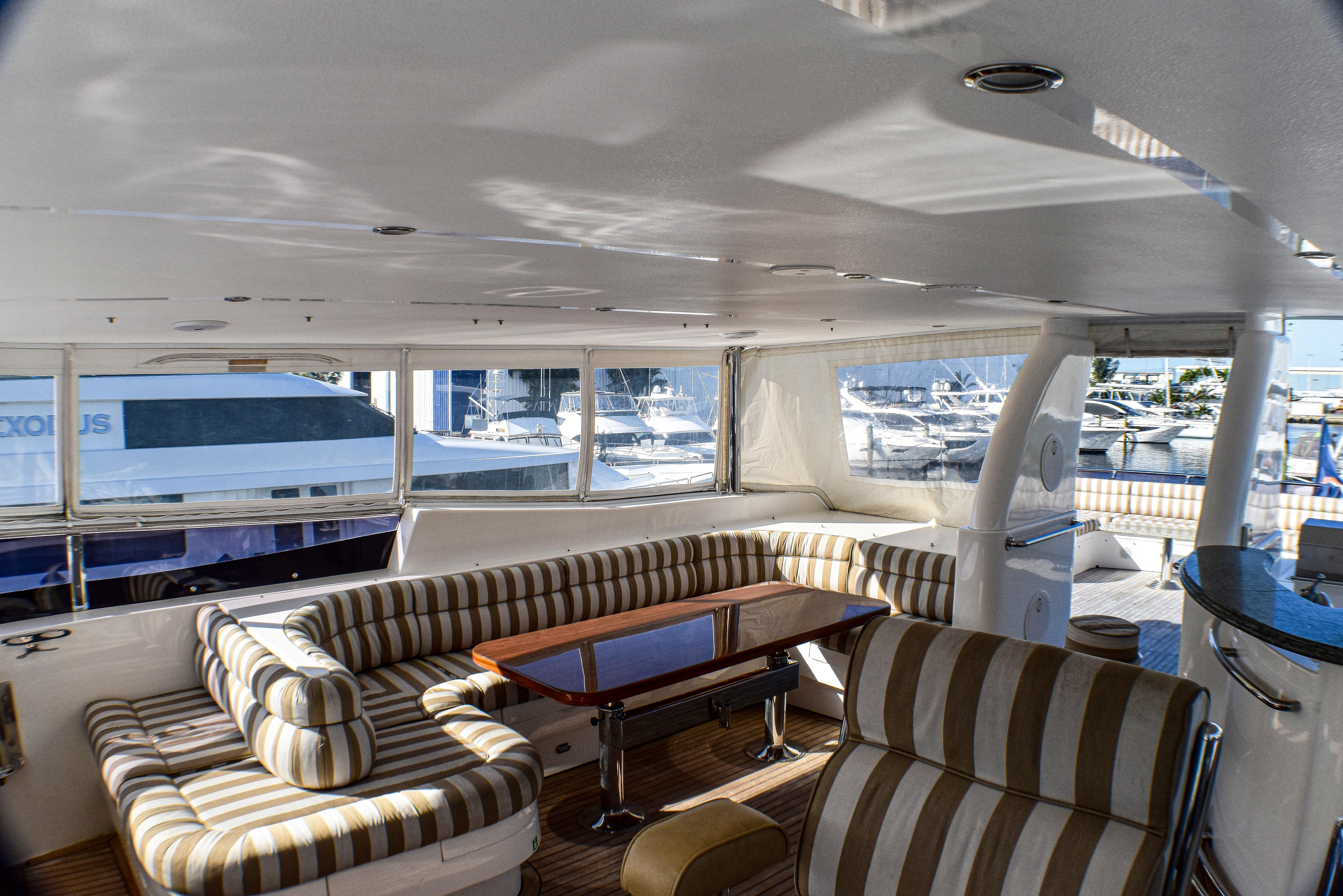 Open flowing upper deck is huge for dining, entertaining or just plain relaxing in the sun or in the shade enjoying a cool breeze under the protective hard top. The deck is custom built and has a custom bar on the port side and a protected settee on the starboard side with a dining table.There is a complete captains station with two chairs, on port side, starboard side has seating for two. . Aft is a huge wraparound settee with two granite topped cocktail tables. There is also a built-in barbecue . No need to worry about a tender, taking up space, the tender sits on the optional large swim platform, and the davit has its own enclosed garage in the transom.This system does not take away any space from crew!