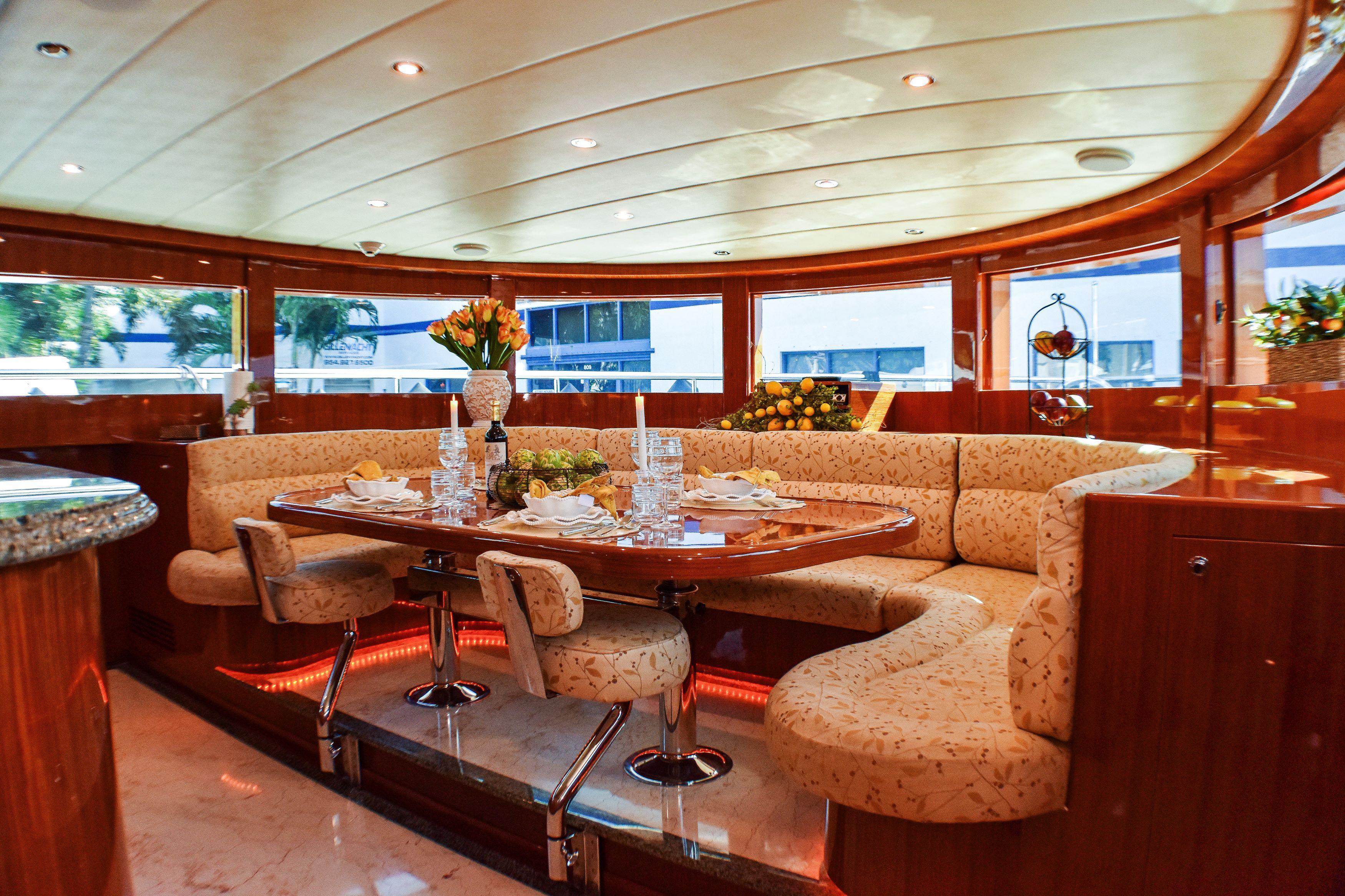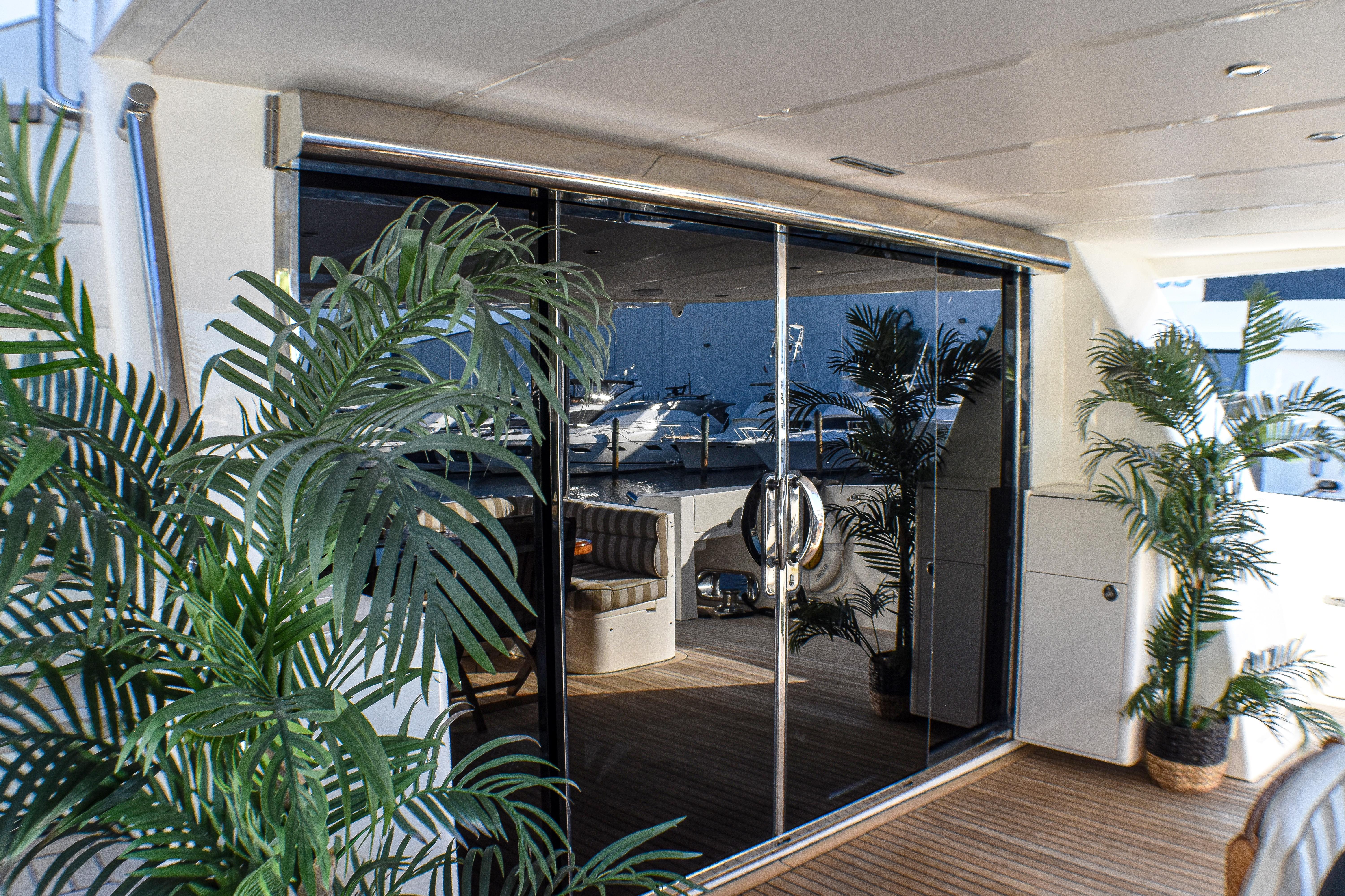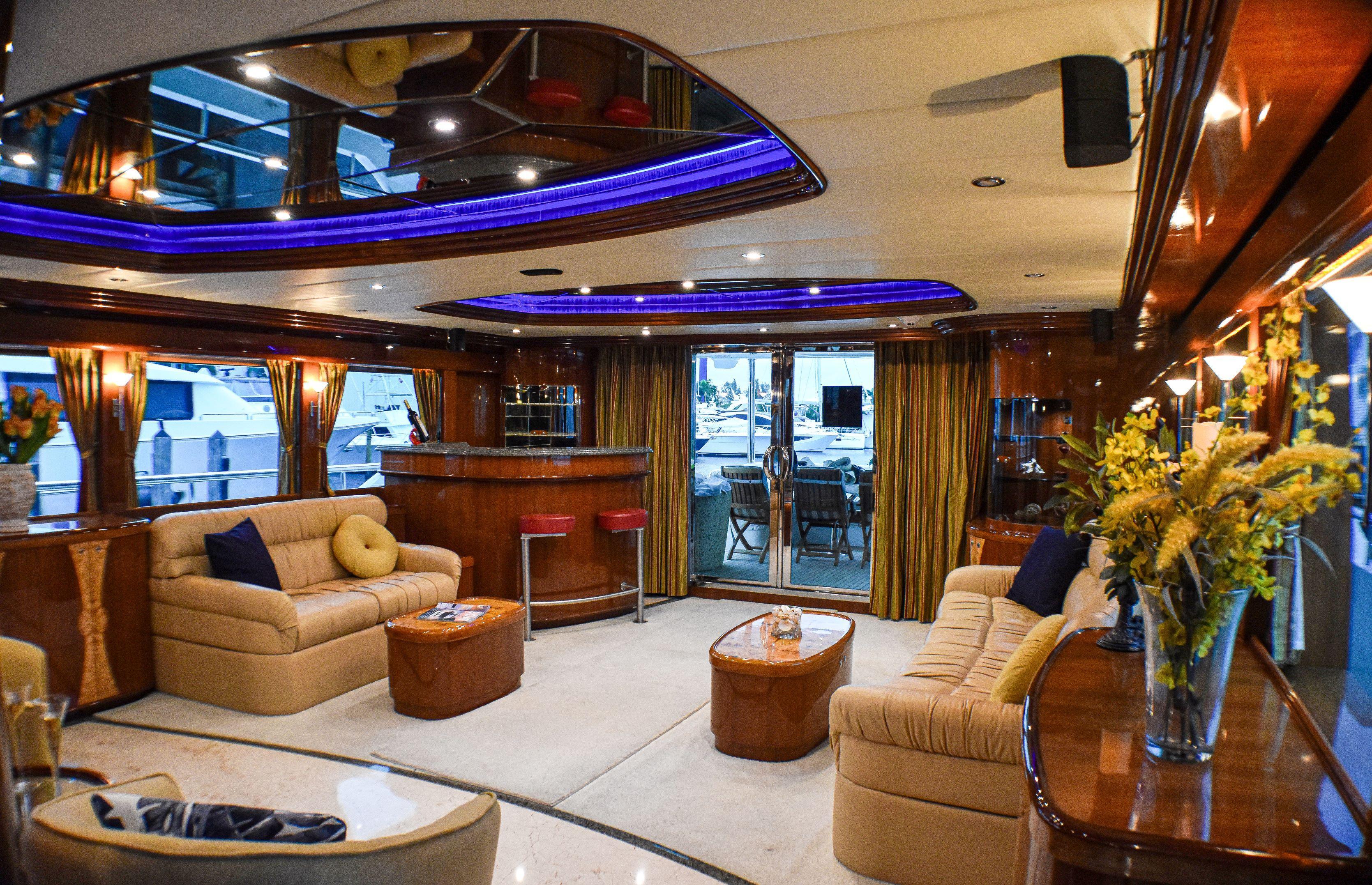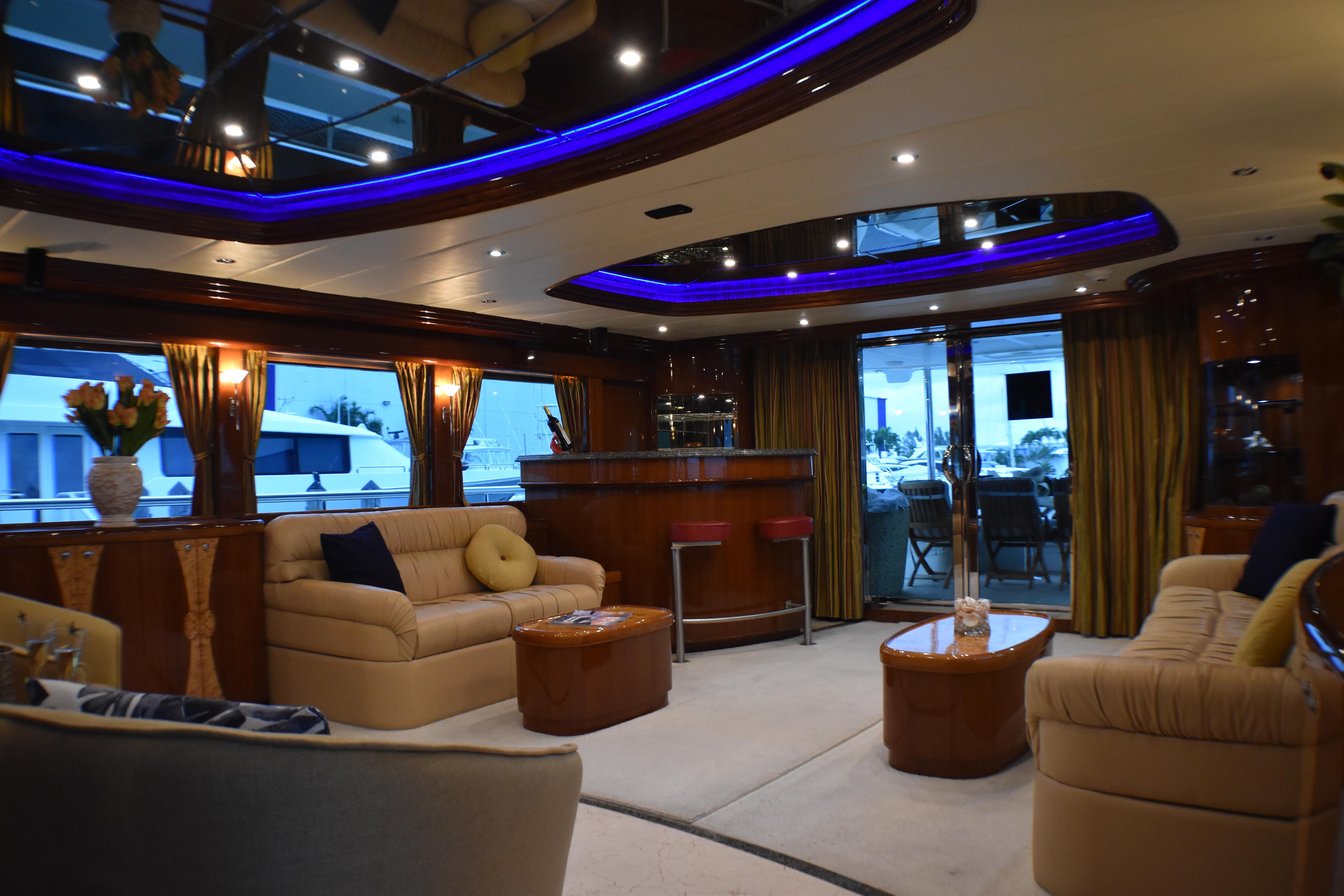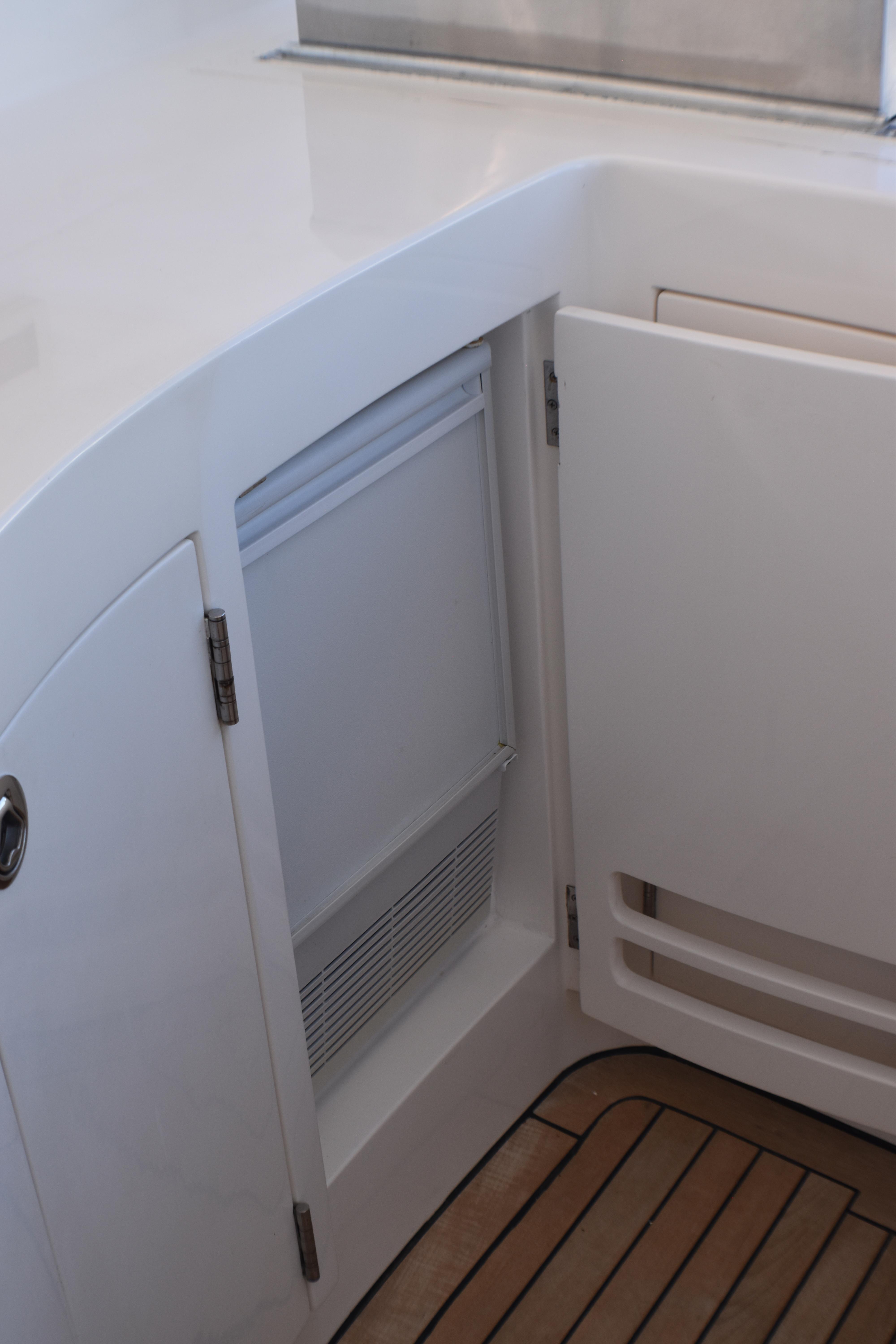 Open flowing upper deck is huge for dining, entertaining or just plain relaxing in the sun or in the shade enjoying a cool breeze under the protective hard top. The deck is custom built and has a custom bar on the port side and a protected settee on the starboard side with a dining table.There is a complete captains station with two chairs, on port side, starboard side has seating for two. . Aft is a huge wraparound settee with two granite topped cocktail tables. There is also a built-in barbecue . No need to worry about a tender, taking up space, the tender sits on the optional large swim platform, and the davit has its own enclosed garage in the transom.This system does not take away any space from crew!