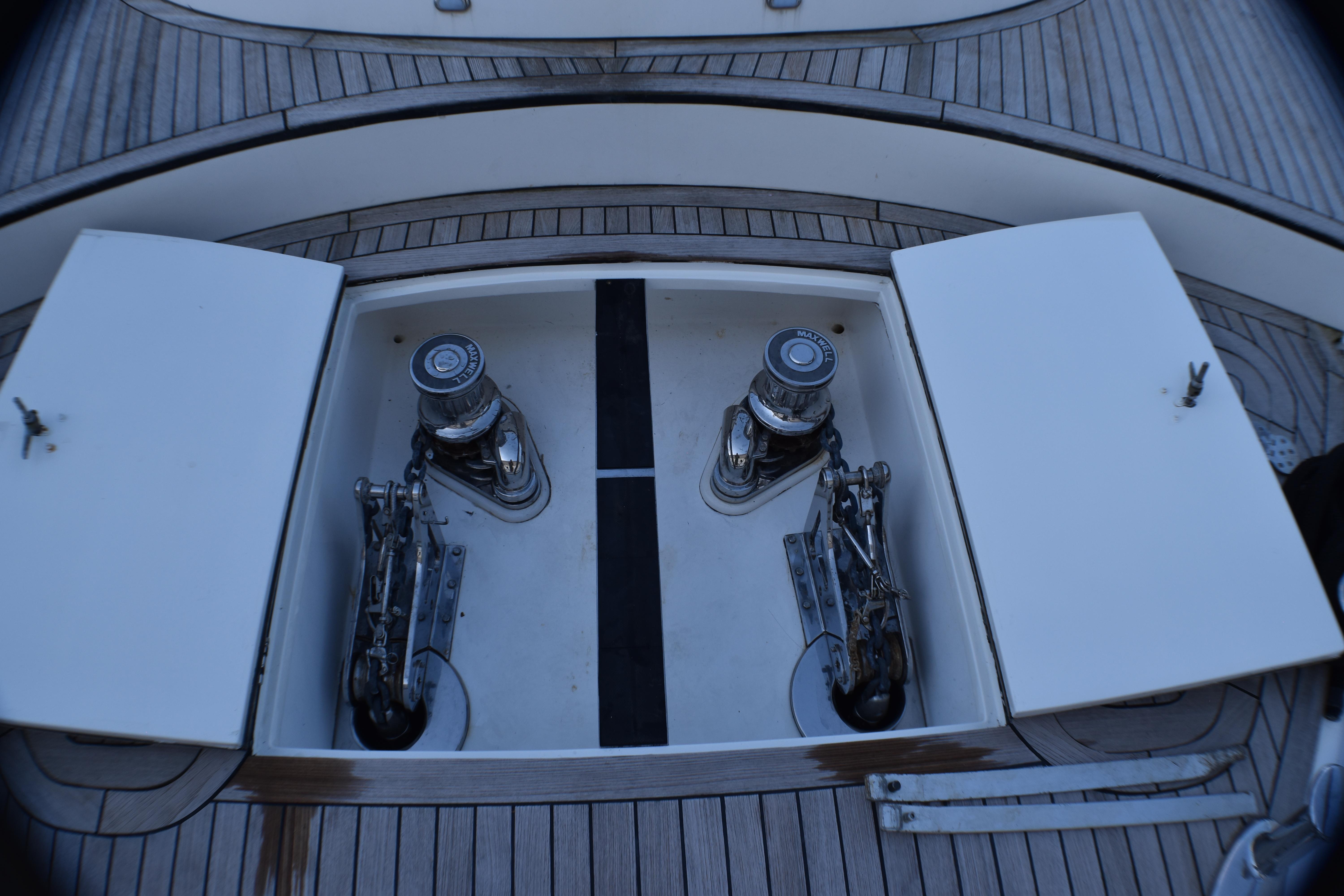 Optional swim platform, this vessel has an extended swim platform, and it can accommodate a 16 foot tender or twin jet skis. The tender is launched by a Hydraulic davit concealed in the transom. By a push of the button a hydraulic door opens the top of the transom and the arm of the davit controlled by a handheld remote, swings out and easily launches the tender or (2) jet skies, the polish stainless steel tender chocks are removable and makes the extended swim platform another great place to play once the tender is launched. There are two built in showers on each side of the transum (2024) This system is easy as the tender is close to the water, but best of all it saves a tremendous amount of space,and effort as the davit and tender or jet skies are NOT sitting up on the upper deck!