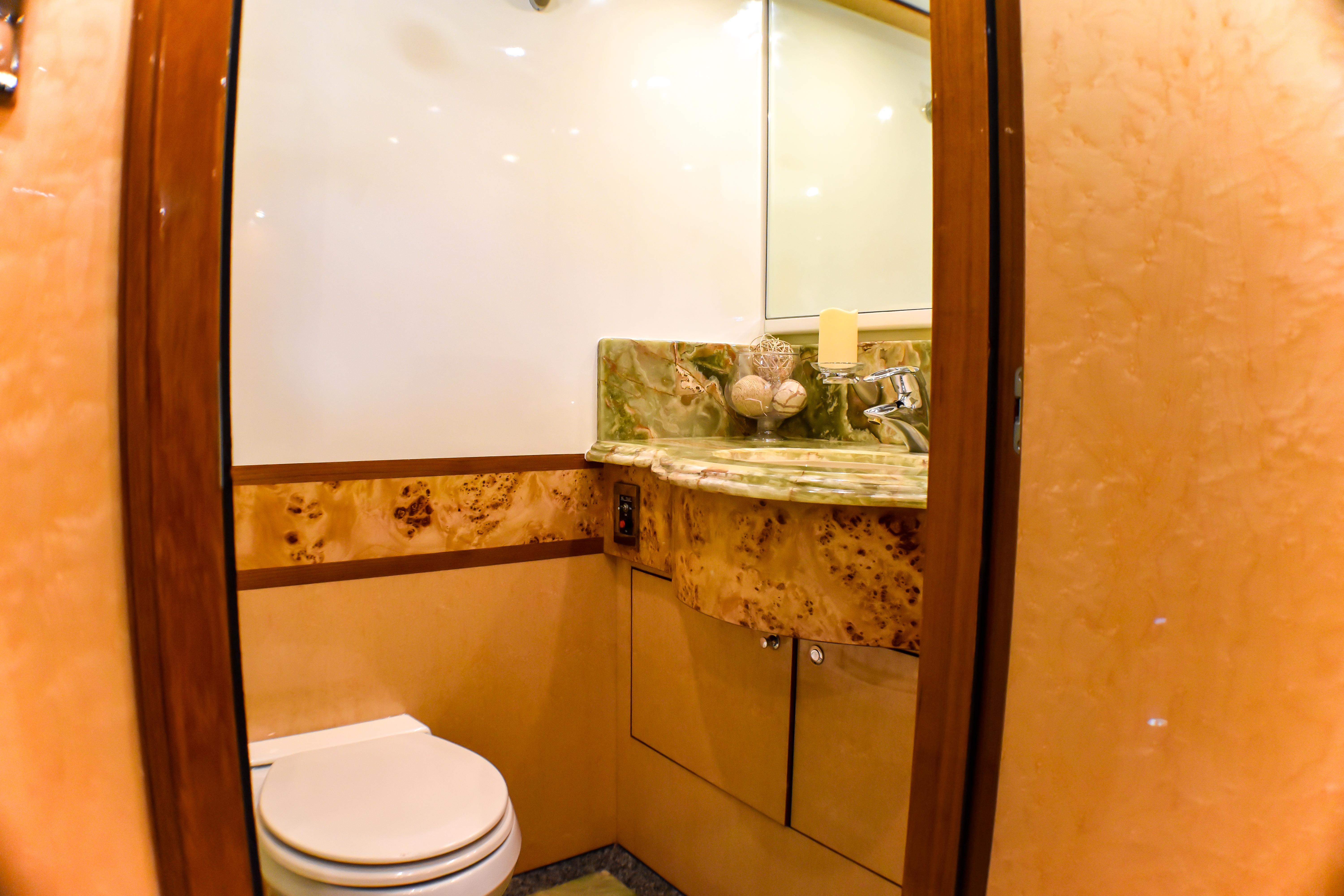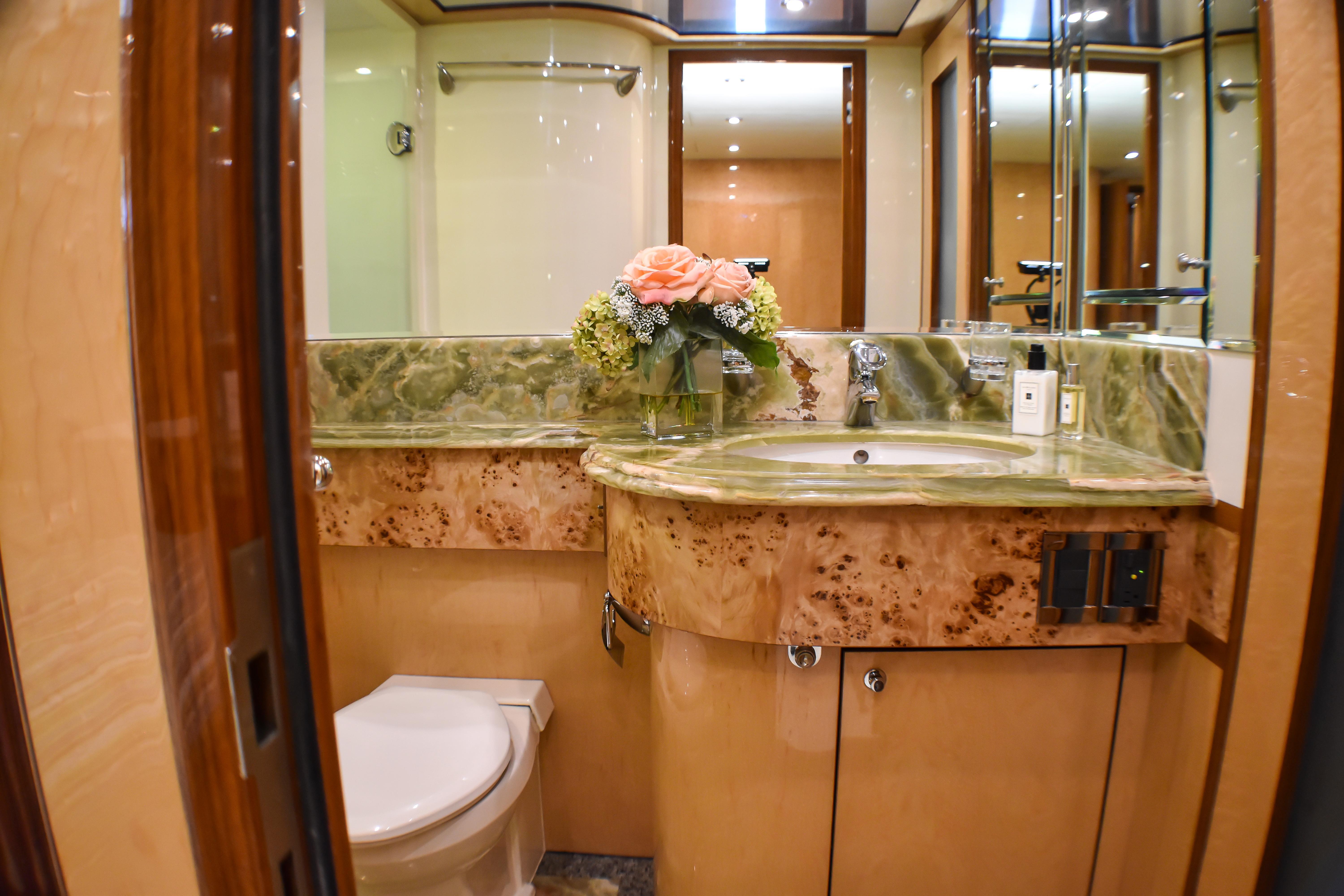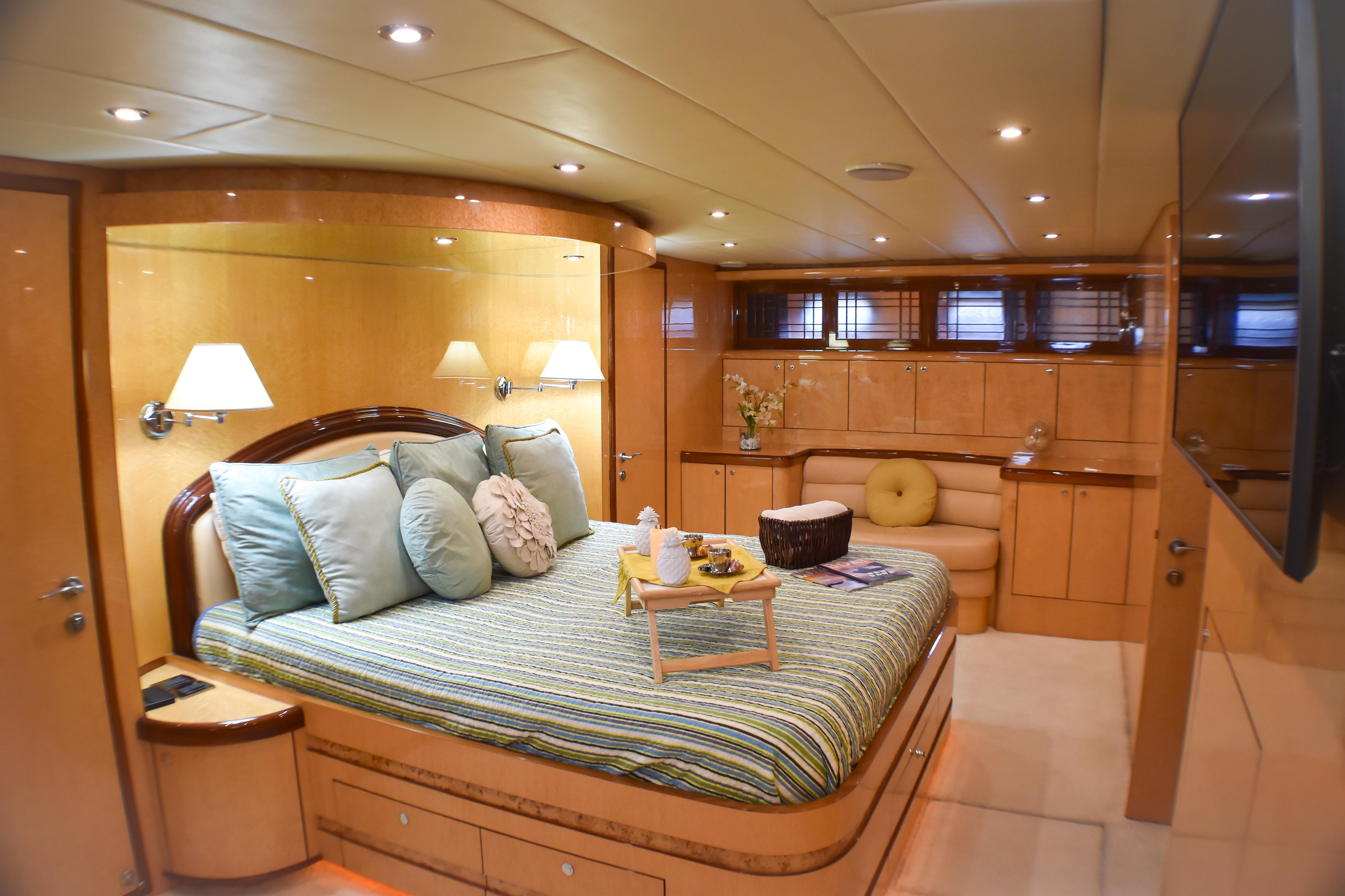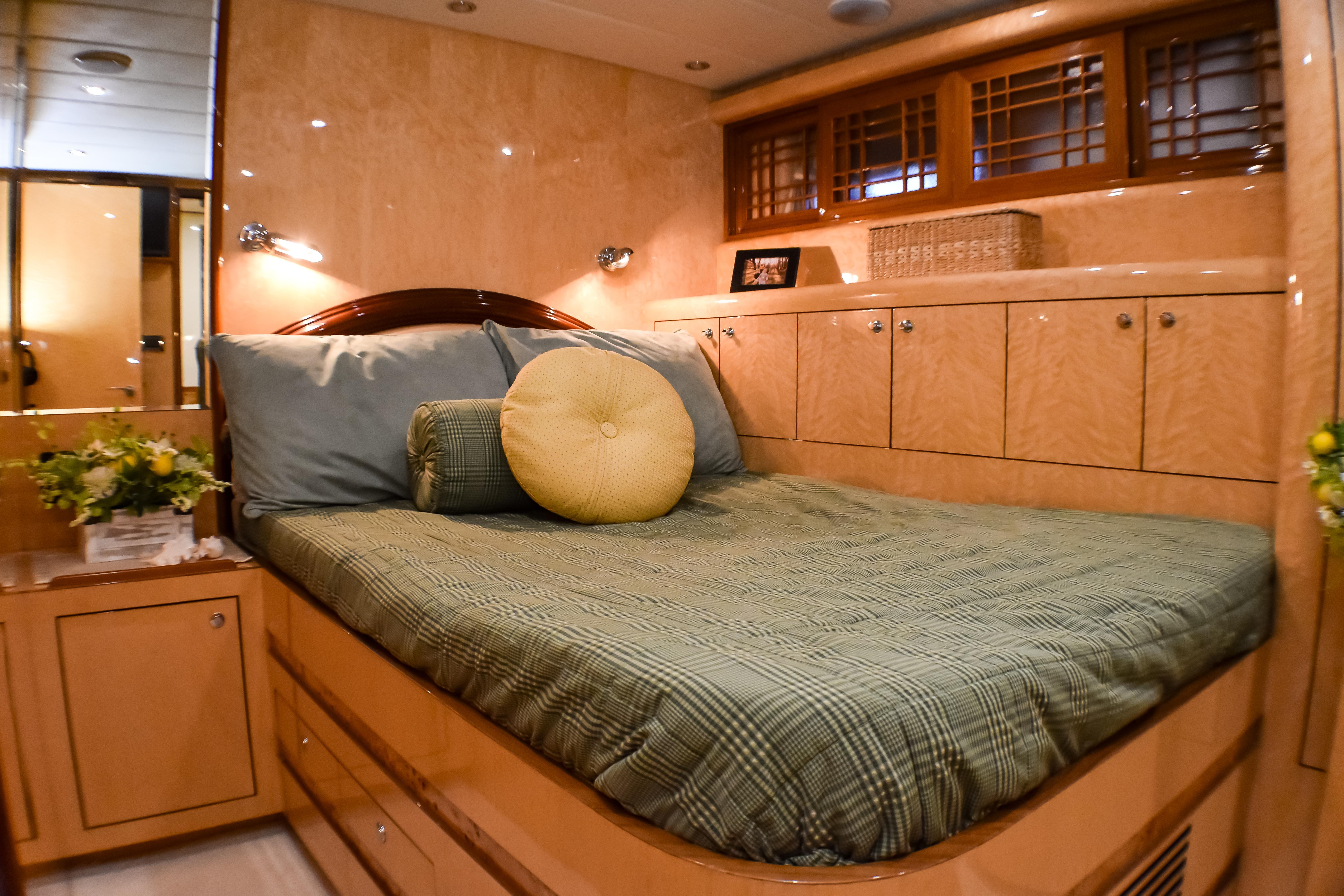 HUGE master king platform bed,with storage drawers. A port side built in leather settee with cabinets, Starboard side built in mirrored makeup table/ leather bench and 10 cabinets, This suite has s/s portlights with sliding shoji screens for natural light. A Samsung 50'' flat screen TV and stereo, Aft of master bed is His and Hers bathrooms separated by a huge rain shower with etched doors,and surrounded with lots of marble and quartz.