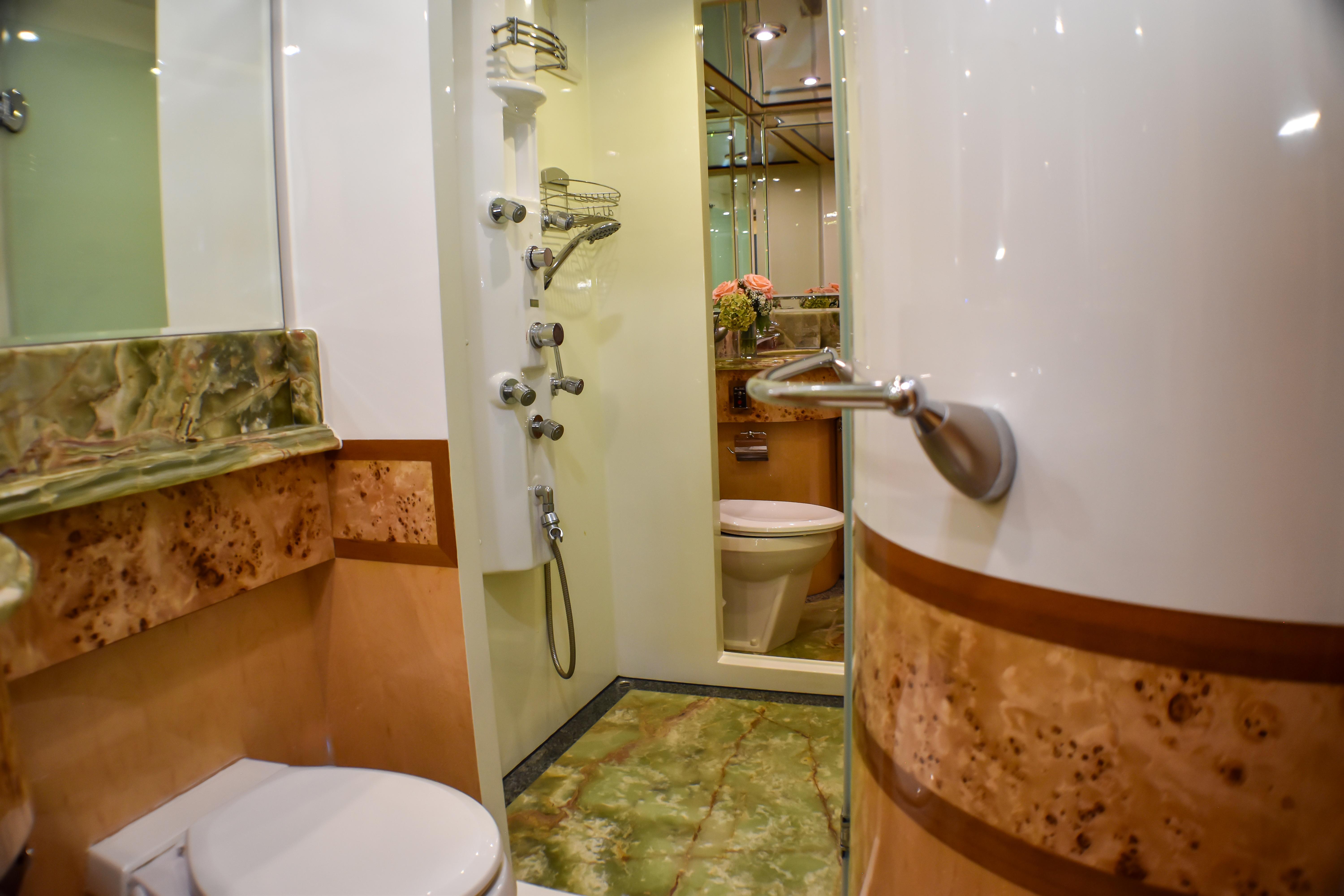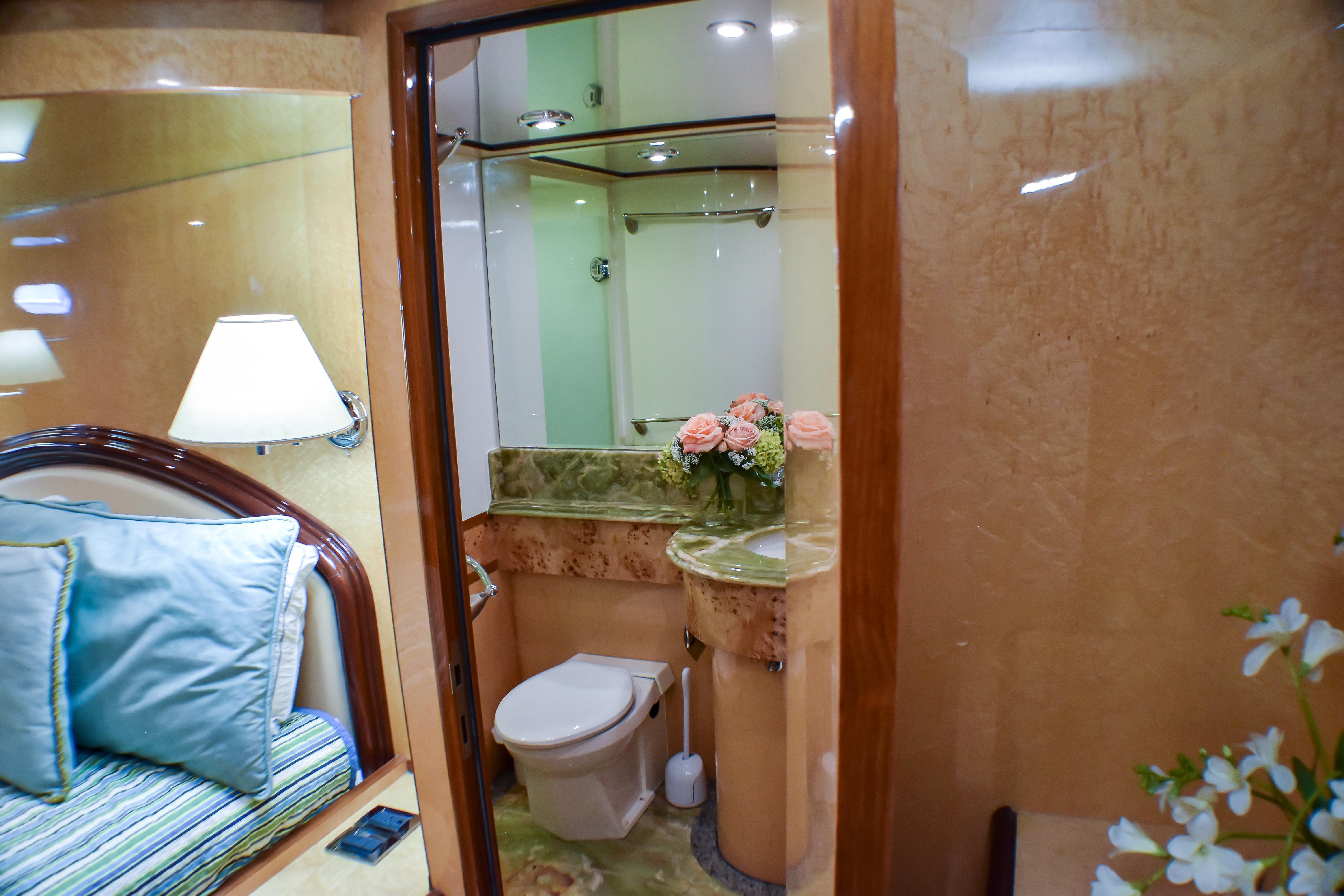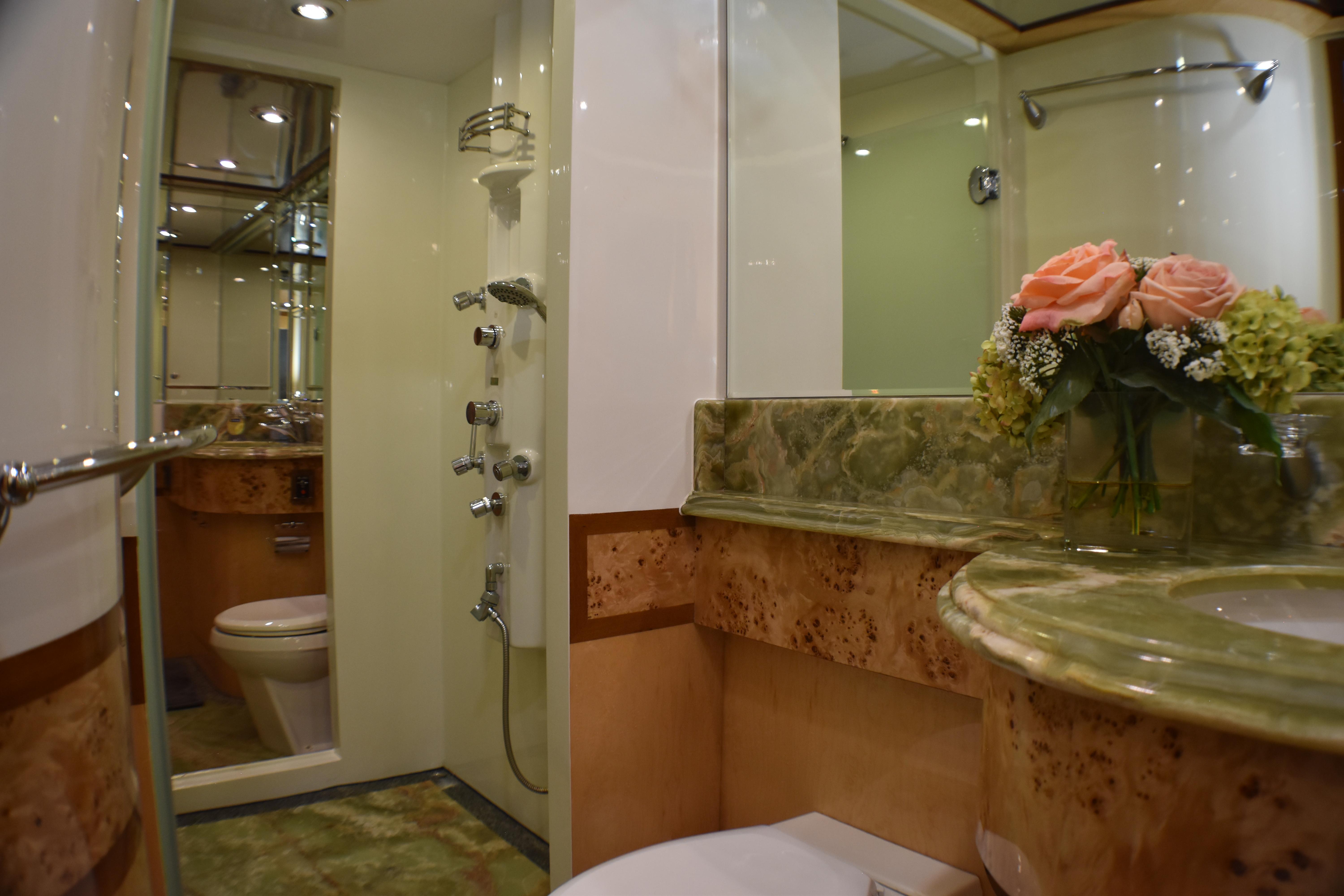 Port side guest stateroom has two twin berths and one fold up pullman berth sleeping three. Also in suite bathroom with standup shower. The vanity sink is embedded in quarts. Marble and Granite floor with large mirrored cabinets.White cedar lined closet.