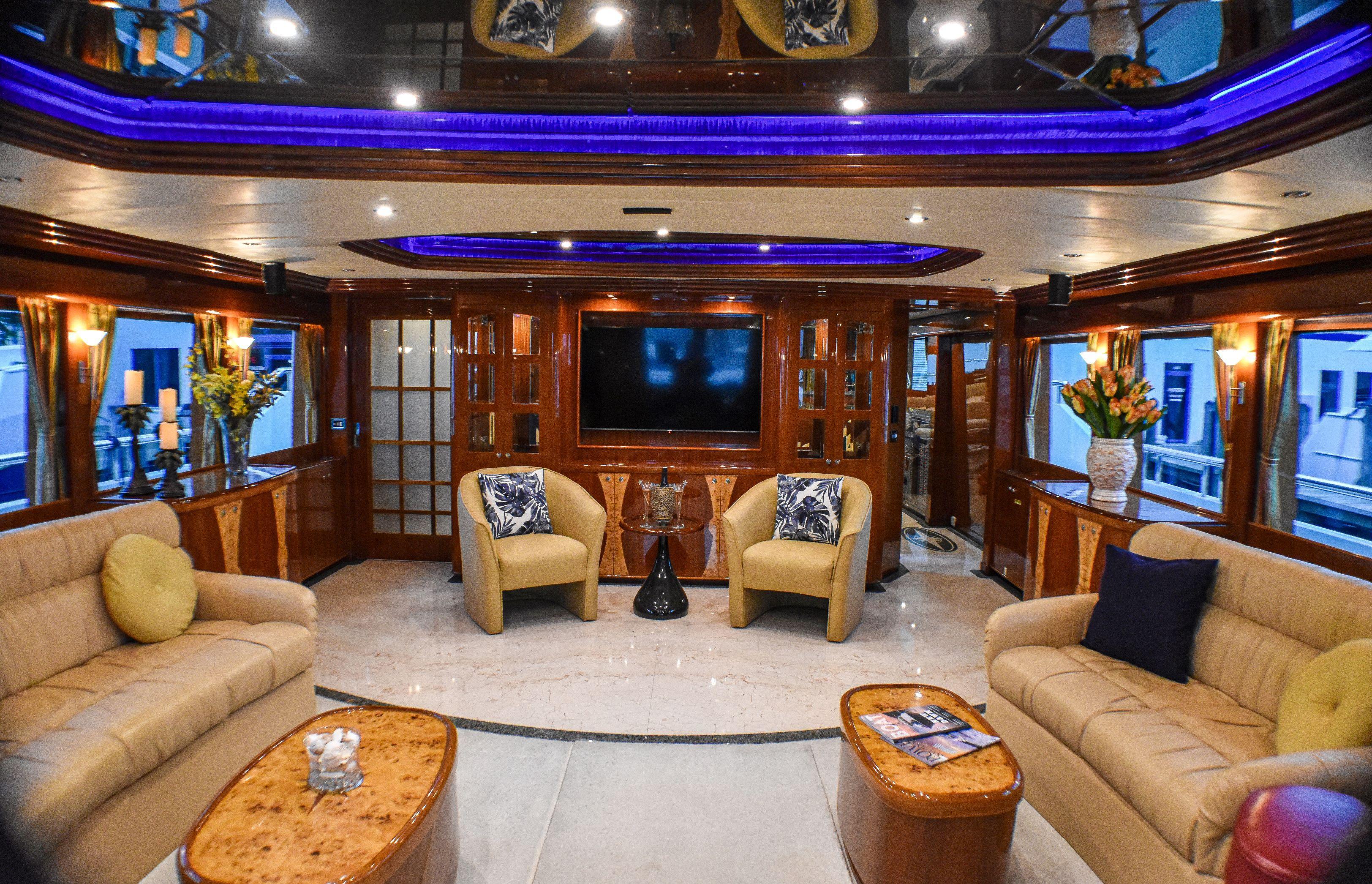 From the aft deck,, walk through the stainless steel sliding doors. On the Port side is a 9' custom leather couch, on the starboard side is a smaller couch of the same style. They both are matched up with custom teak coffee tables. On the starboard side next to the sliding doors is the salon bar, granite double shelf tops. The bottom shelf is a working bar with stainless steel sink. It is also equipped with the Isotherm clear S/S ice maker 40lbs per day (4/2025) and a large Frigidaire S/S beverage cooler. Behind the bar is a see thru display cabinet, and below is a liquor cabinet. On the port side is a matching glass cabinet, and on the bottom is a Bose entertainment system with surround-sound, and Bose Q speakers on the ceiling. There are also two mirrored ceiling facets with a blue Hue of led indirect light. The forward wall has glass custom cabinetry surrounding a 50 inch smart TV (2022) . The dining room table was removed when the vessel was first finished. With the large country kitchen table, and also a large deck table. They used the space for two comfortable barrel chairs and a cocktail table.