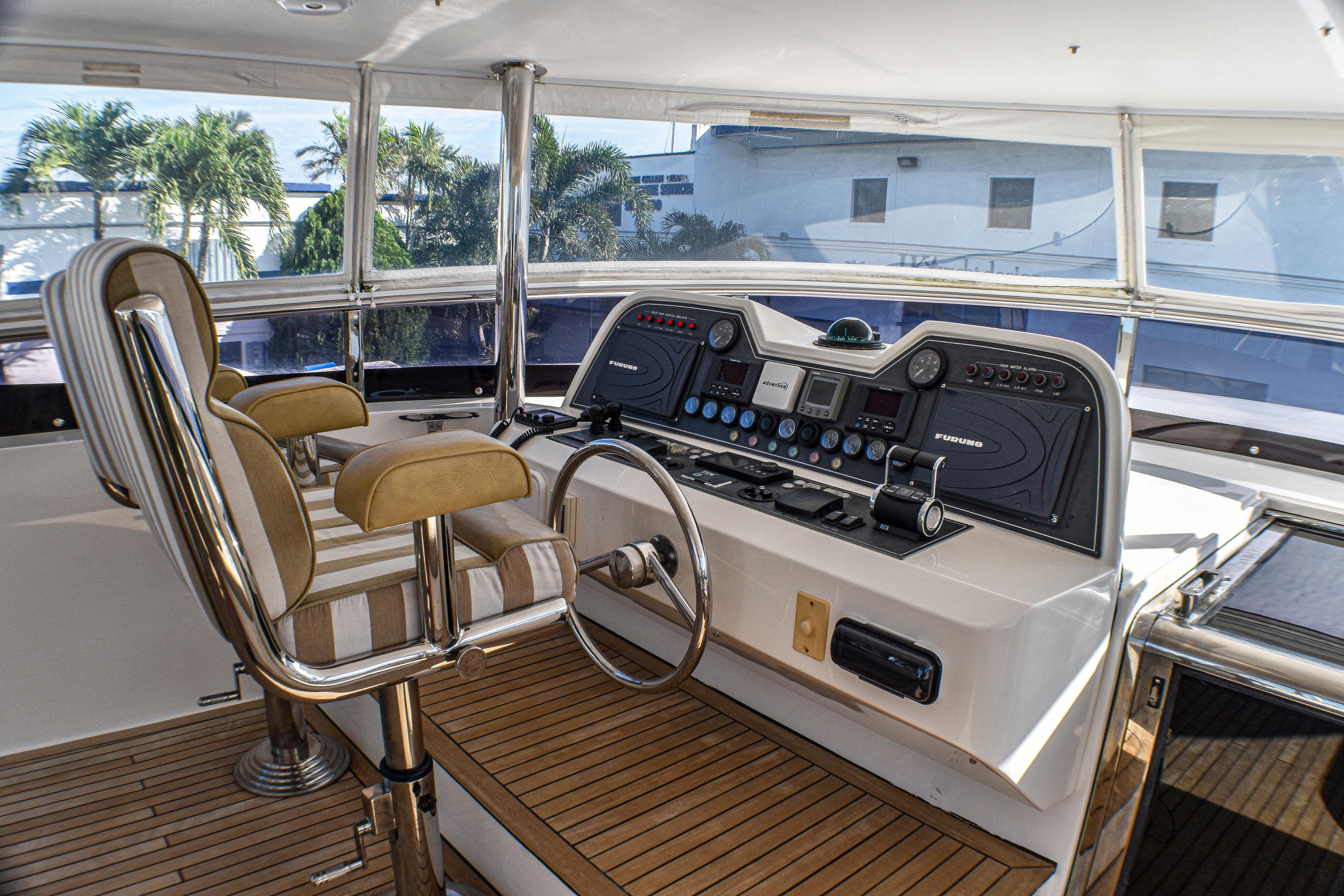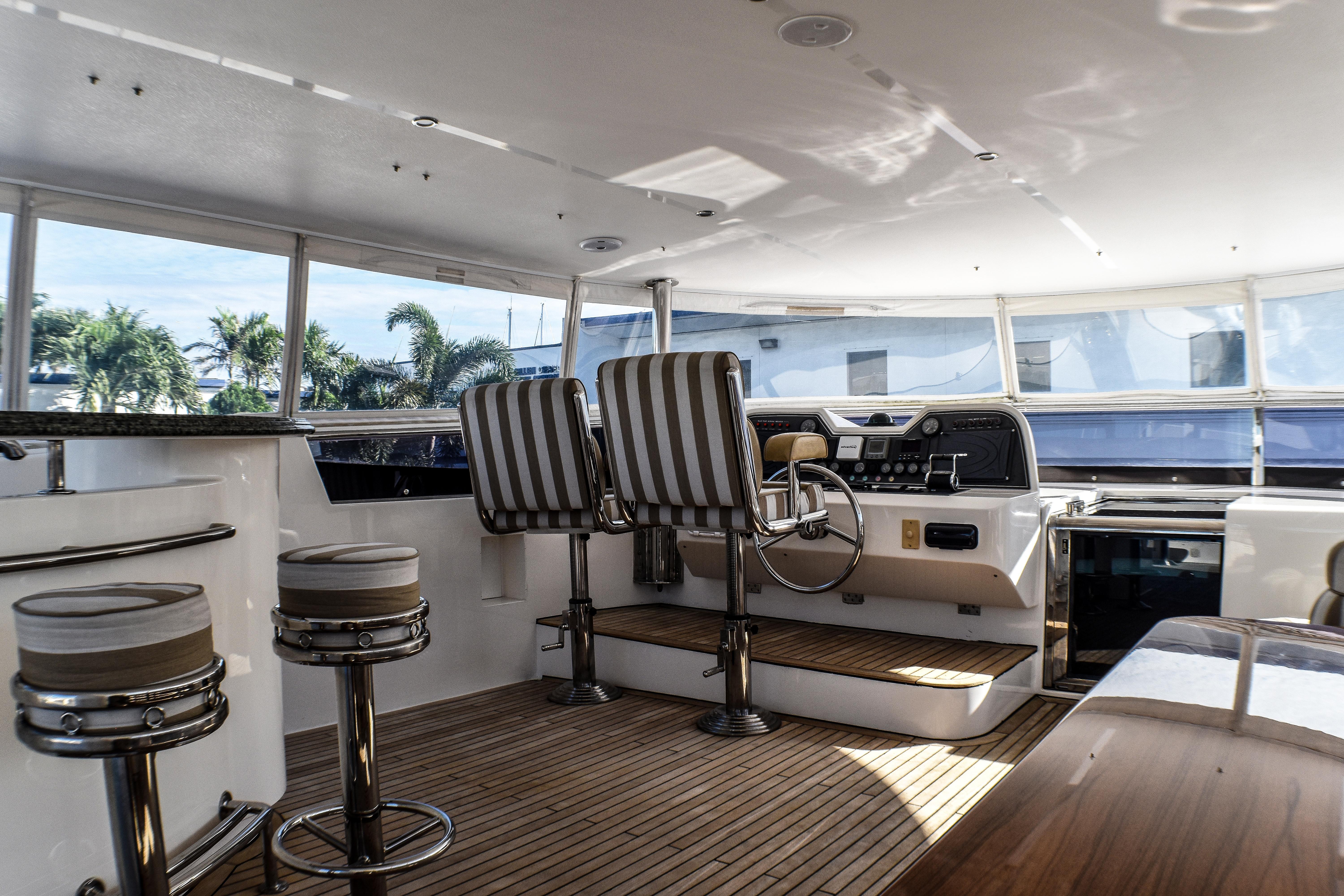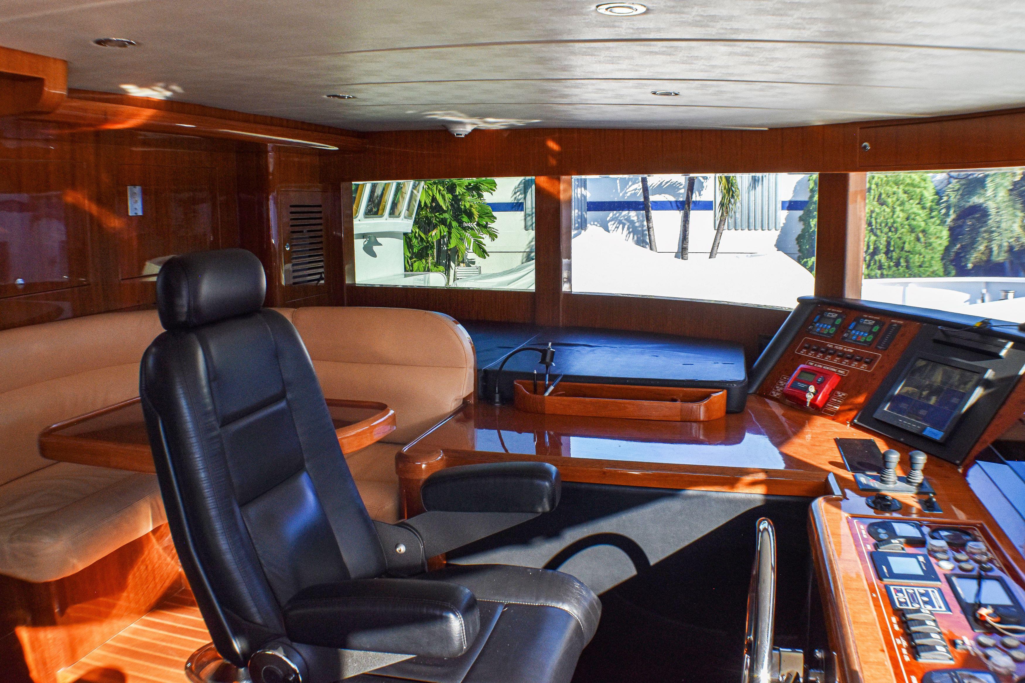 PILOT HOUSEThe captain has a great view with the wraparound vertical windows while sitting on a black leather electric Besenzoni helms chair. The fully custom control dash is well thought out,with all electronic and manual controls easily accessible and within arms reach. All navigation charts and radar are shown on flat Furino screens as well as a complete cc camera system thru-out the yacht. A small raised seating area and teak table behind the captain is a great place for viewing while cruising, or having your morning coffee.. You can also enter the flybridge/upper deck from the Pilot house.