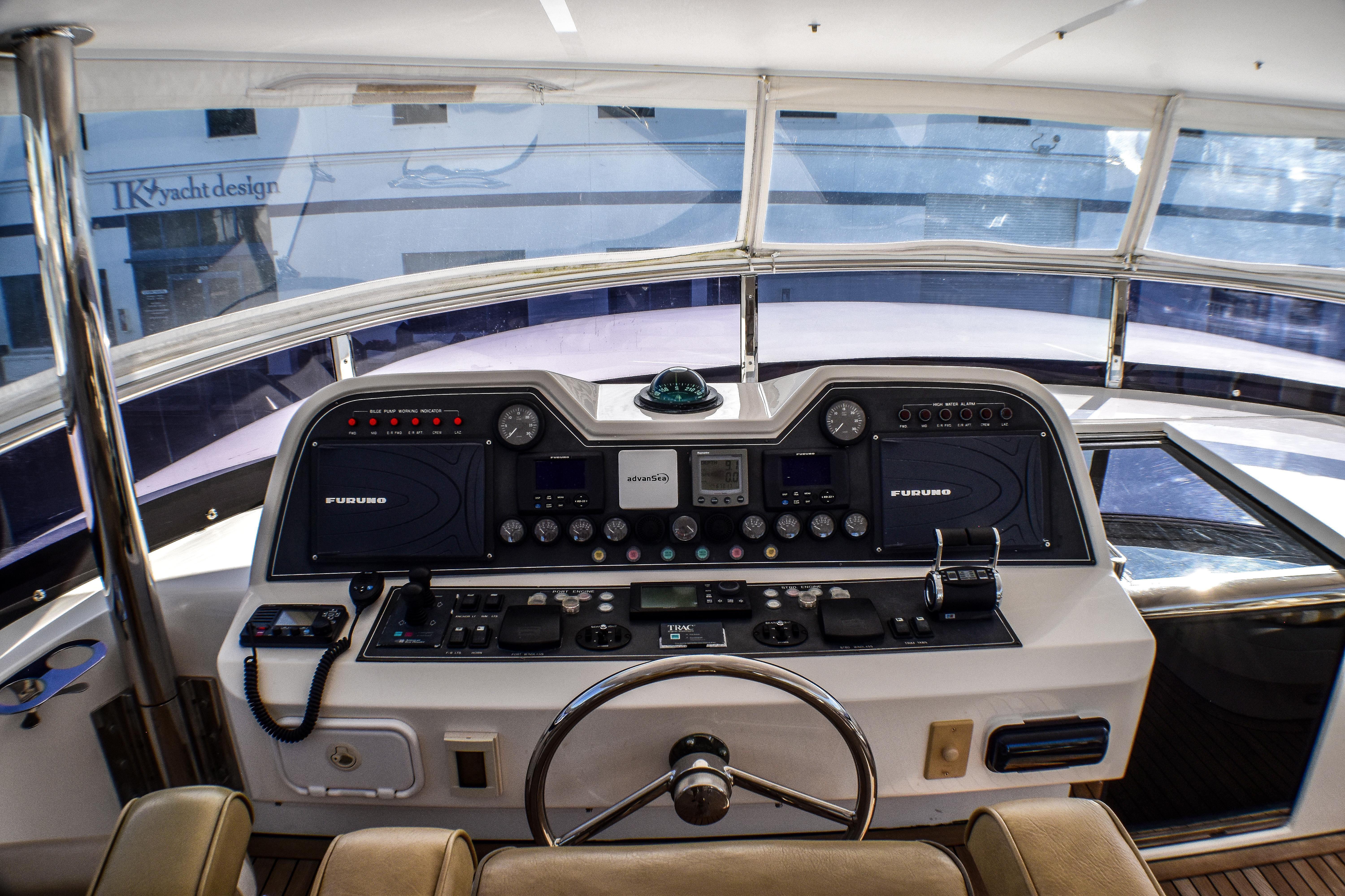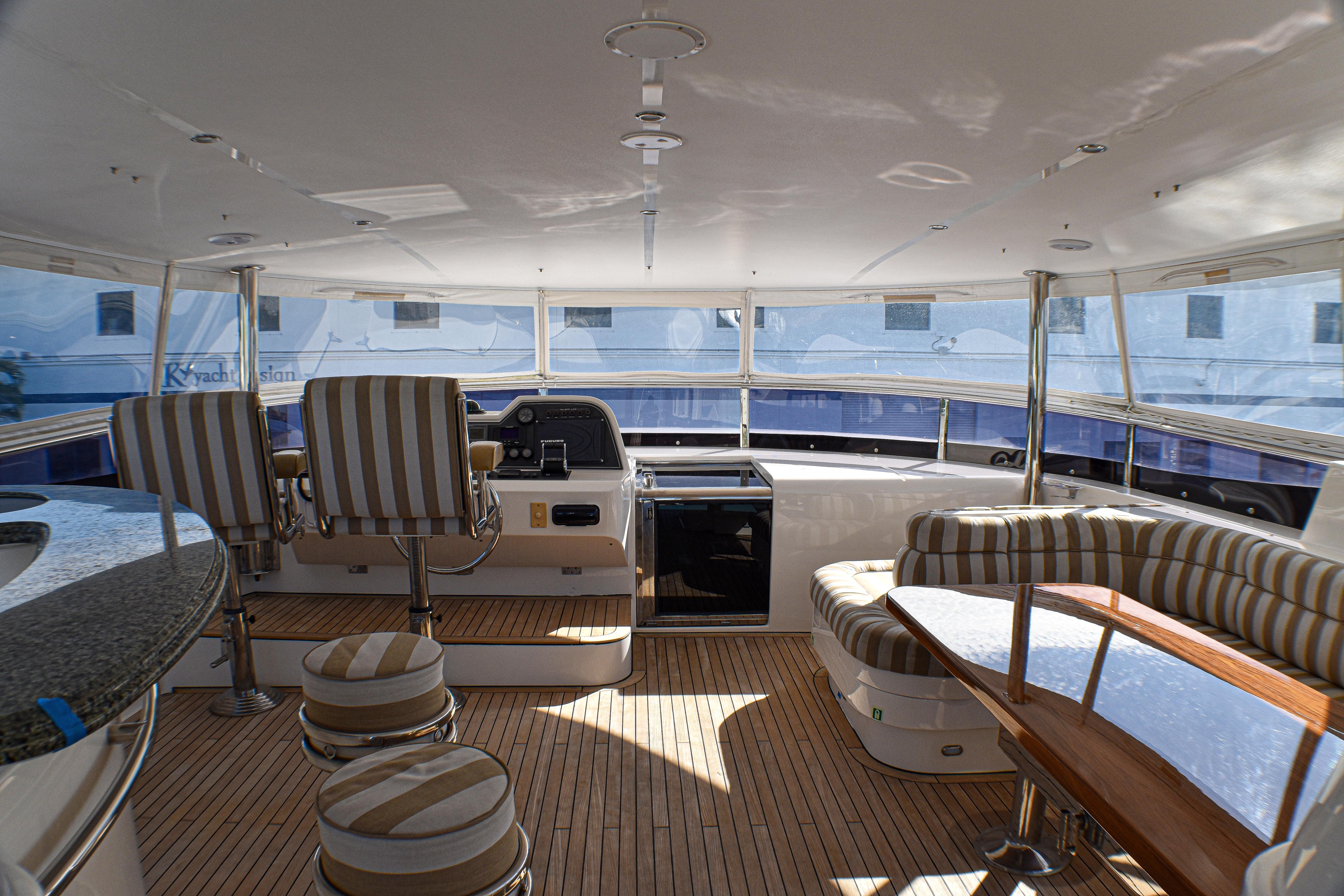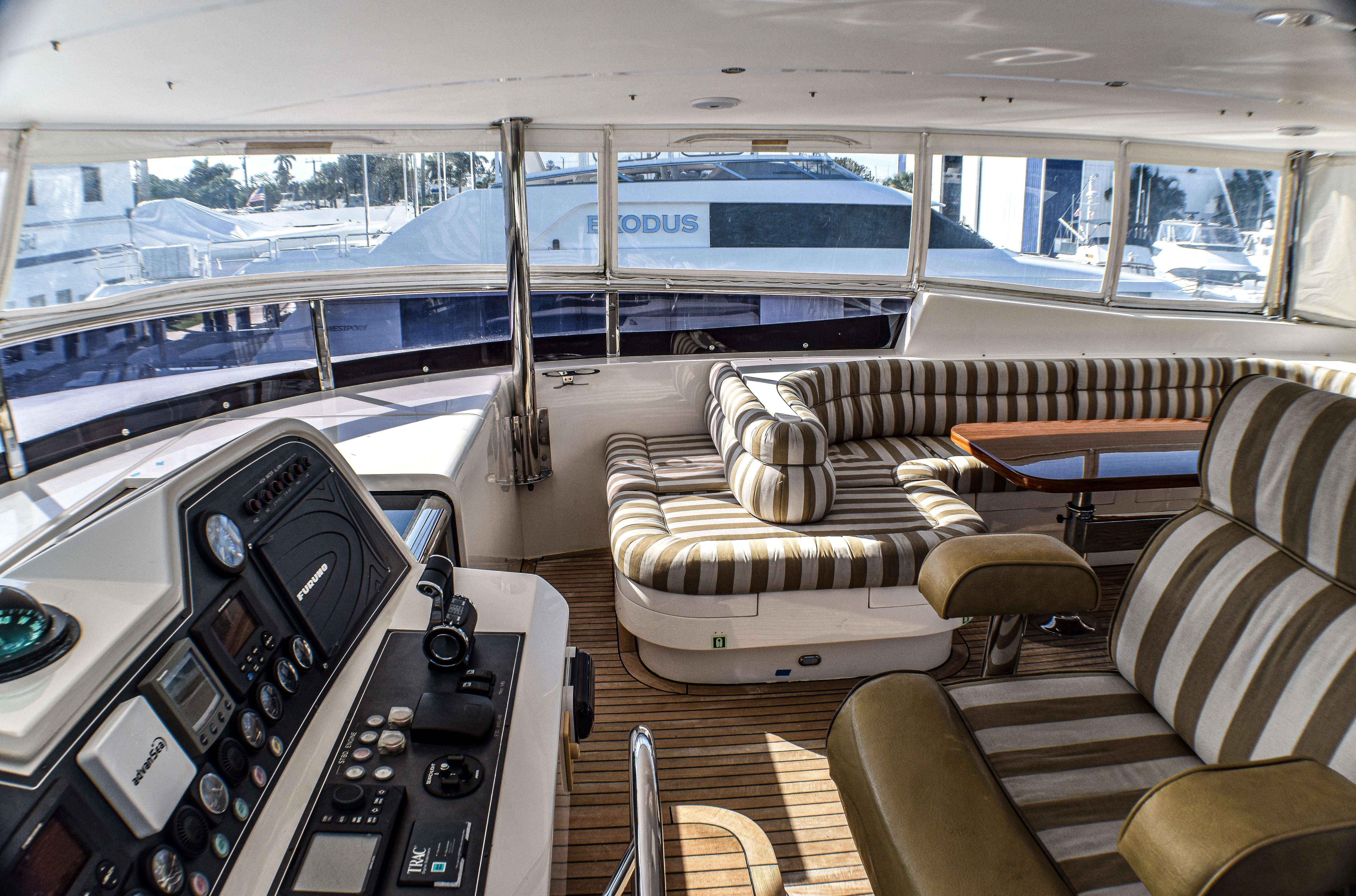 PILOT HOUSEThe captain has a great view with the wraparound vertical windows while sitting on a black leather electric Besenzoni helms chair. The fully custom control dash is well thought out,with all electronic and manual controls easily accessible and within arms reach. All navigation charts and radar are shown on flat Furino screens as well as a complete cc camera system thru-out the yacht. A small raised seating area and teak table behind the captain is a great place for viewing while cruising, or having your morning coffee.. You can also enter the flybridge/upper deck from the Pilot house.