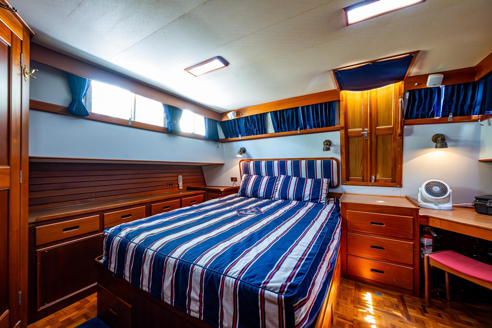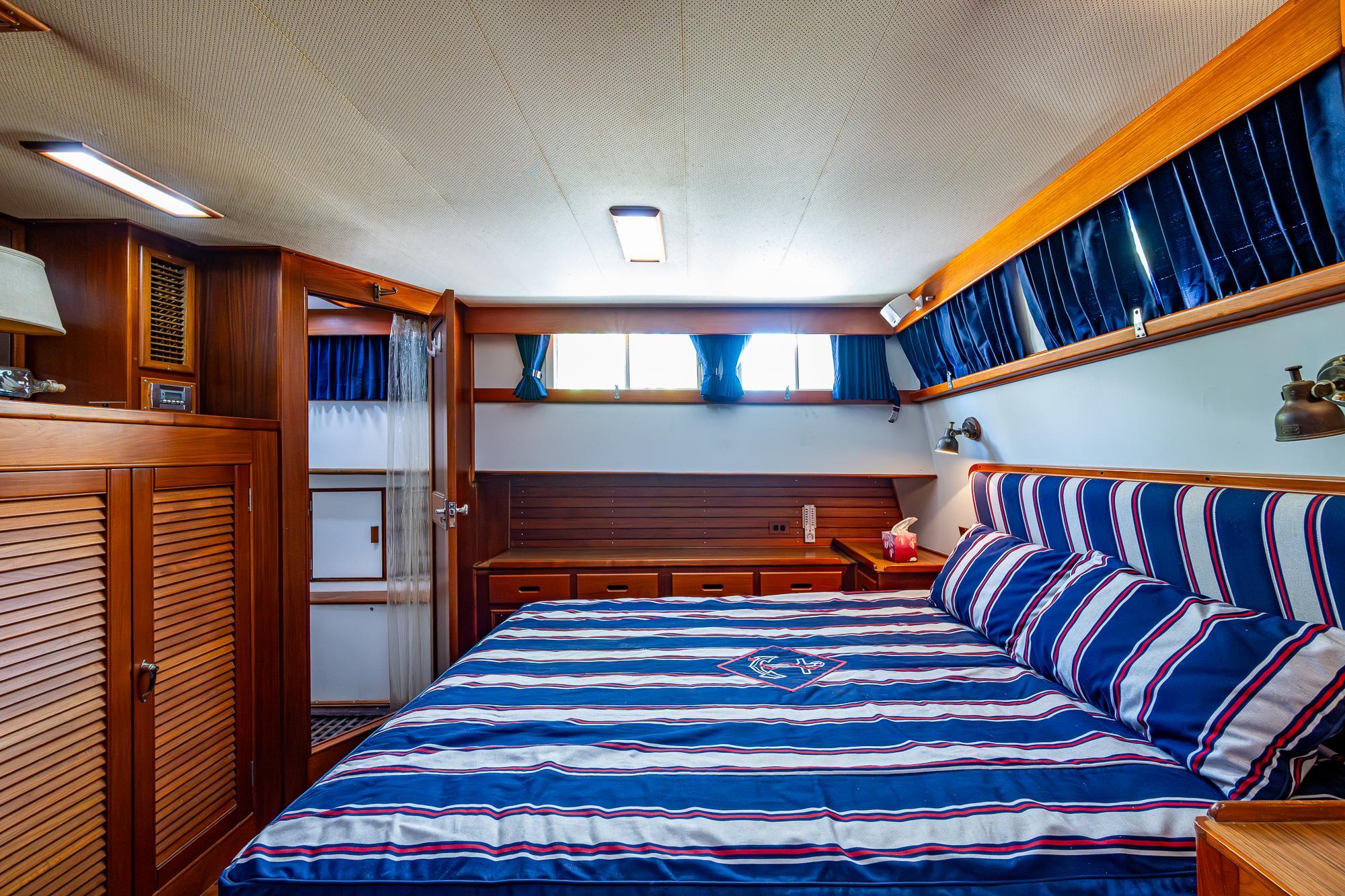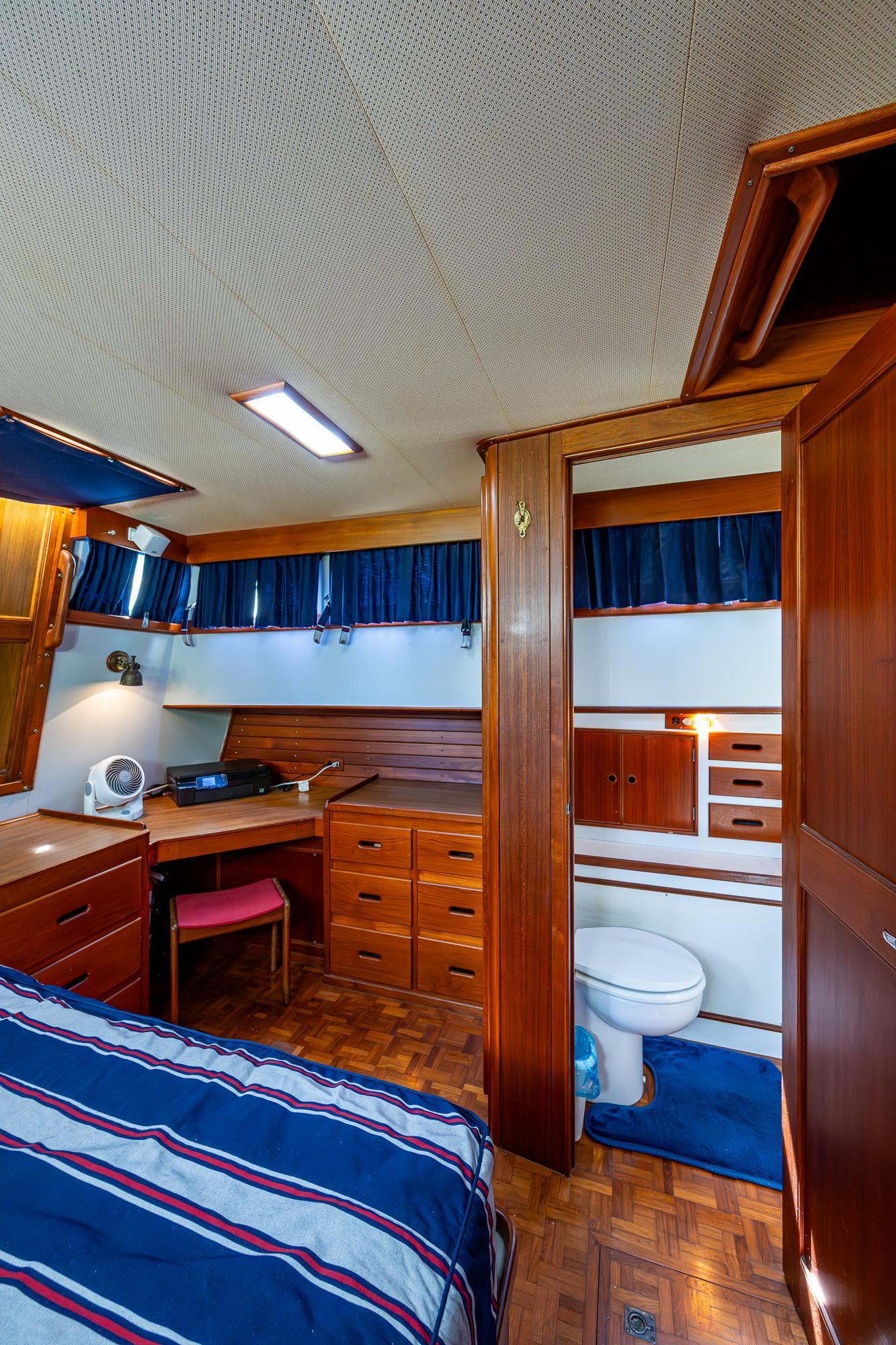 The private aft Master Stateroom features a walkaround queen berth, single berth to port, hanging locker and numerous storage drawers, full length mirror and more. The master head is to port and the separate stall shower to starboard. There are numerous port holes and a hatch that allow for natural light and ventilation when desired. Up two steps is a door to access the aft deck/cockpit.
