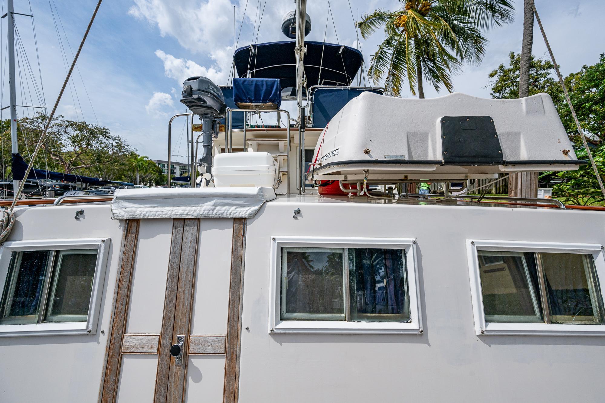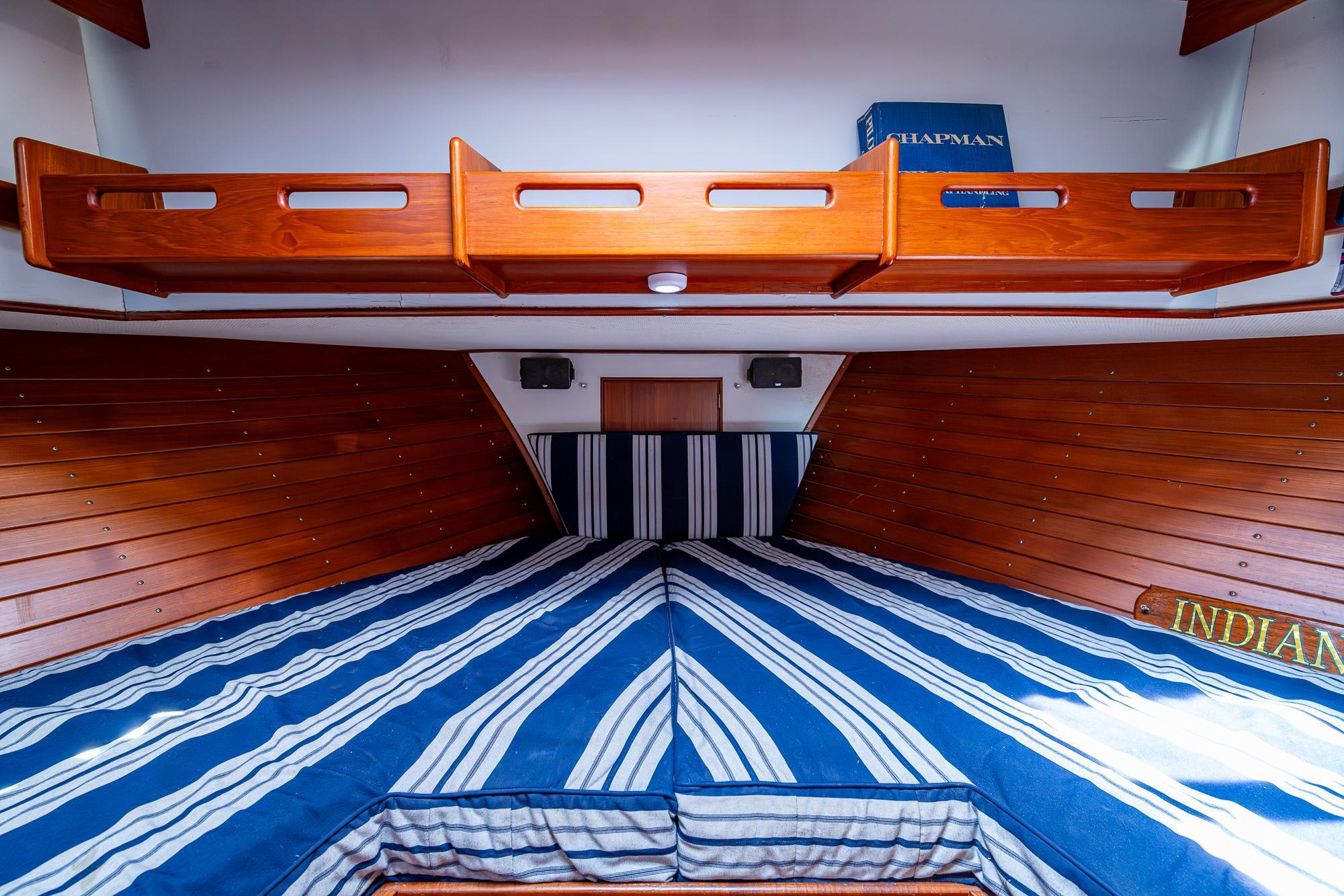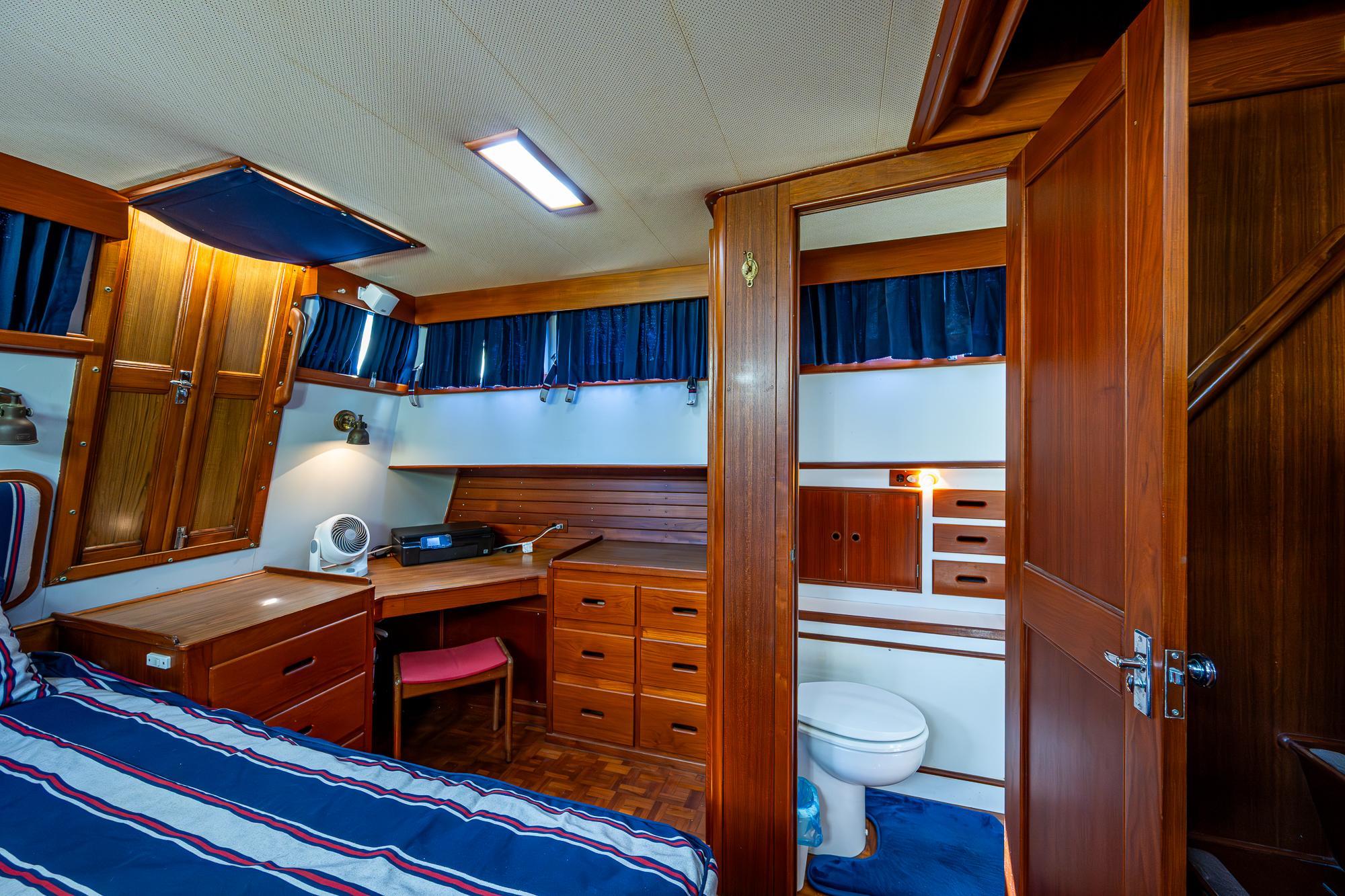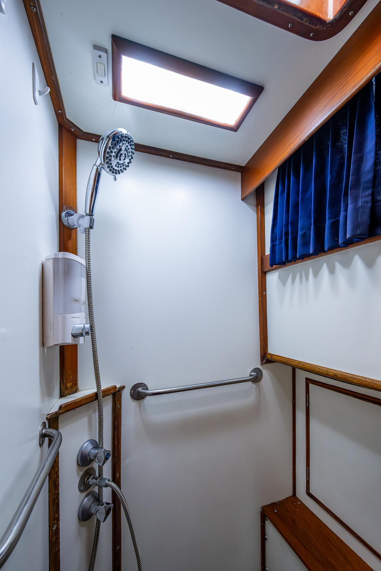 The private aft Master Stateroom features a walkaround queen berth, single berth to port, hanging locker and numerous storage drawers, full length mirror and more. The master head is to port and the separate stall shower to starboard. There are numerous port holes and a hatch that allow for natural light and ventilation when desired. Up two steps is a door to access the aft deck/cockpit.