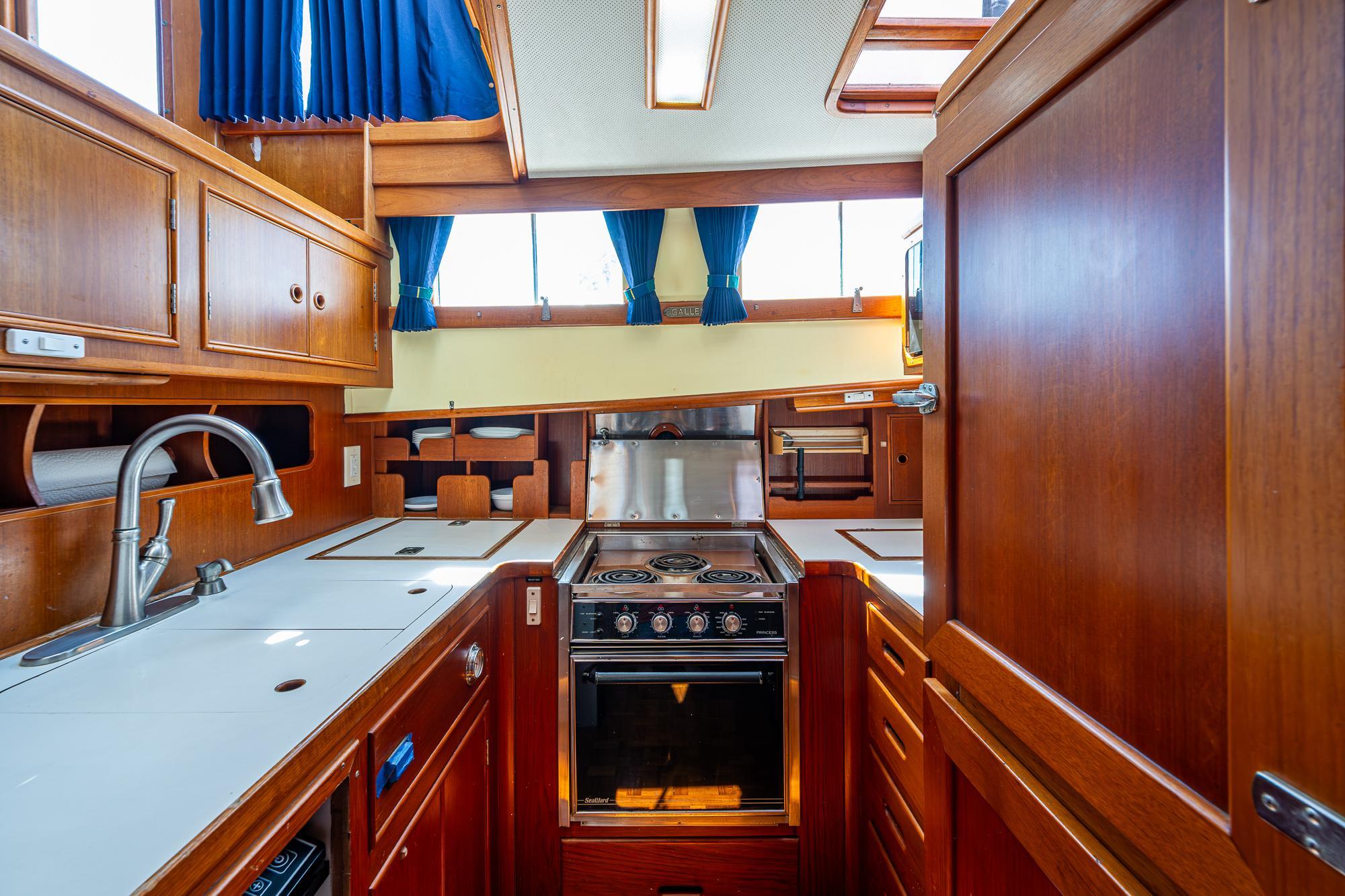 To starboard in the Salon is an L-Settee with teak hi-lo table and a bar cart with drawers and icemaker forward. To port is a teak bookshelf and storage throughout with breakfast bar and stools forward overlooking the open U-shaped galley below. Access the galley down three steps and find a full-size refrigerator, deep freezer, stove/oven, microwave, double bowl sink with faucet with retractable sprayer and plentiful storage compartments.