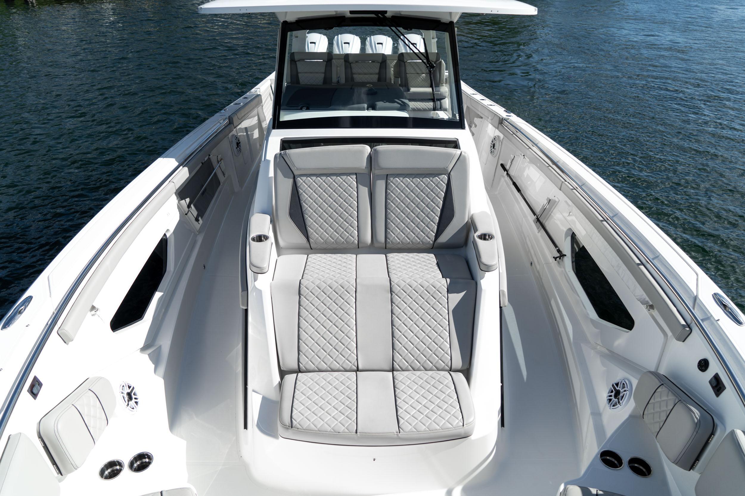 - Molded Forward Bow Seating with Insulated Storage Below, Electric-Actuating Hinged Forward Facing Backrests for Port and Starboard Seats with Clear Passage Forward (removable jump seat)