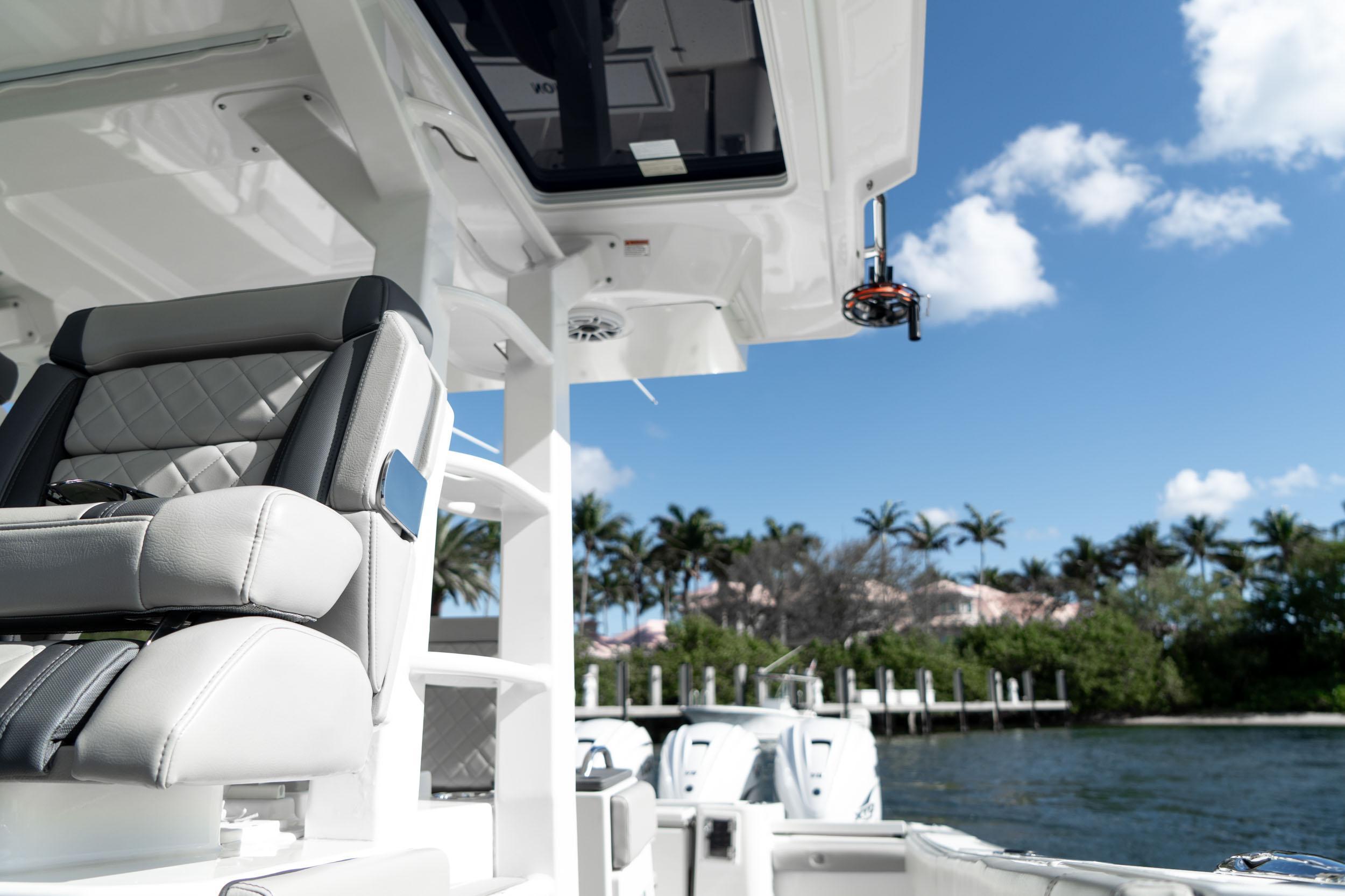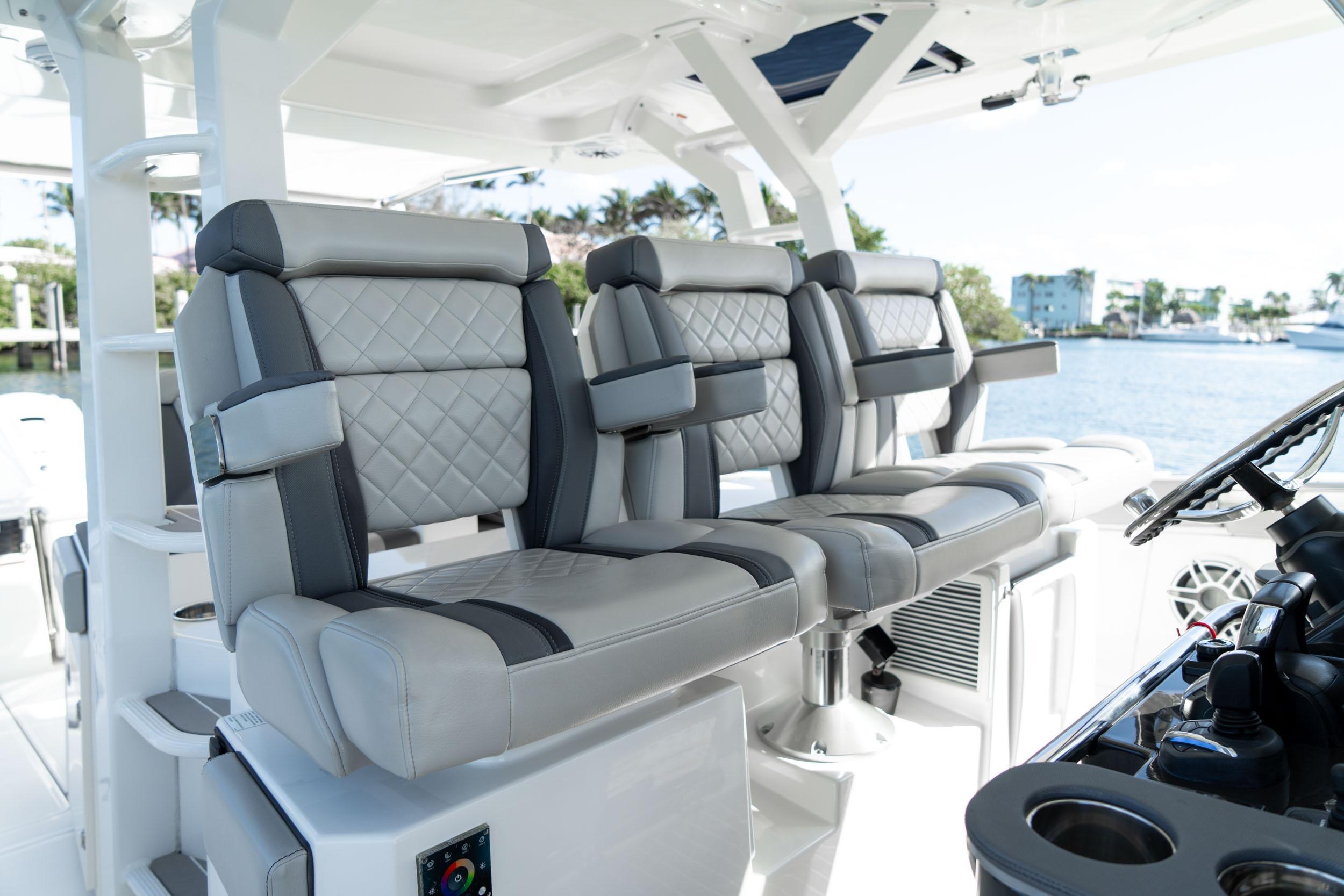 - Pursuit Custom Triple Captain’s Seats with Dedicated Folding Armrests, Three (3) Articulating Flip-Up Bolsters and Lumbar Support, Center Seat has Fore, Aft and Vertical Adjustments