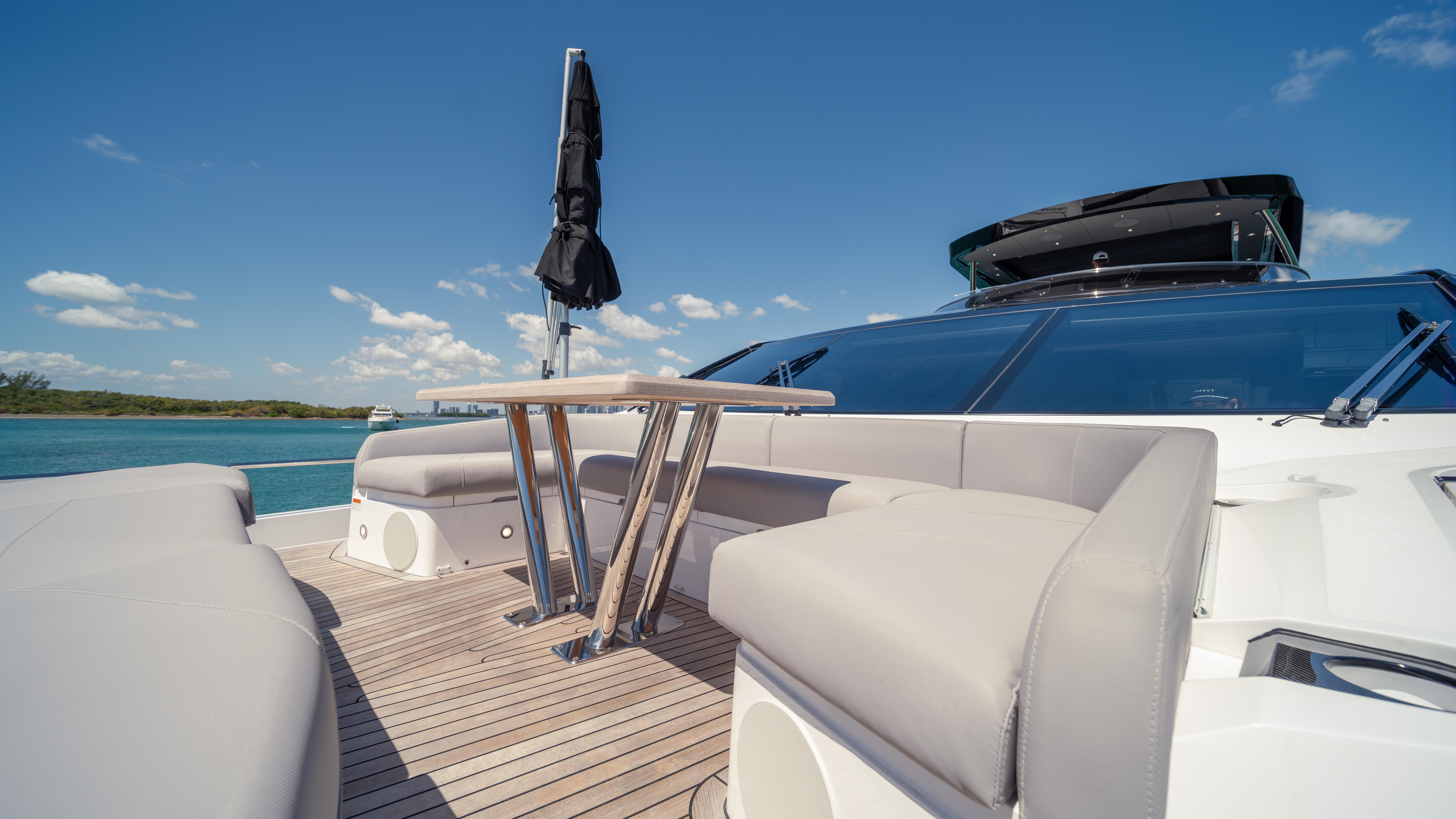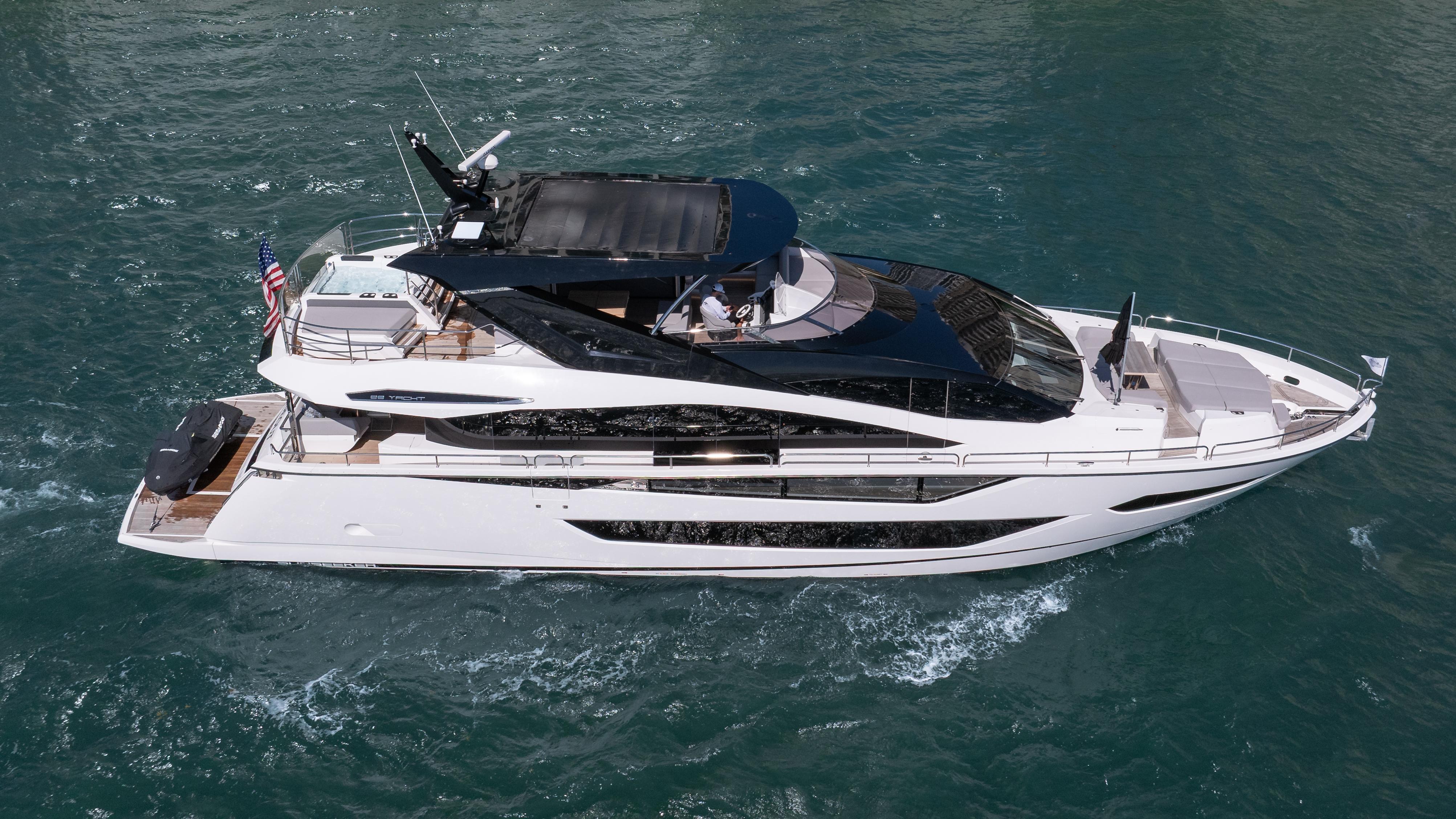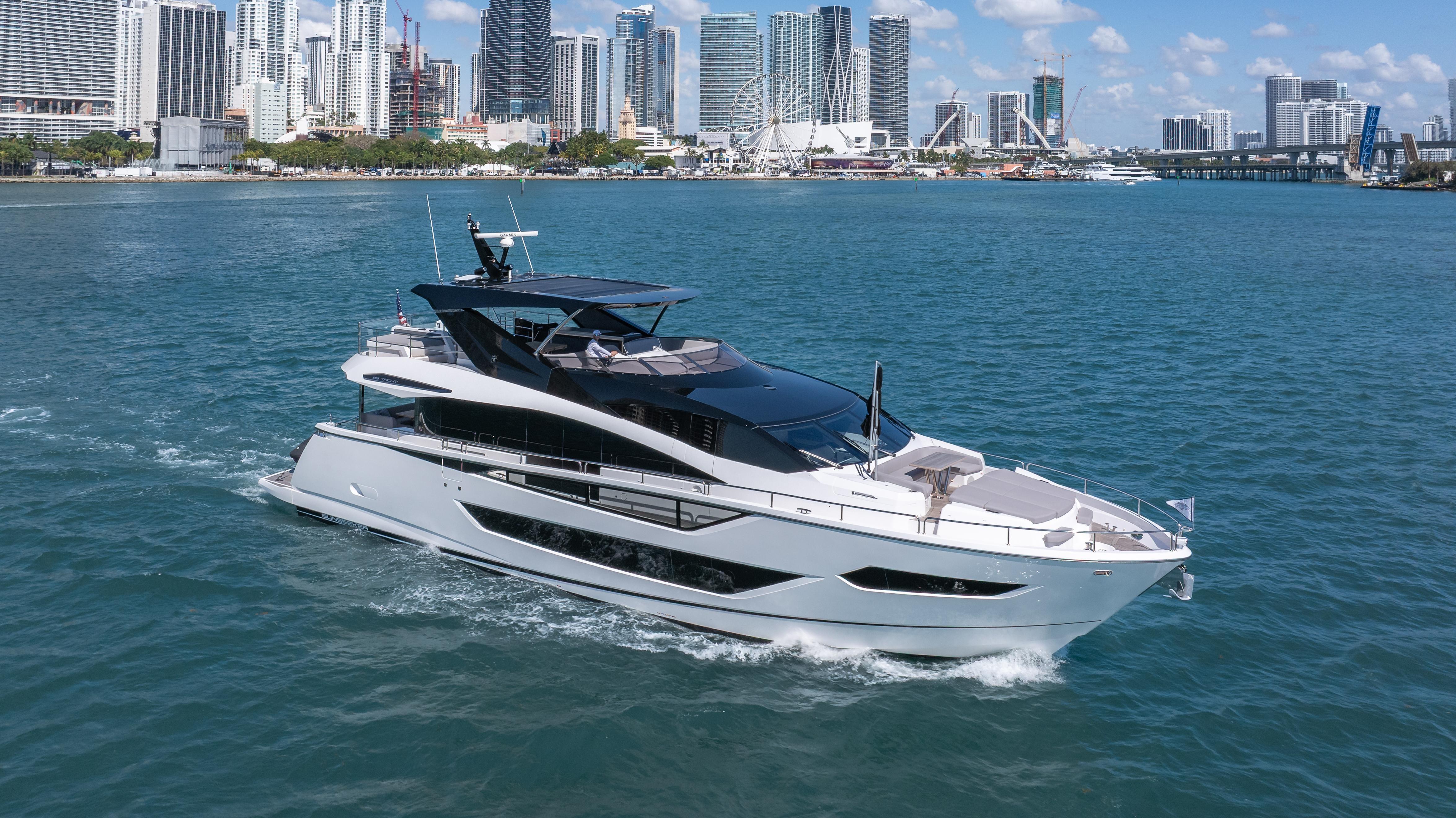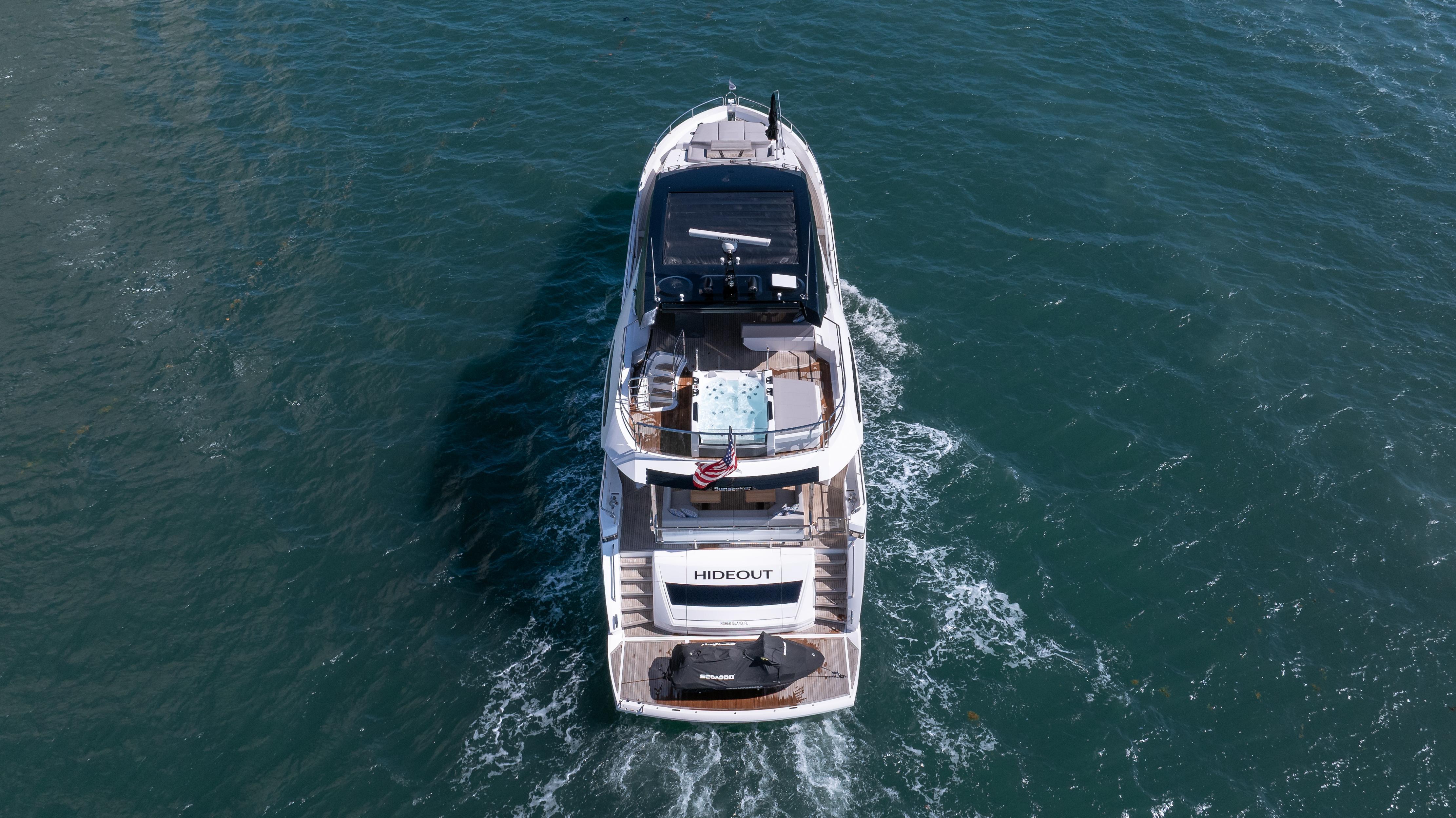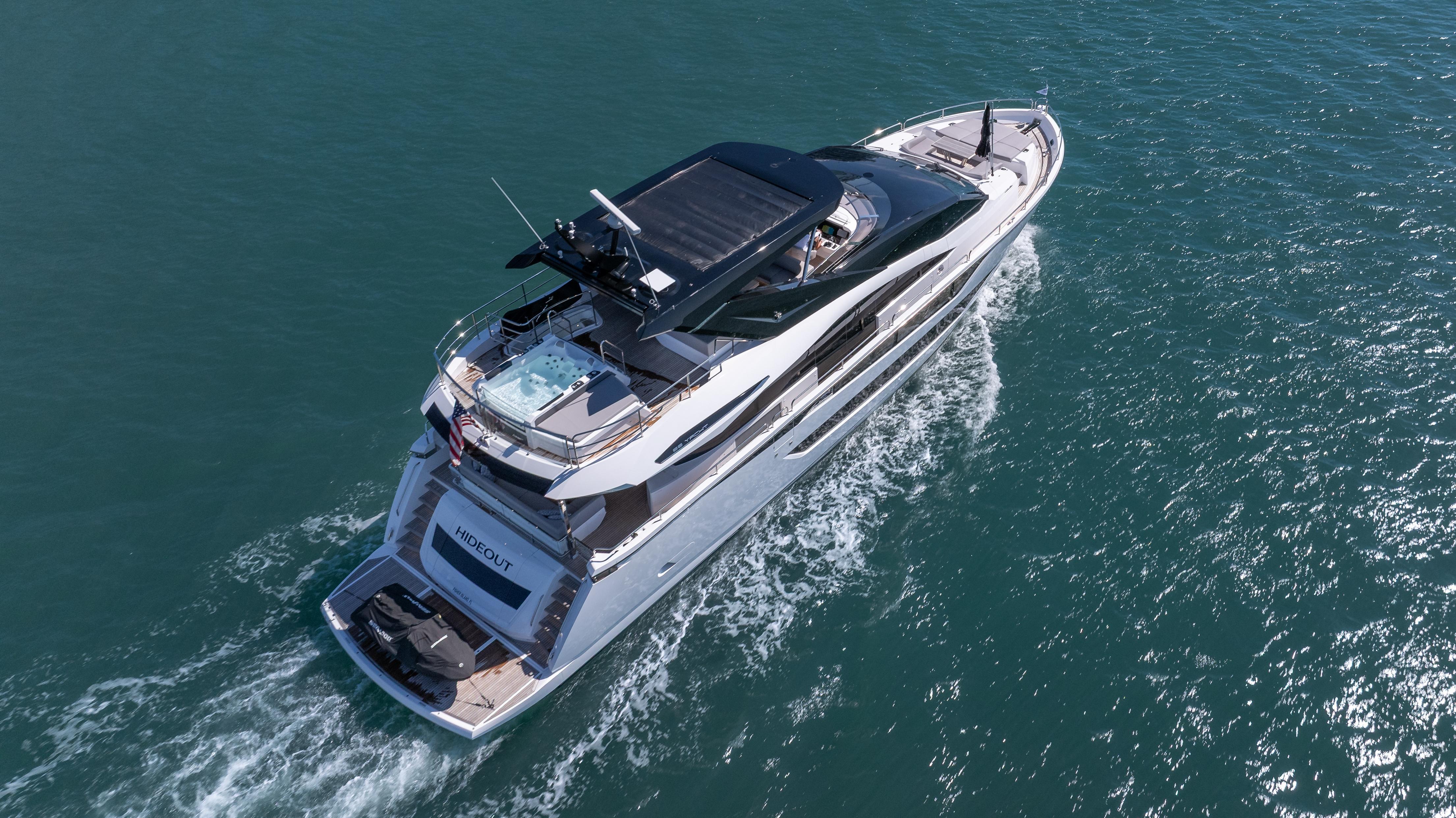 New To Market - HIDEOUT the 2025 Sunseeker 88.Hideout has impressive exterior lines and a sleek hardtop roof with an optional central opening canopy, accommodating eight guests and four crew in complete luxury and comfort. The Yacht features Sunseeker’s industry-leading ‘Beach Club’ accessed by sweeping dual staircases featuring recessed LED lighting. Set beneath is an overhead rain shower and plentiful stowage, including dedicated lockers for two SeaBobs. The extended bathing platform is perfect for carrying a tender with an optional flybridge crane for a jet ski or similar.The vast flybridge on the 88 Yacht enjoys a superb layout with beautifully appointed furniture on a spacious aft deck and the option of an infinity spa bath with a sun pad. It’s a brilliant space for entertaining with ample places to sit and relax thanks to companion seating adjacent to the helm and extended U-shaped seating opposite a feature wet bar with ice maker, grill and two fridges or optional drawer-refrigeration. There is also the option for fixed stools to turn this into a social bar area. The spacious foredeck features another private, social space with a Portuguese bridge, a large sunbathing area and comfortable lounge seating complemented by premium side decks as standard. The main deck is nothing short of spectacular. Inside, there is a large forward galley that maximizes an open-plan entertainment space. Owners and crew can enjoy making use of ample practical storage space, as well as a dedicated fixed breakfast bar unit with two stools, creating an additional informal dining area. The galley has a full-height premium fridge freezer and dishwasher as standard with space for wine coolers.There is also the ability to fully close off the galley, allowing the crew to move around the yacht unnoticed with access from the lower helm on the starboard side that gives owners the chance to enjoy complete privacy. The interior exudes luxury and has clever design cues throughout that make the yacht stand out, including diagonal stainless detailing on cabinetry and doors. The layering of textural elements and the mix of furnishings and fabrics feels timeless with a modern twist with a range of colors and finishes available. Sunseeker has located the grand master stateroom central to the yacht, making the most of her substantial beam to maximize this private space. The master stateroom, with its 55” TV as standard, enjoys a spacious dressing area with a double wardrobe and adjacent in the en suite featuring exquisite surfaces throughout are double sinks, an overhead rain shower, and plentiful stowage.