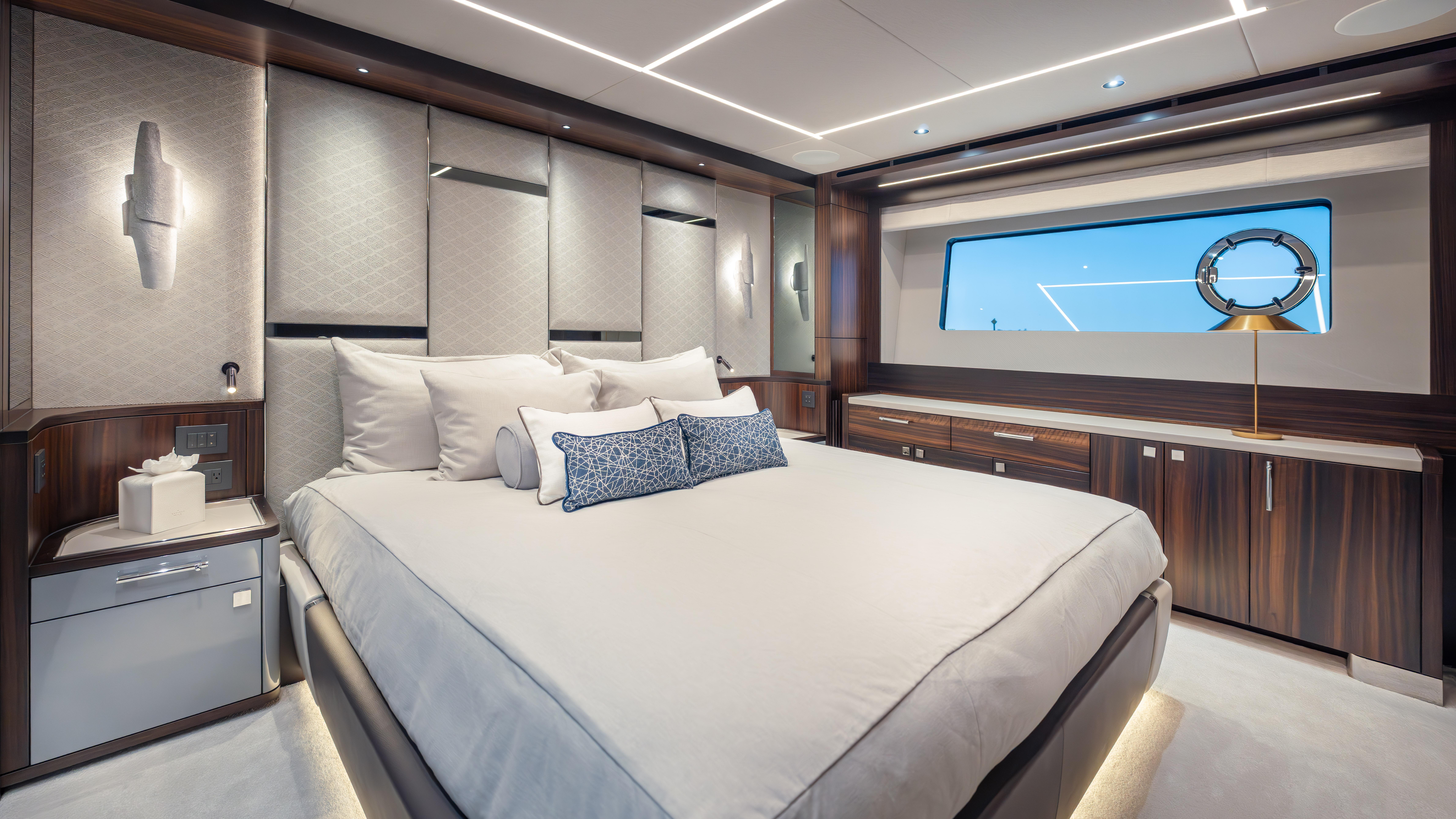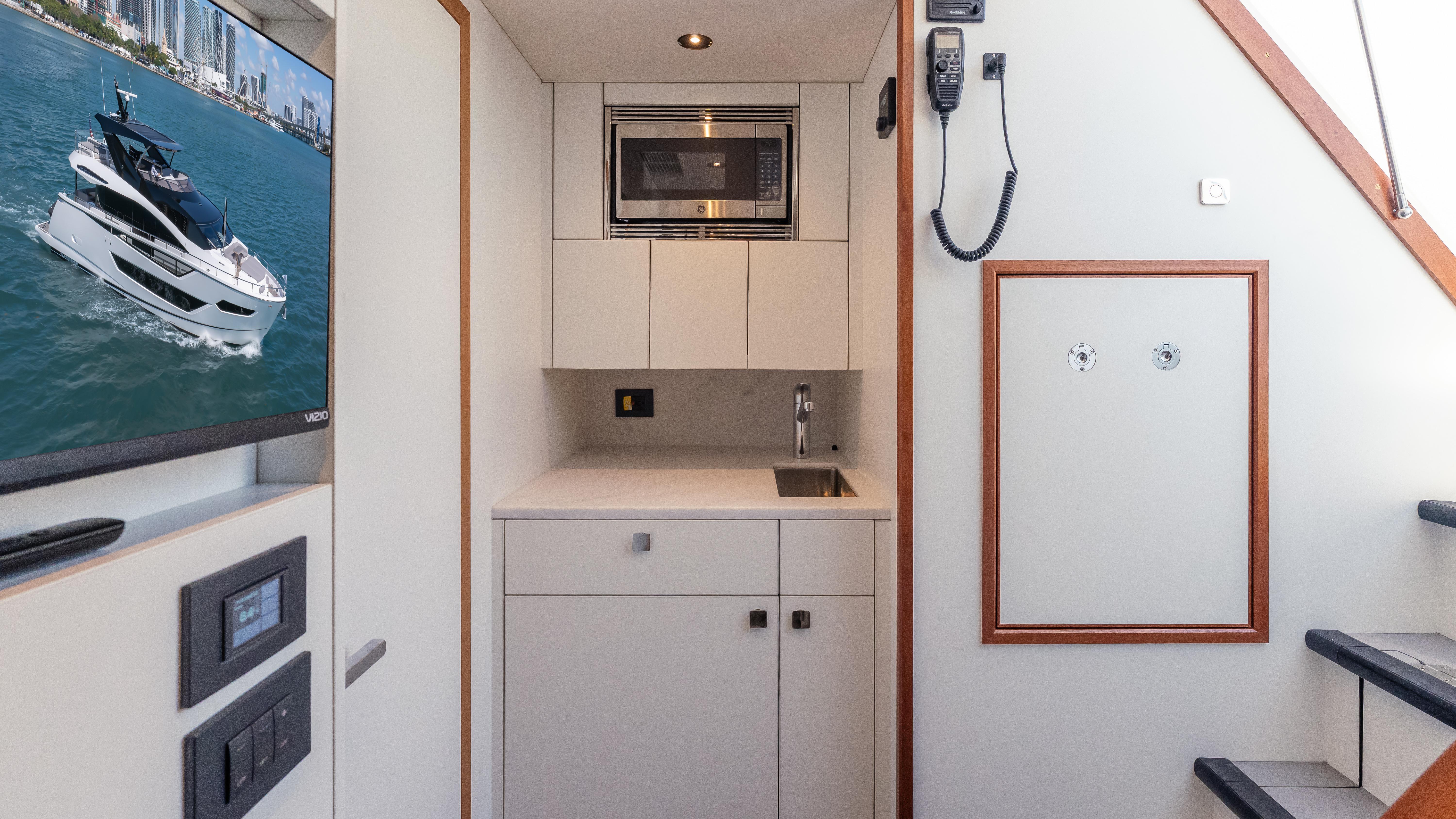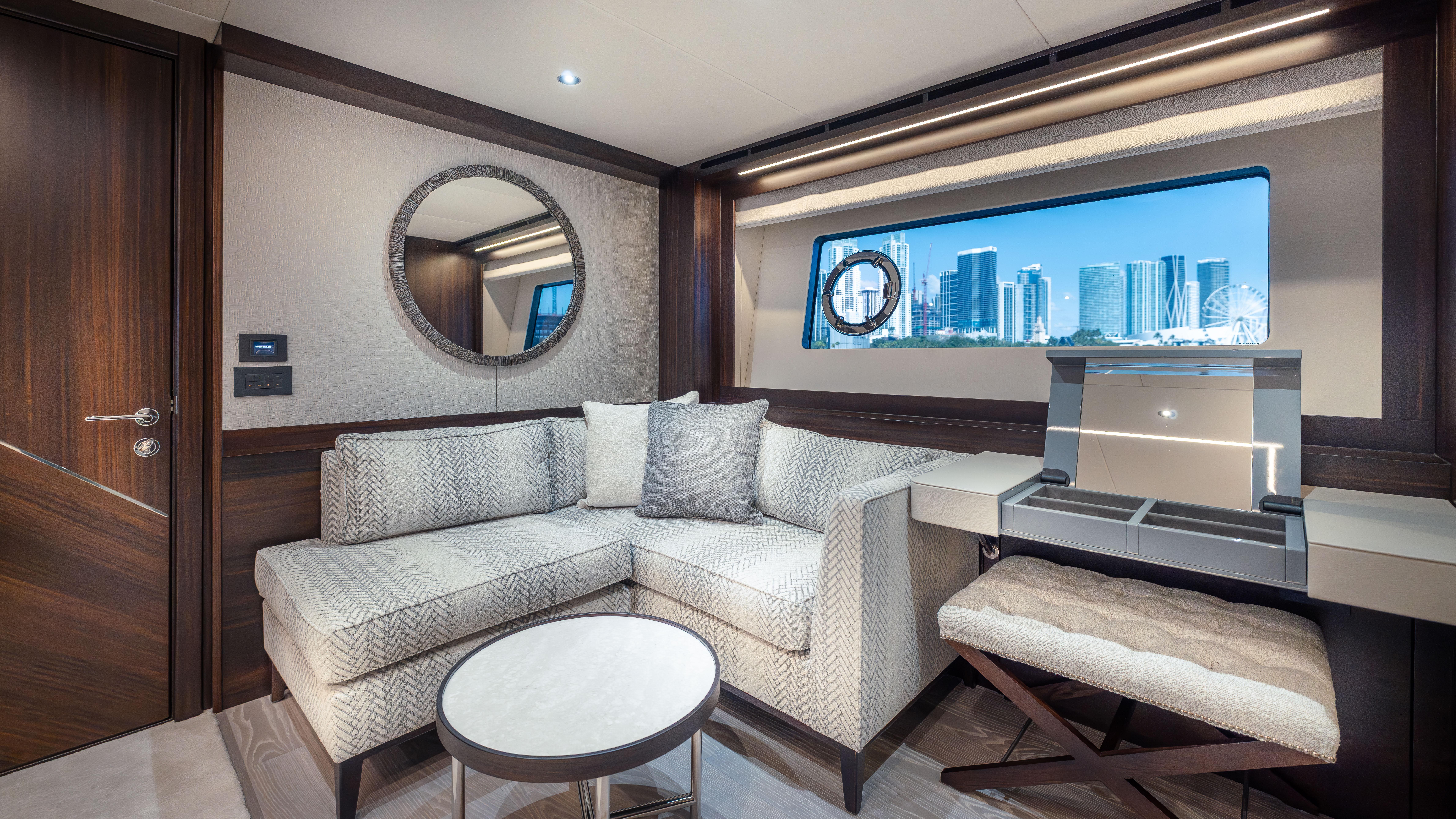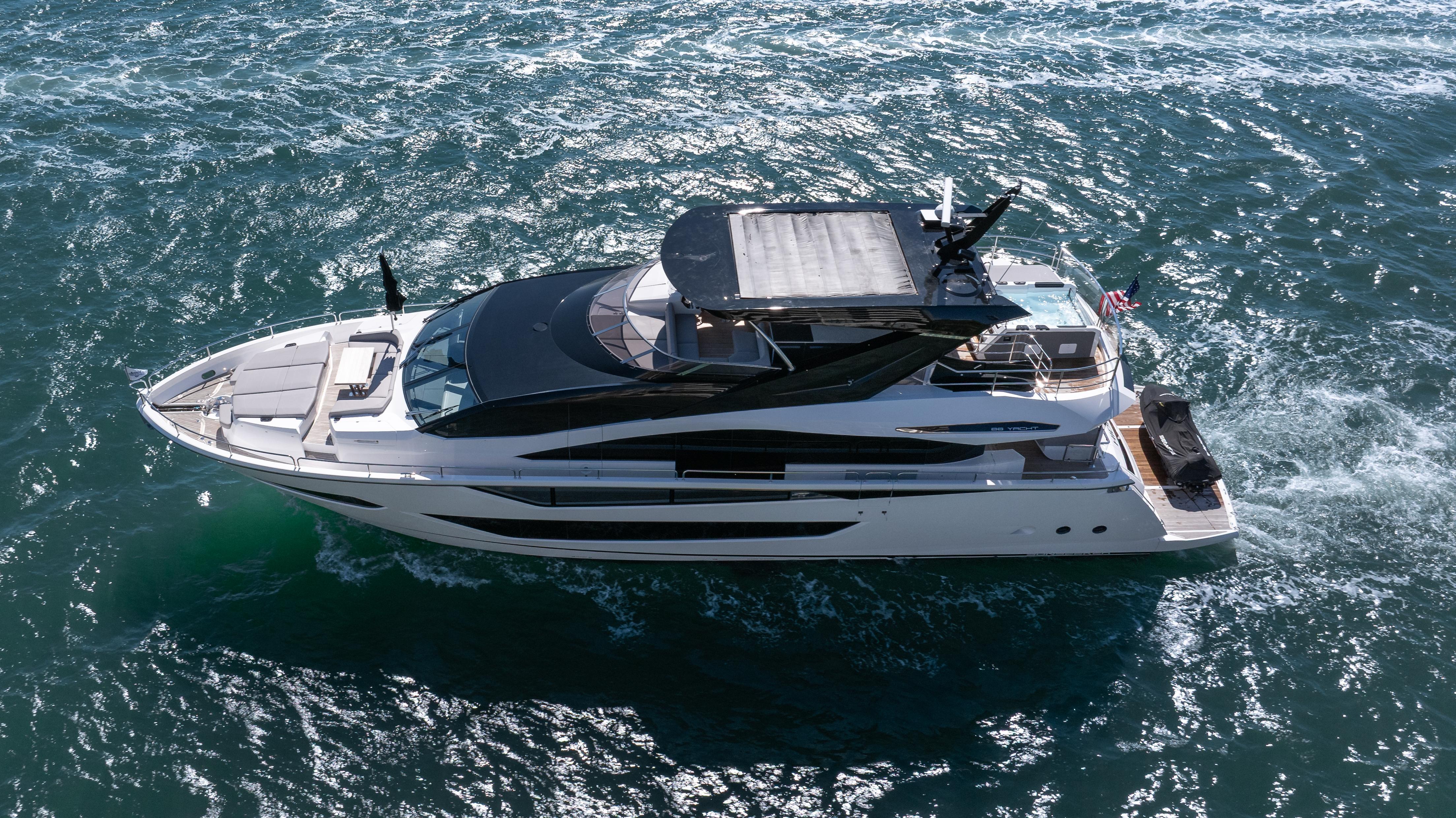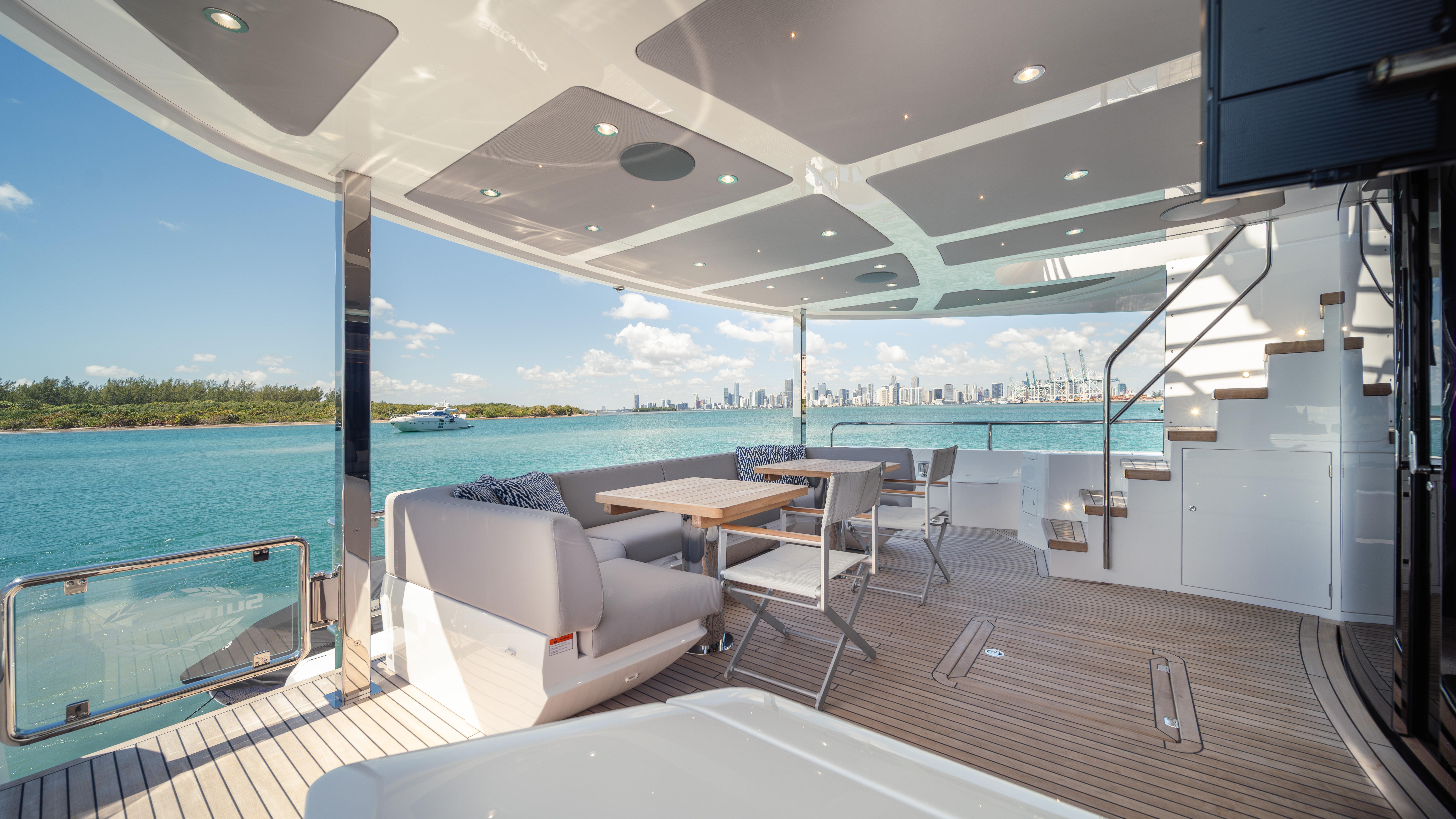 New To Market - HIDEOUT the 2025 Sunseeker 88.Hideout has impressive exterior lines and a sleek hardtop roof with an optional central opening canopy, accommodating eight guests and four crew in complete luxury and comfort. The Yacht features Sunseeker’s industry-leading ‘Beach Club’ accessed by sweeping dual staircases featuring recessed LED lighting. Set beneath is an overhead rain shower and plentiful stowage, including dedicated lockers for two SeaBobs. The extended bathing platform is perfect for carrying a tender with an optional flybridge crane for a jet ski or similar.The vast flybridge on the 88 Yacht enjoys a superb layout with beautifully appointed furniture on a spacious aft deck and the option of an infinity spa bath with a sun pad. It’s a brilliant space for entertaining with ample places to sit and relax thanks to companion seating adjacent to the helm and extended U-shaped seating opposite a feature wet bar with ice maker, grill and two fridges or optional drawer-refrigeration. There is also the option for fixed stools to turn this into a social bar area. The spacious foredeck features another private, social space with a Portuguese bridge, a large sunbathing area and comfortable lounge seating complemented by premium side decks as standard. The main deck is nothing short of spectacular. Inside, there is a large forward galley that maximizes an open-plan entertainment space. Owners and crew can enjoy making use of ample practical storage space, as well as a dedicated fixed breakfast bar unit with two stools, creating an additional informal dining area. The galley has a full-height premium fridge freezer and dishwasher as standard with space for wine coolers.There is also the ability to fully close off the galley, allowing the crew to move around the yacht unnoticed with access from the lower helm on the starboard side that gives owners the chance to enjoy complete privacy. The interior exudes luxury and has clever design cues throughout that make the yacht stand out, including diagonal stainless detailing on cabinetry and doors. The layering of textural elements and the mix of furnishings and fabrics feels timeless with a modern twist with a range of colors and finishes available. Sunseeker has located the grand master stateroom central to the yacht, making the most of her substantial beam to maximize this private space. The master stateroom, with its 55” TV as standard, enjoys a spacious dressing area with a double wardrobe and adjacent in the en suite featuring exquisite surfaces throughout are double sinks, an overhead rain shower, and plentiful stowage.