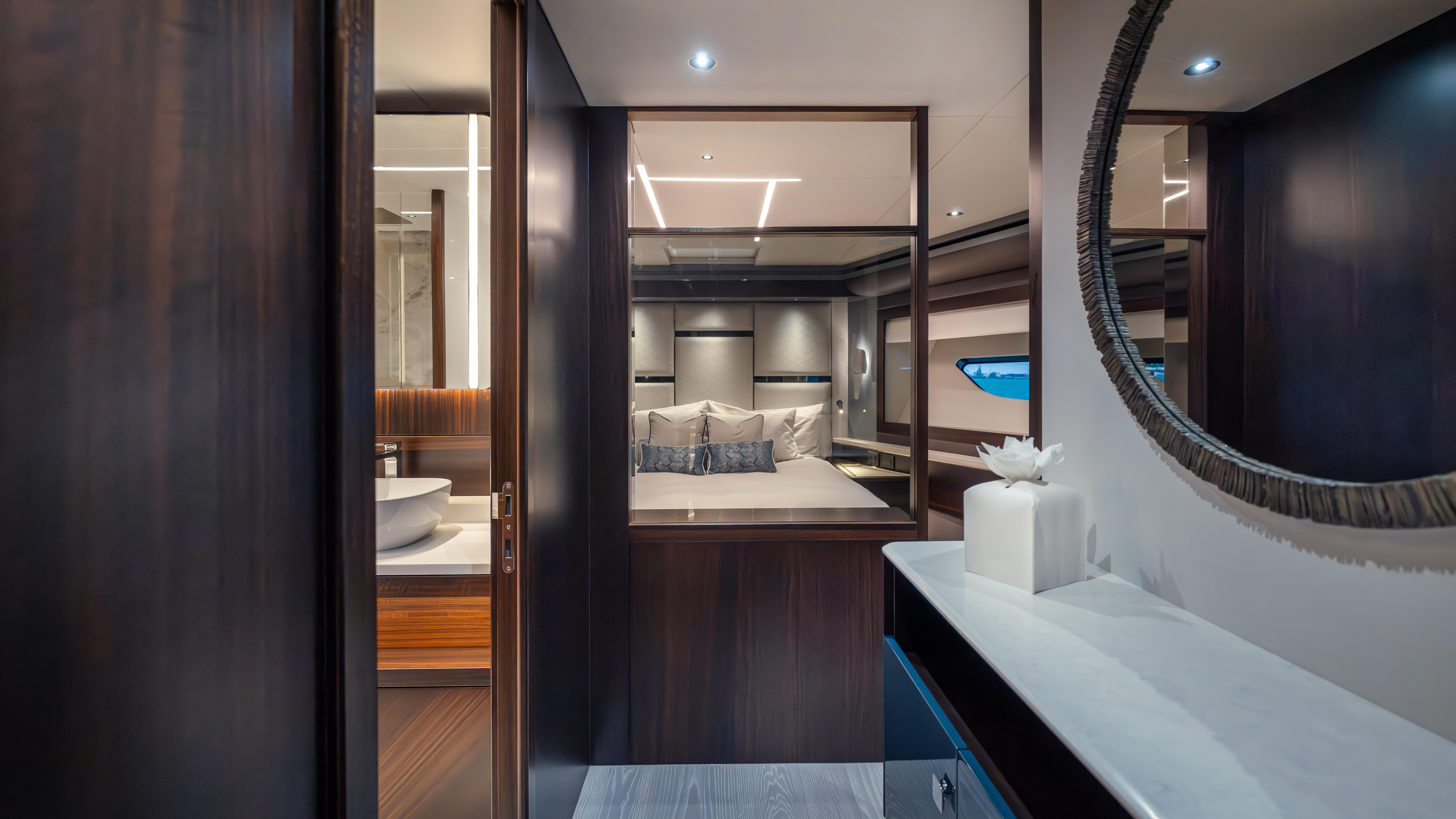 vanity and into the wardrobe space. Rest of cabin around the bed